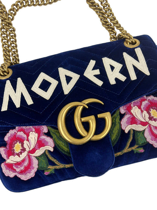 Gucci Blue Velvet Embroidered GG Modern Marmont Shoulder Bag