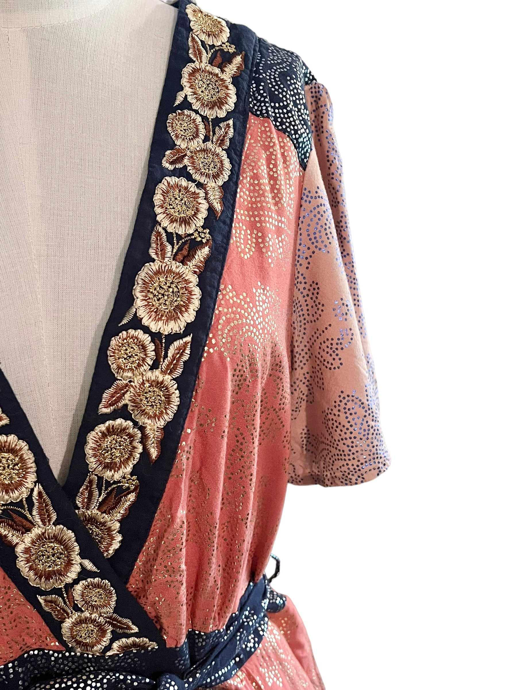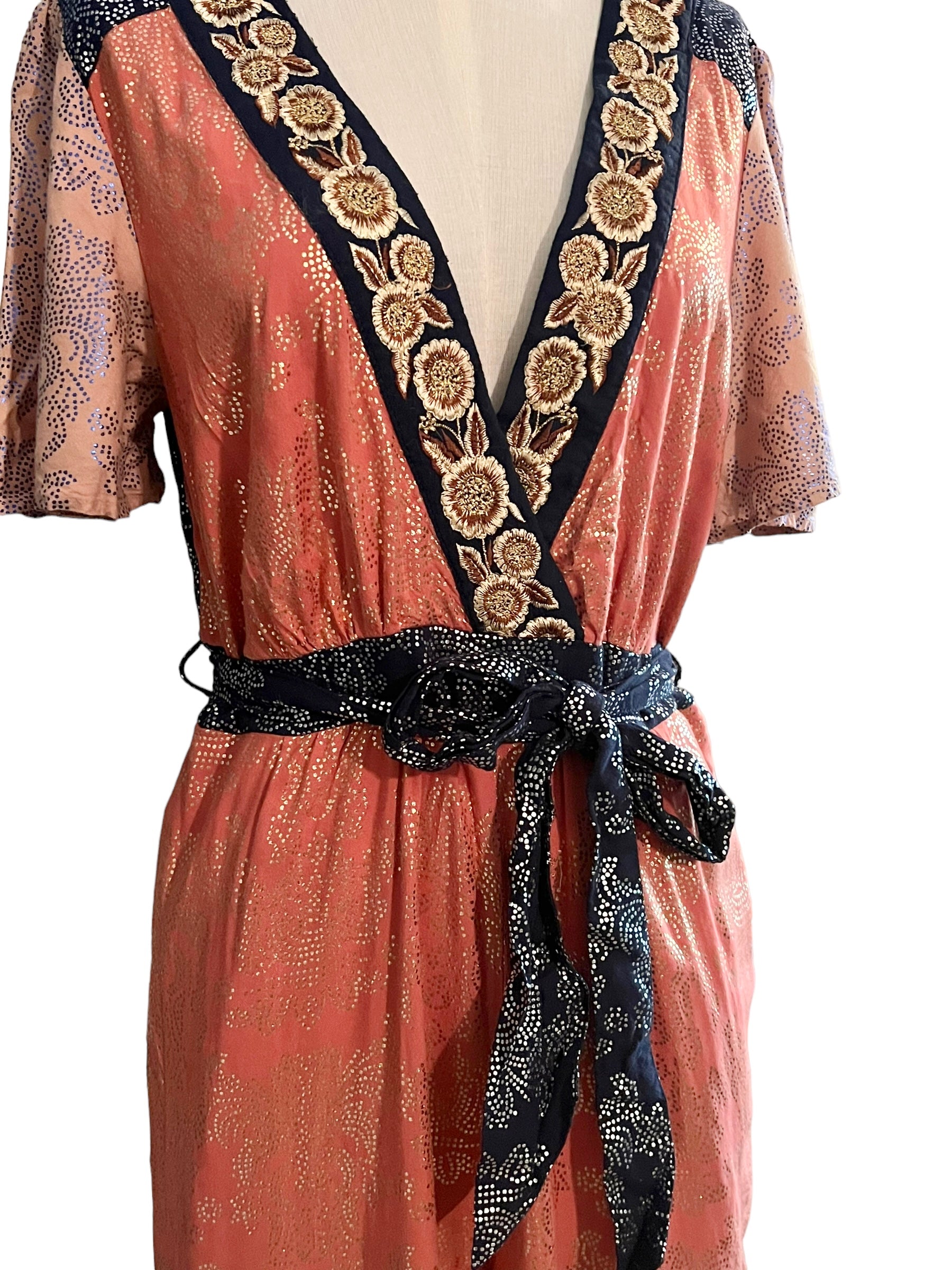Tri-color metallic 'Sofia' jumpsuit with embroidered detail and tie waist.