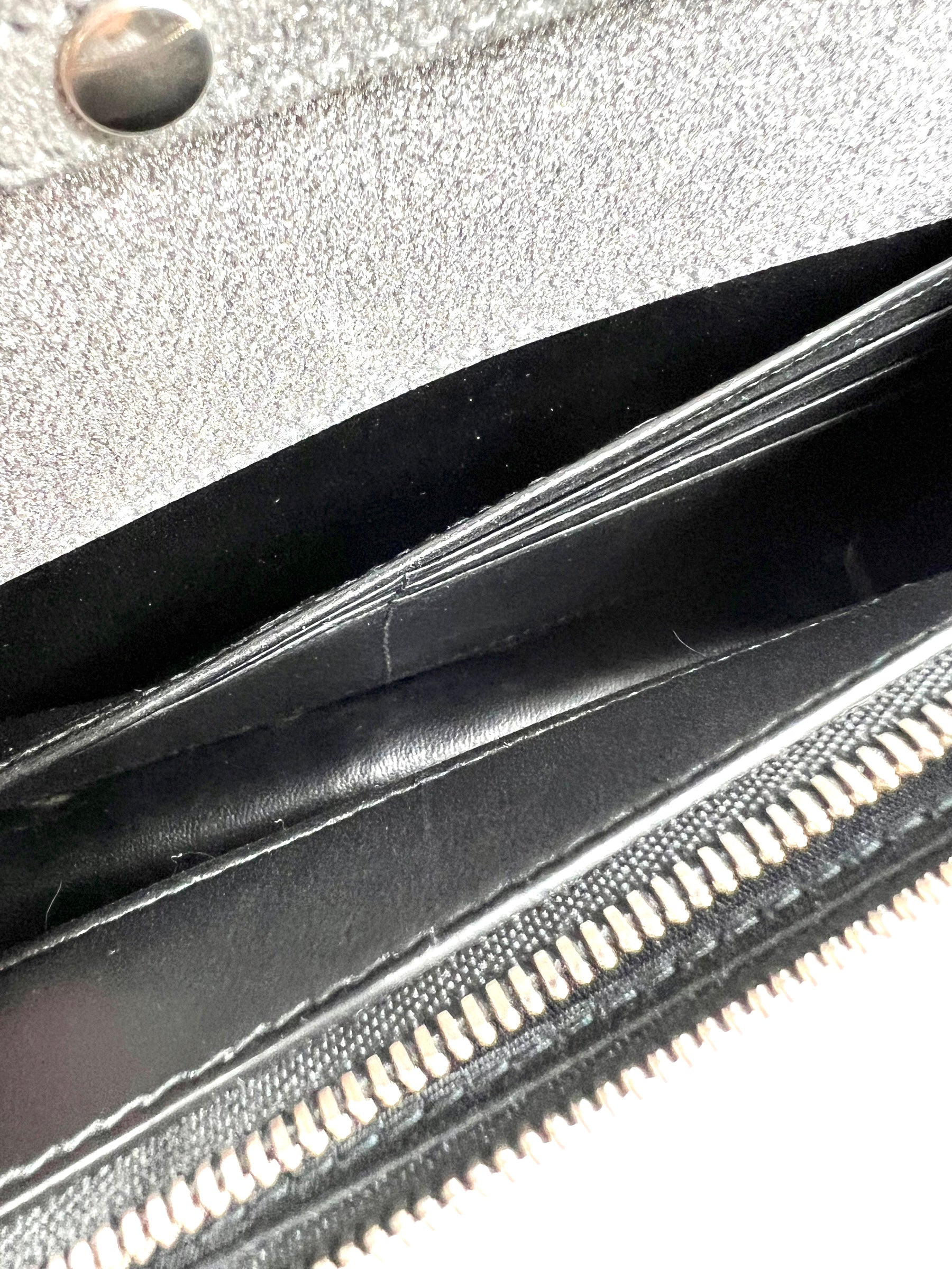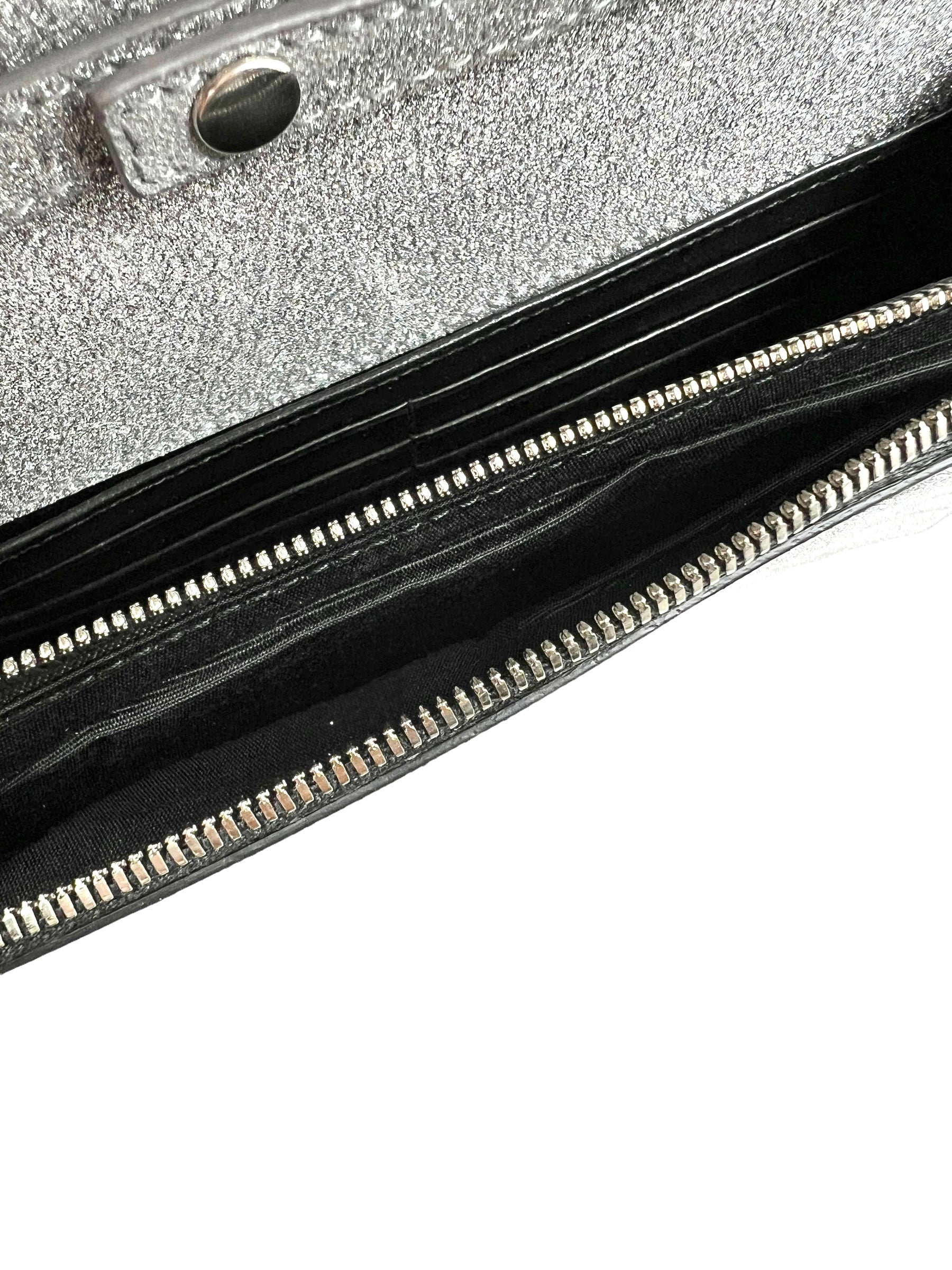 Silver leather Bb Chain Wallet Glitter bag with embroidered logo detail, silver hardware and detachable chain strap. Features interior zip pocket, six card slots and one slip pocket. Comes with dust bag and box.