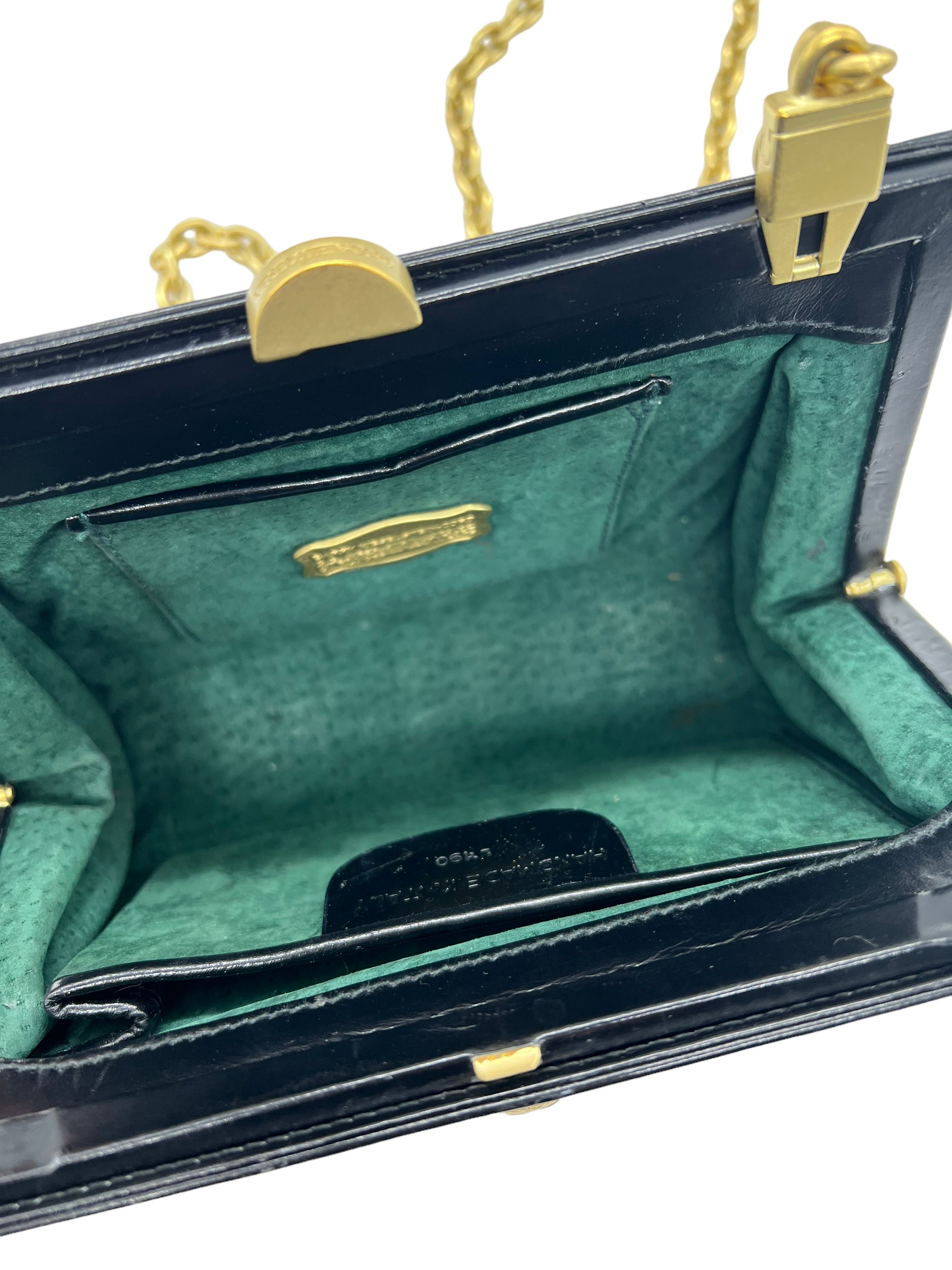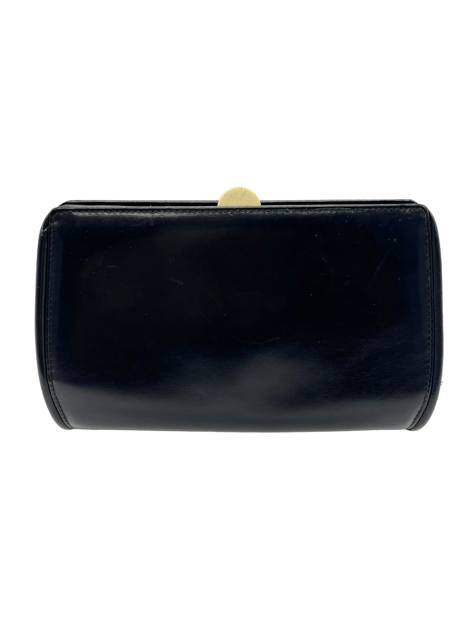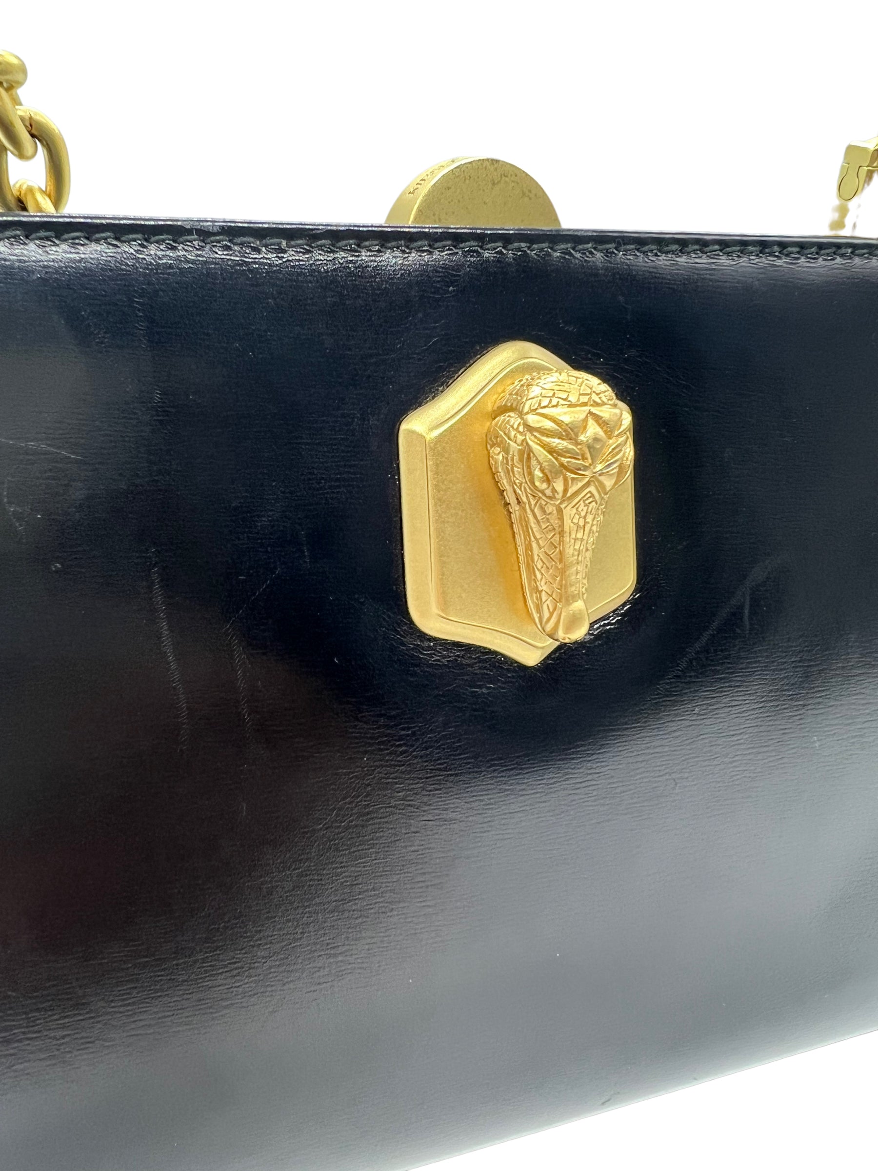 Black smooth leather chain shoulder bag/clutch with alligator head detail. Features gold hardware and kiss lock closure. Does not come with dust bag or box.