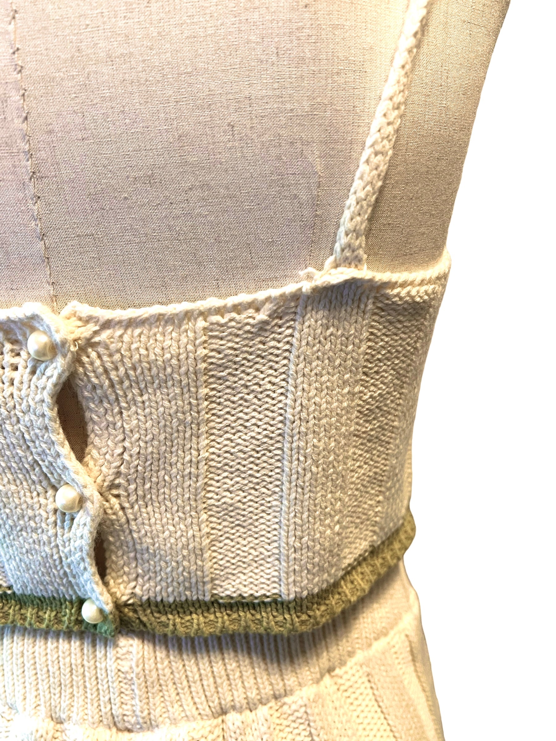 Cream ribbed knit pants with matching crop tank with green trim and faux pearl button details.
