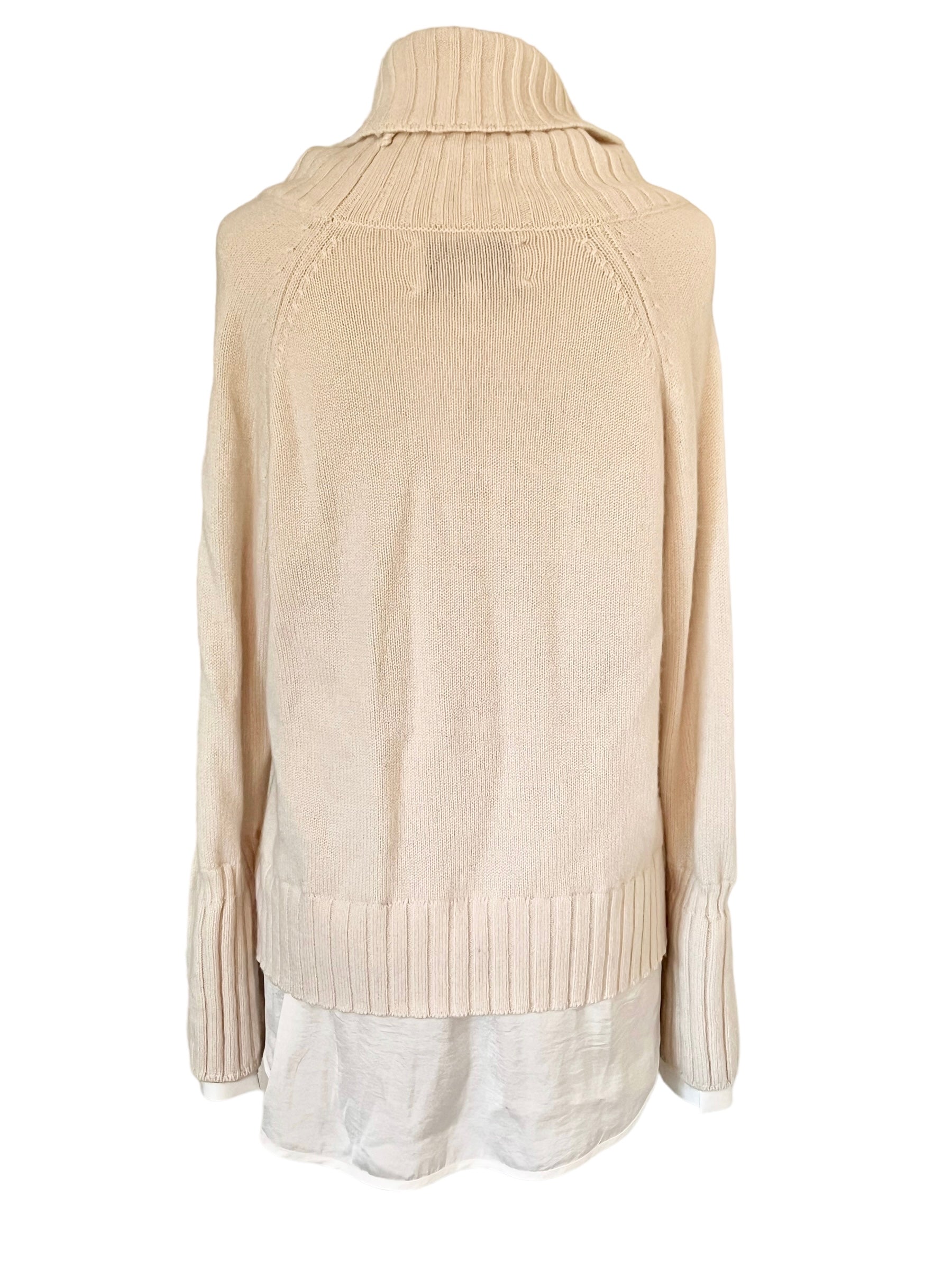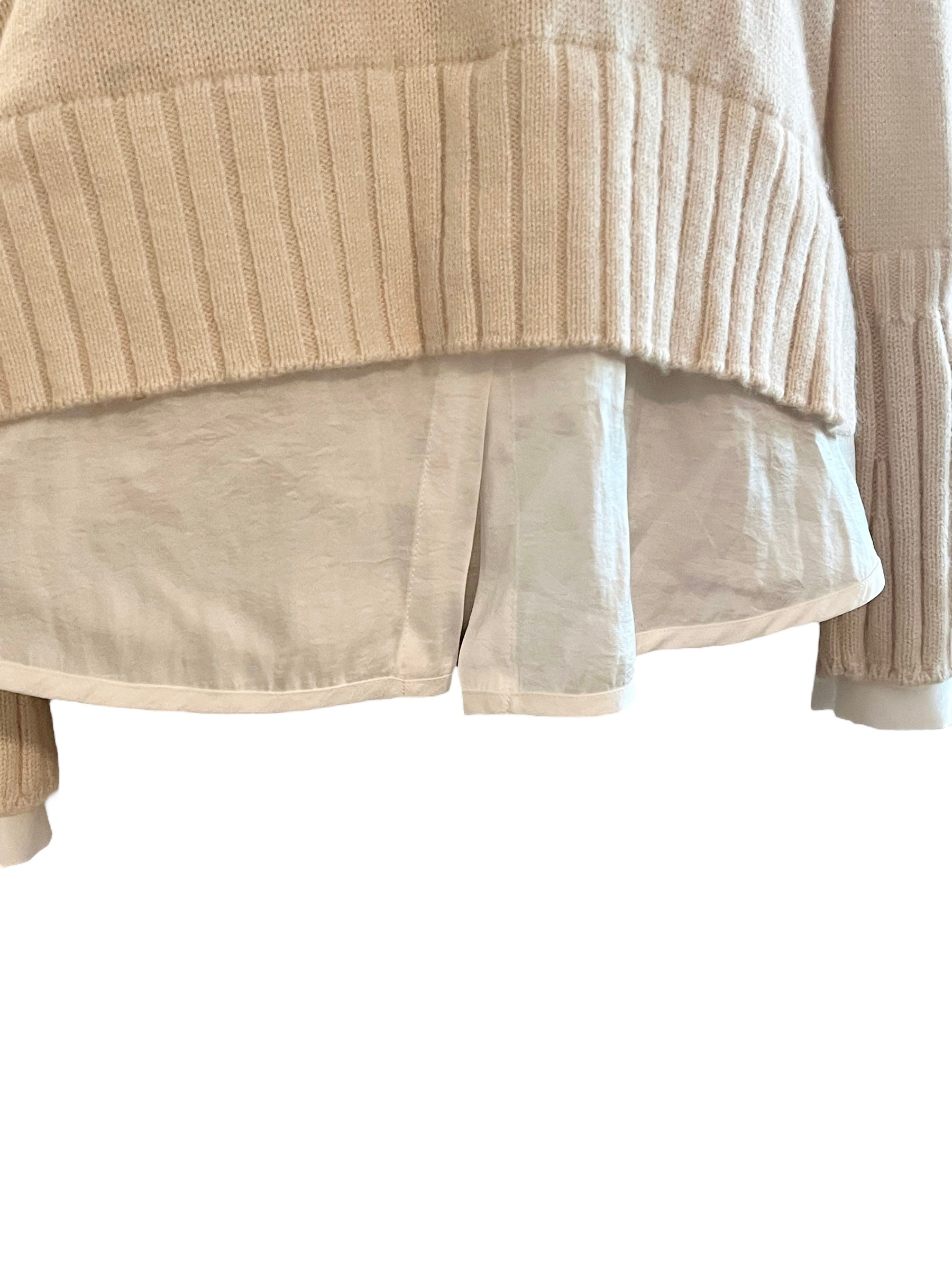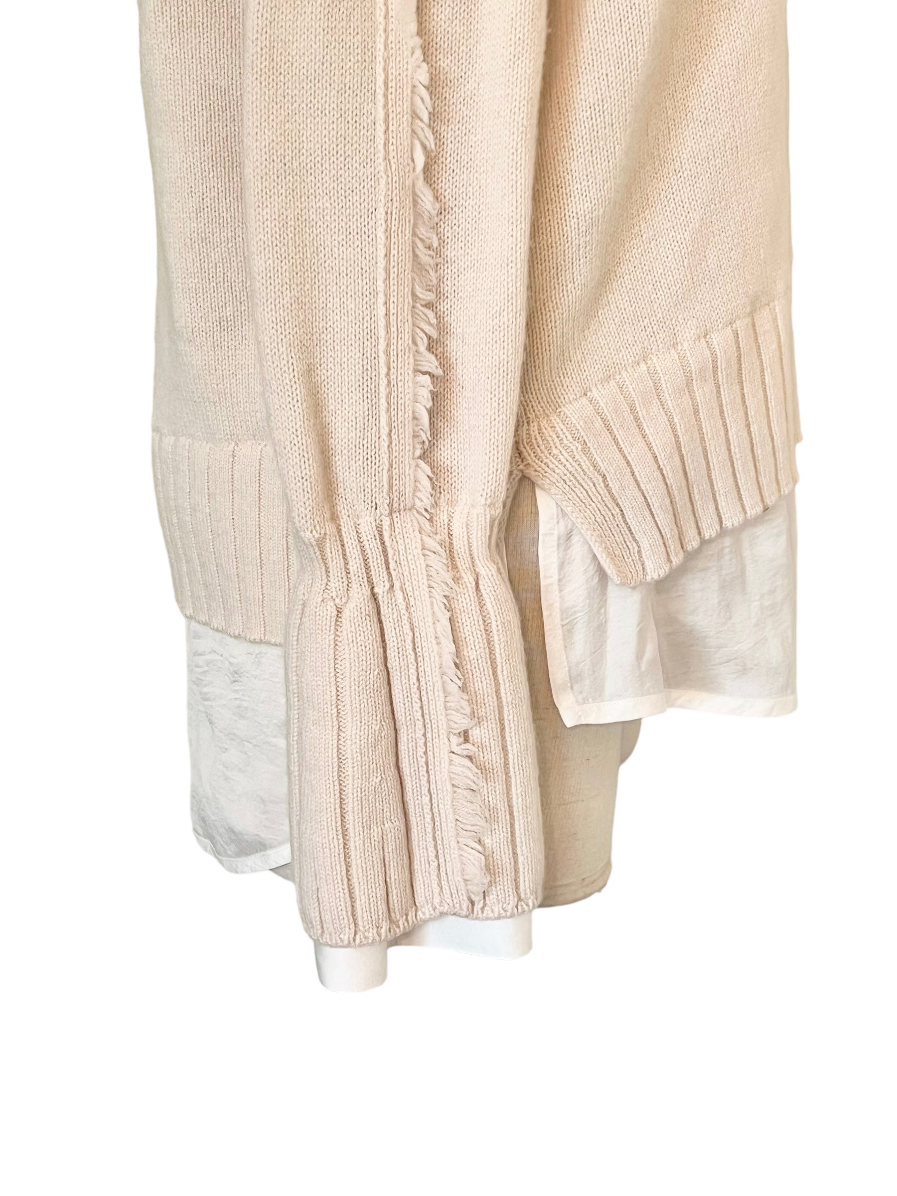 Cream cashmere blend sweater with fringe trim and partial white satin underlay at the hem and cuffs. Care tag has been removed.