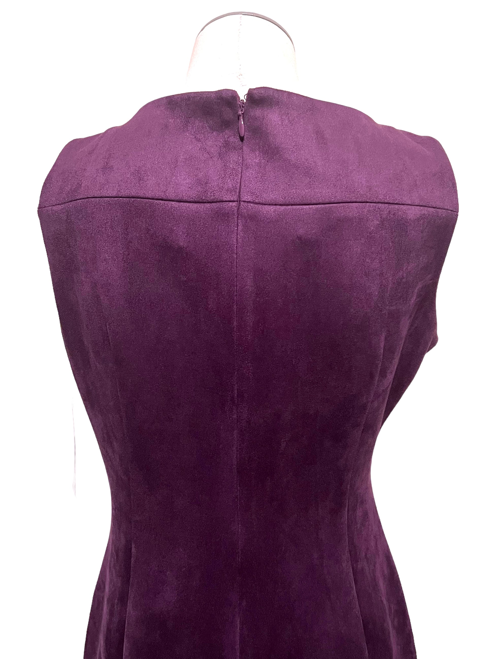 Purple suede shift dress with side pleat detail. Features back zip closure.