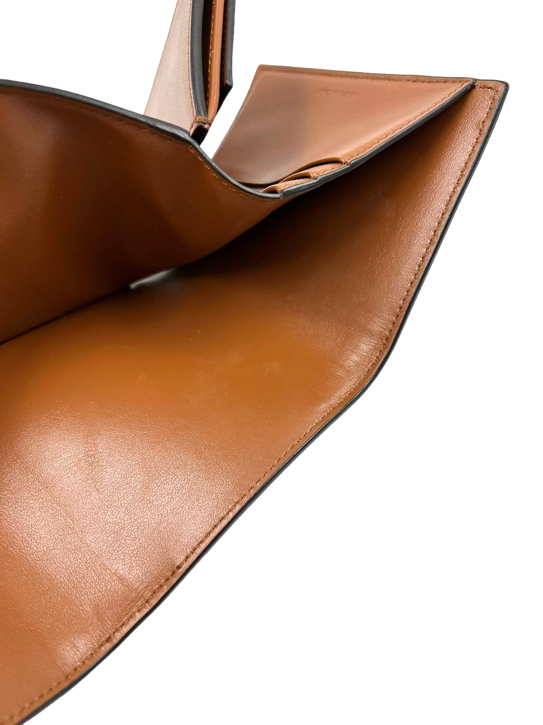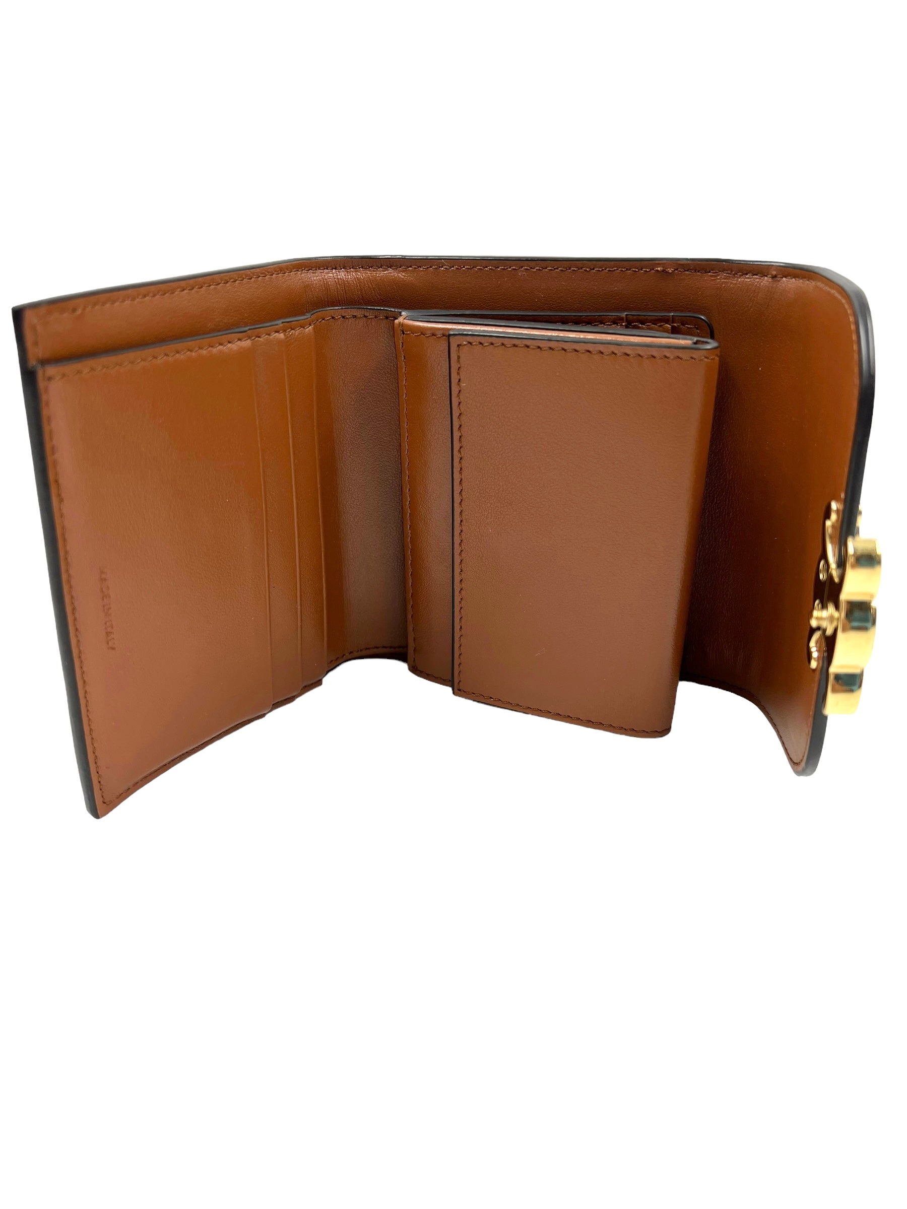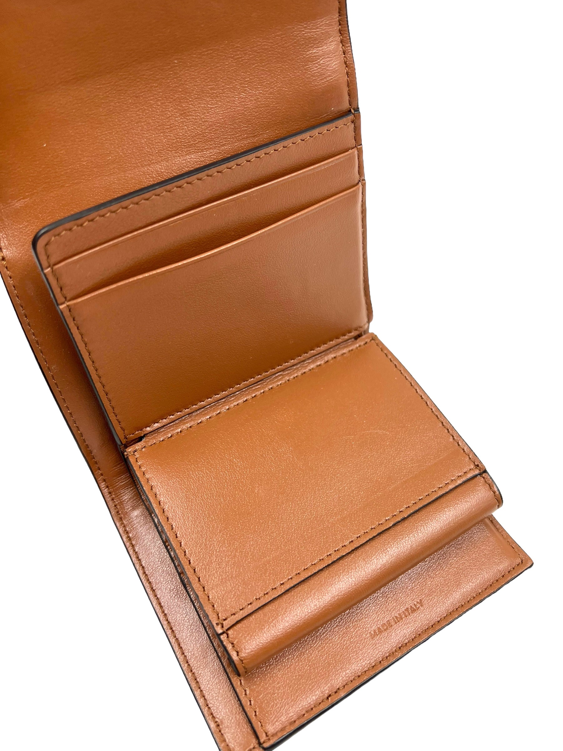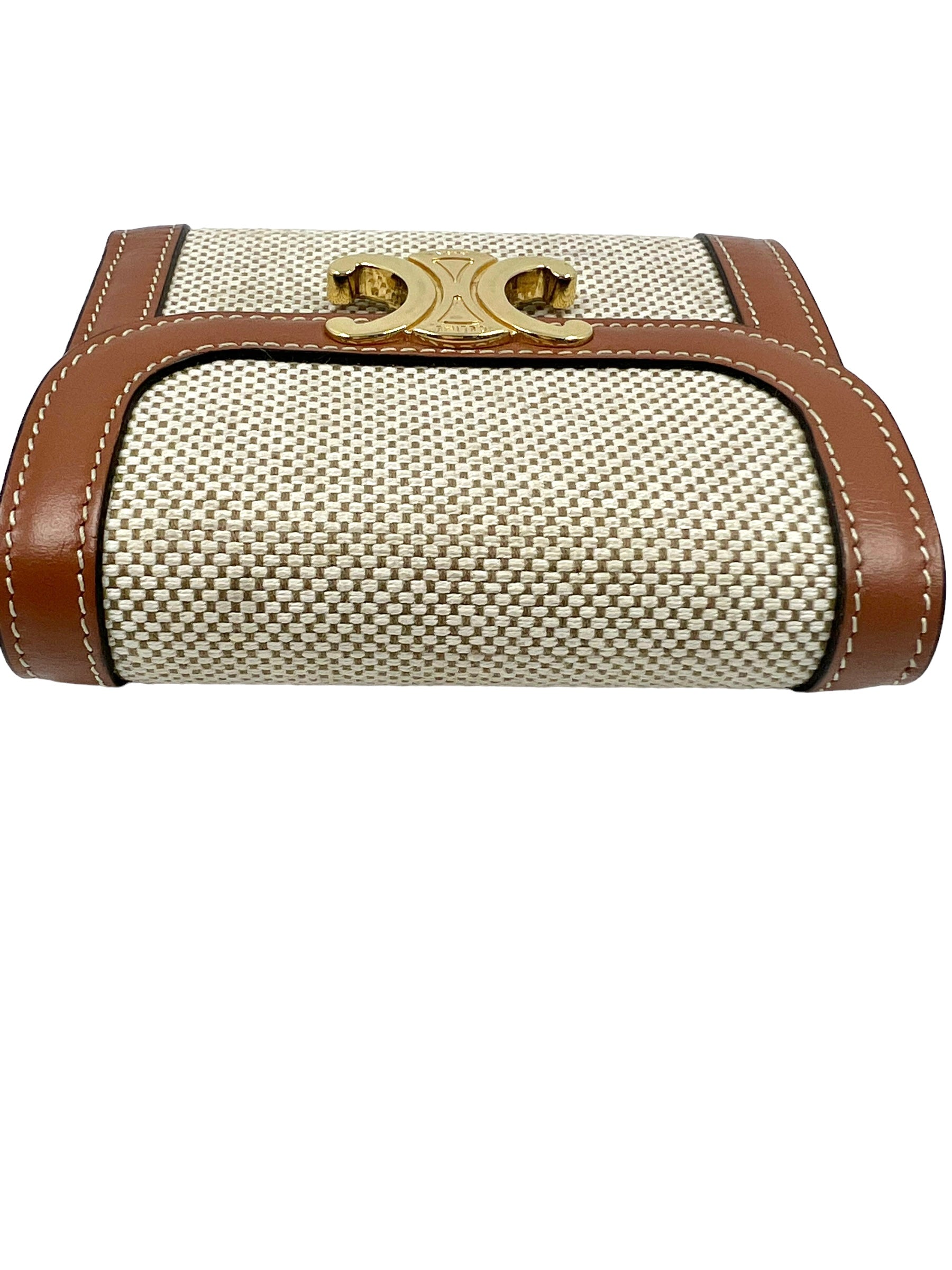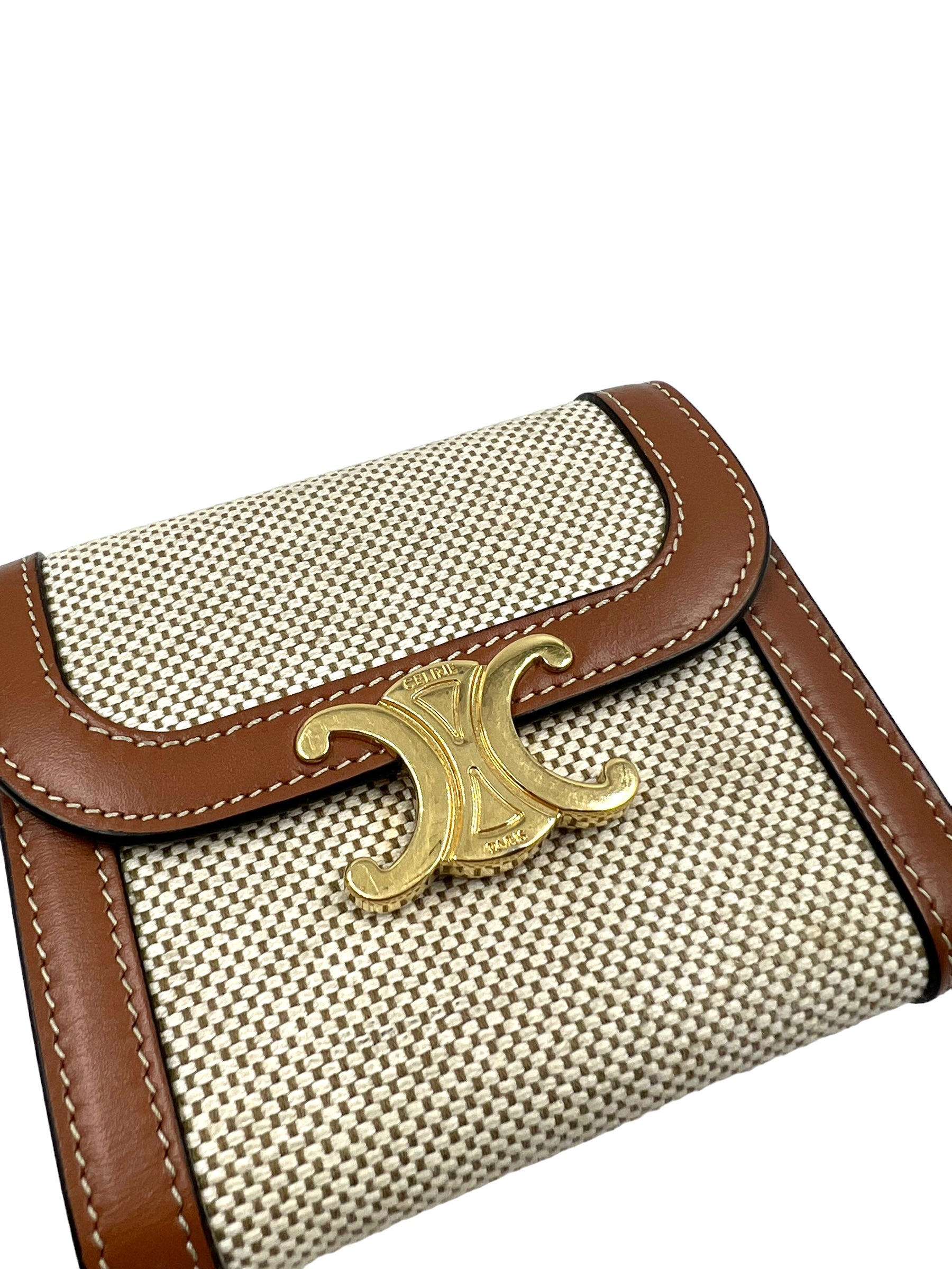 Natural canvas small Triomphe wallet with tan leather trim/interior and gold hardware. Features Triomphe logo button closure, one folded coin pocket with snap button, five credit card slots, one note pocket, and two flat pockets. Wallet does not come with dust bag or box.