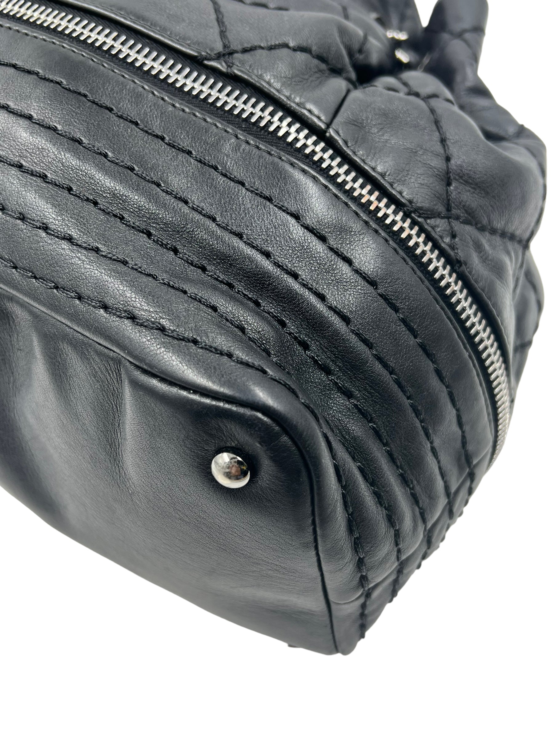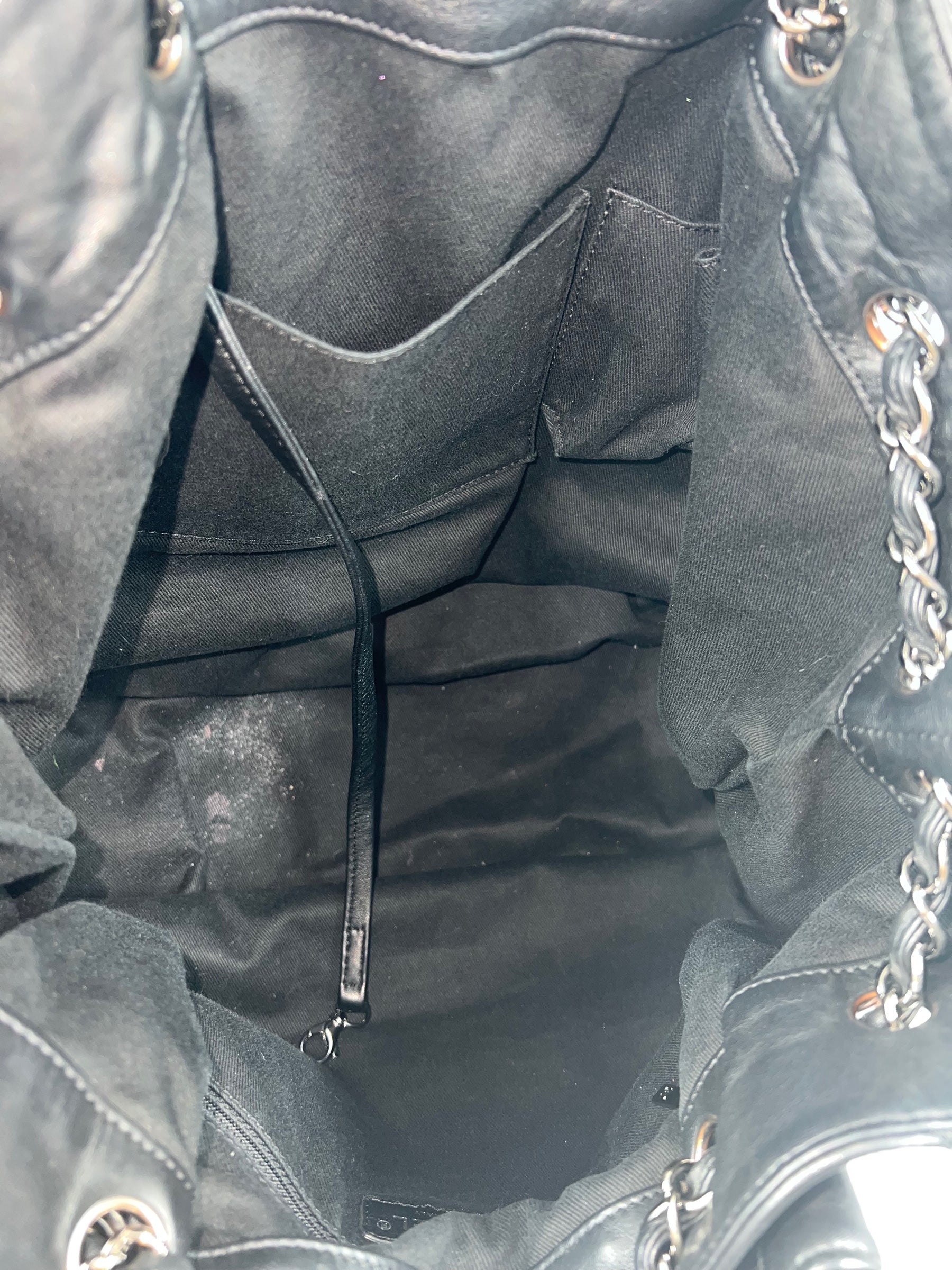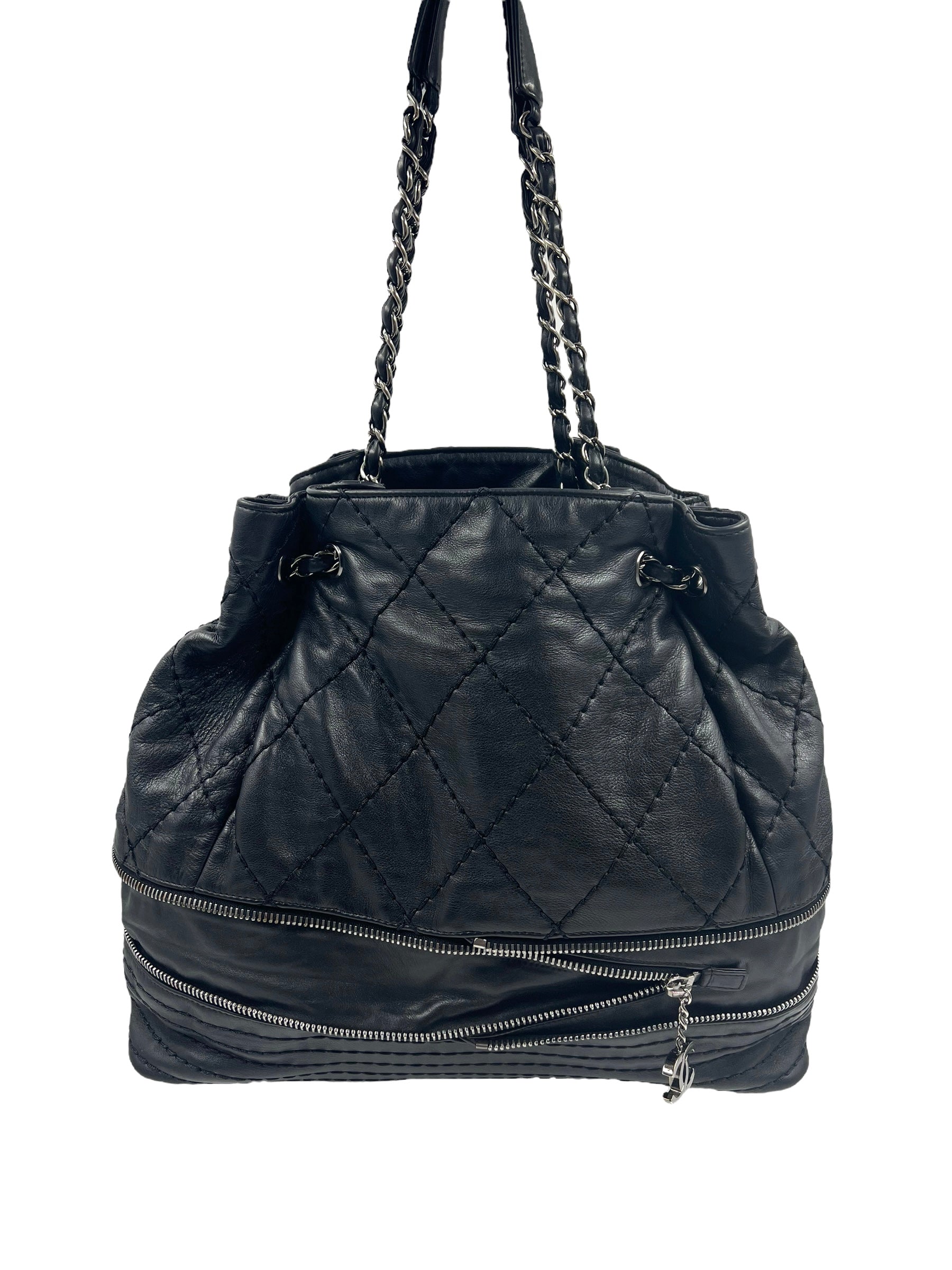 Black quilted calfskin leather 2006-2008 Expandable Ligne drawstring chain bag with silver hardware and single zip expansion at base. Comes with dust bag.