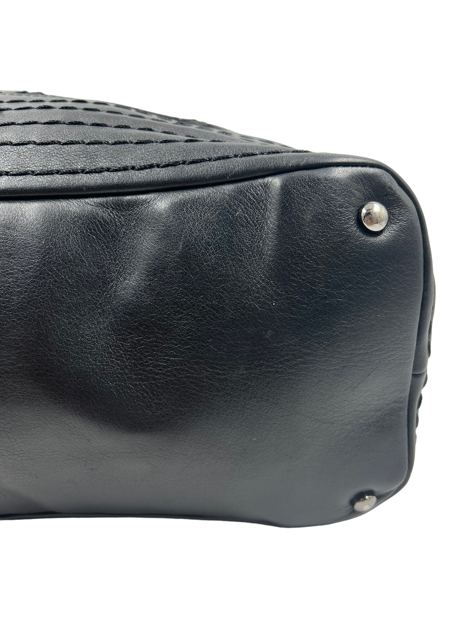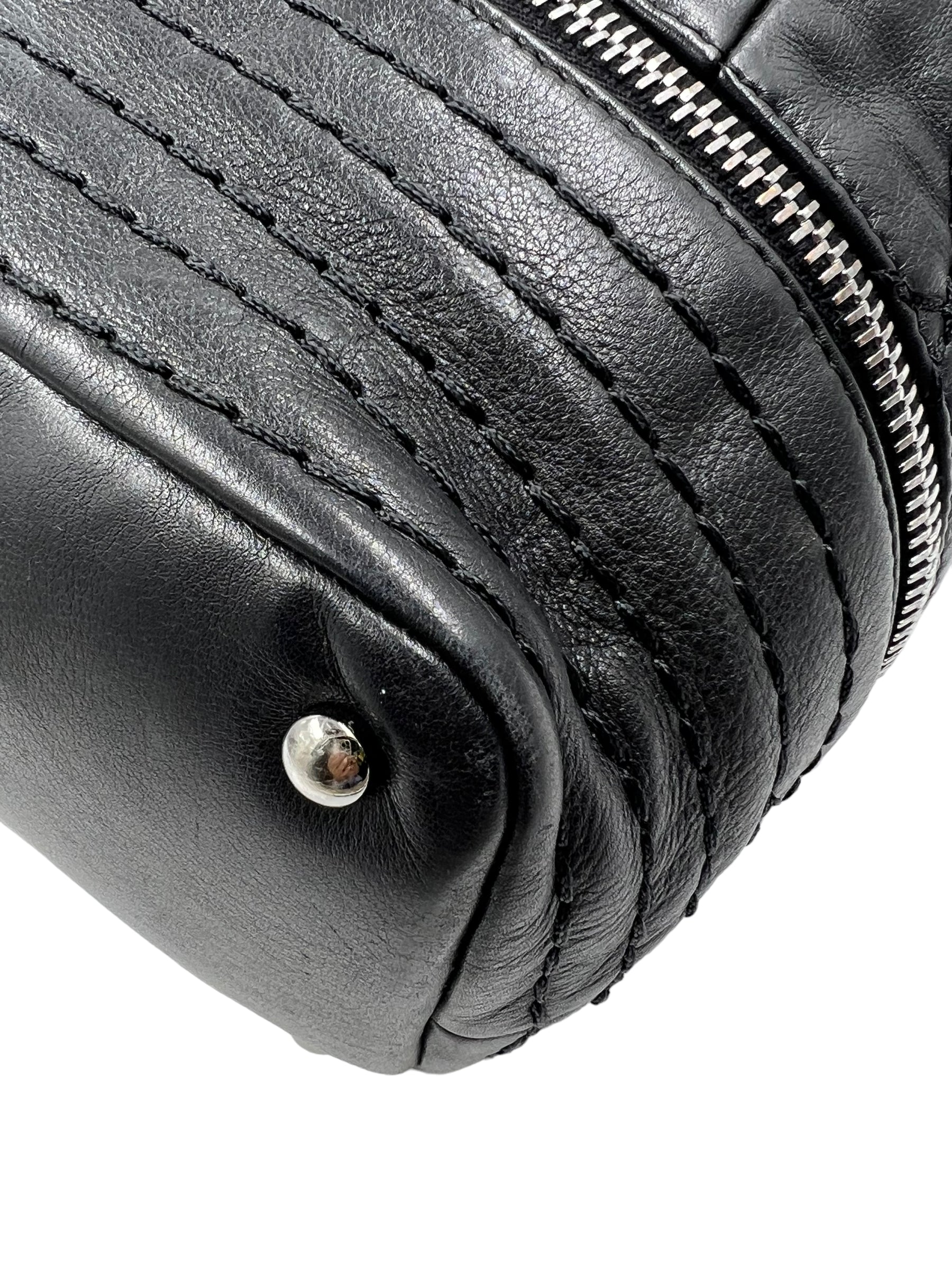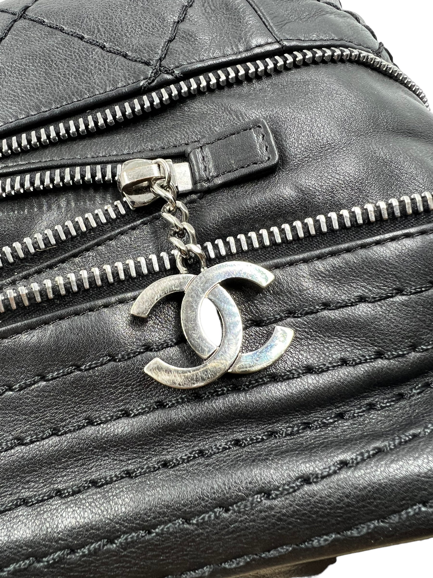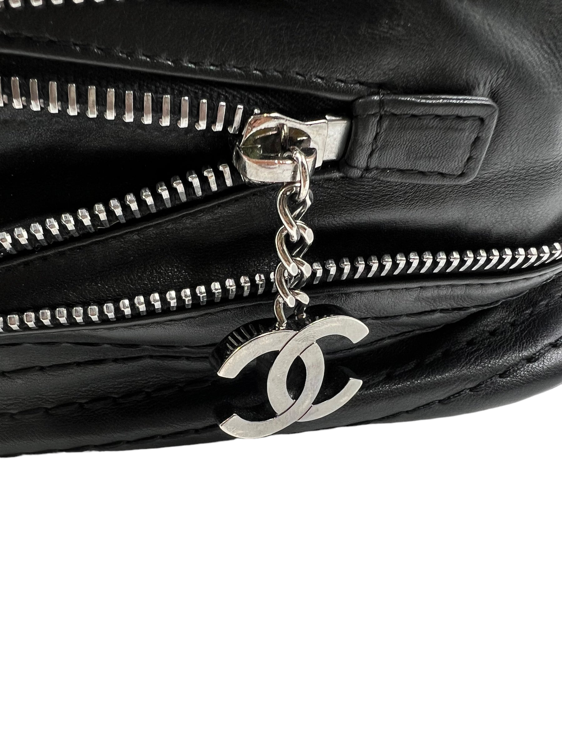 Black quilted calfskin leather 2006-2008 Expandable Ligne drawstring chain bag with silver hardware and single zip expansion at base. Comes with dust bag.