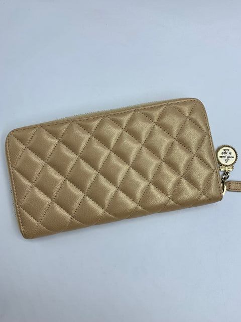 Champagne shimmer calfskin 2014-2015 zip around wallet with dotted CC logo and Coco Chanel medallion. Comes with dust bag and box