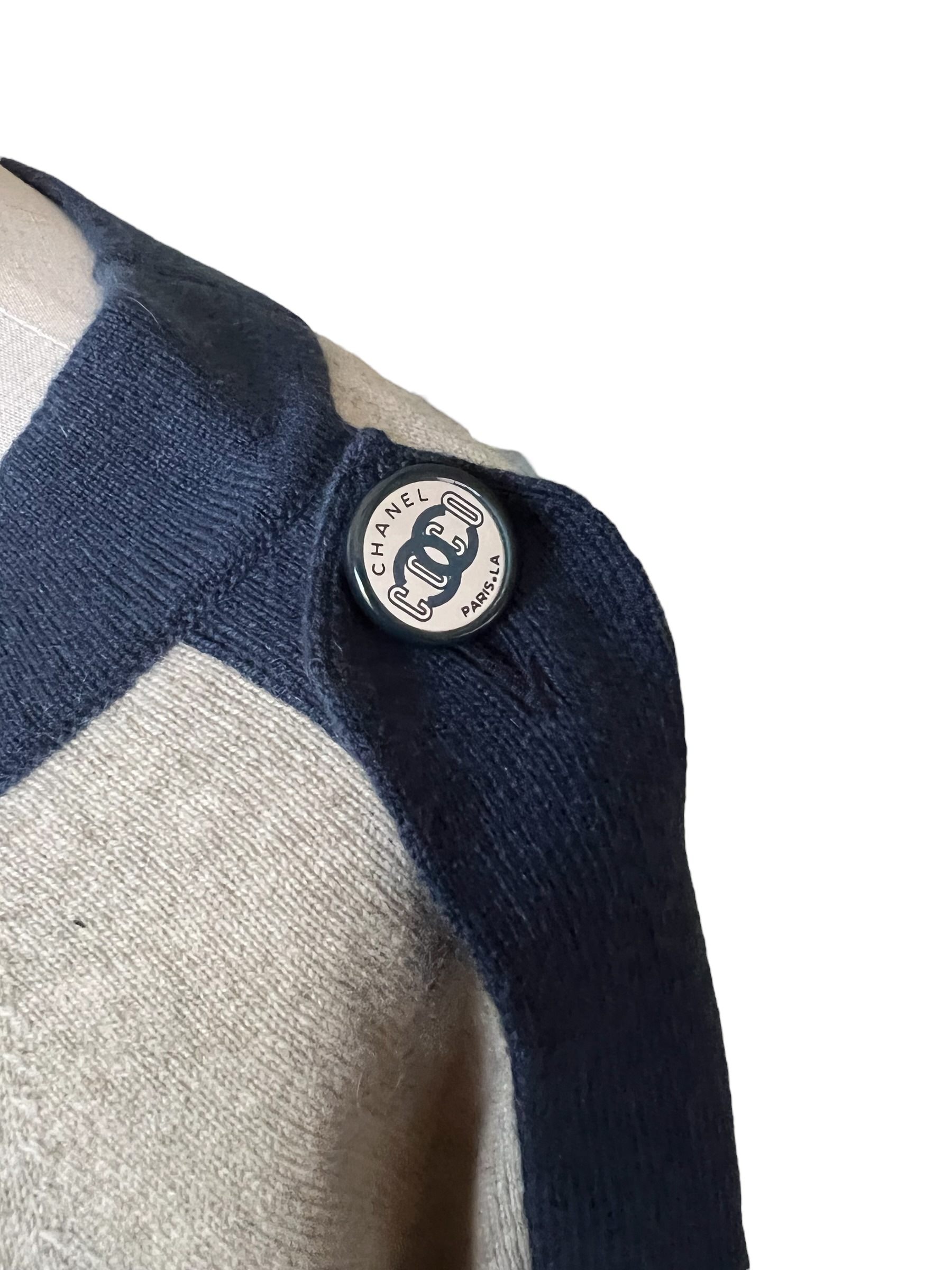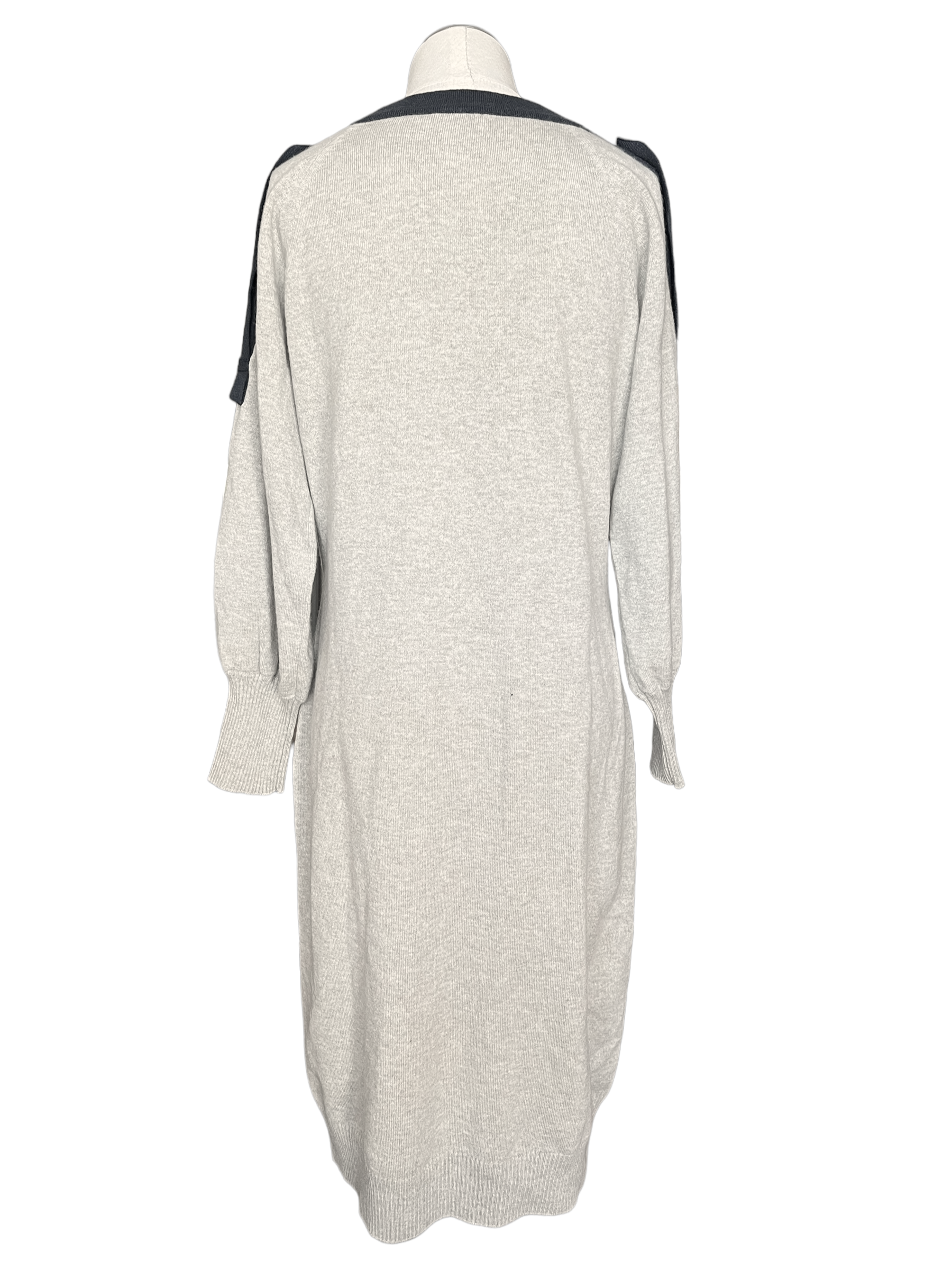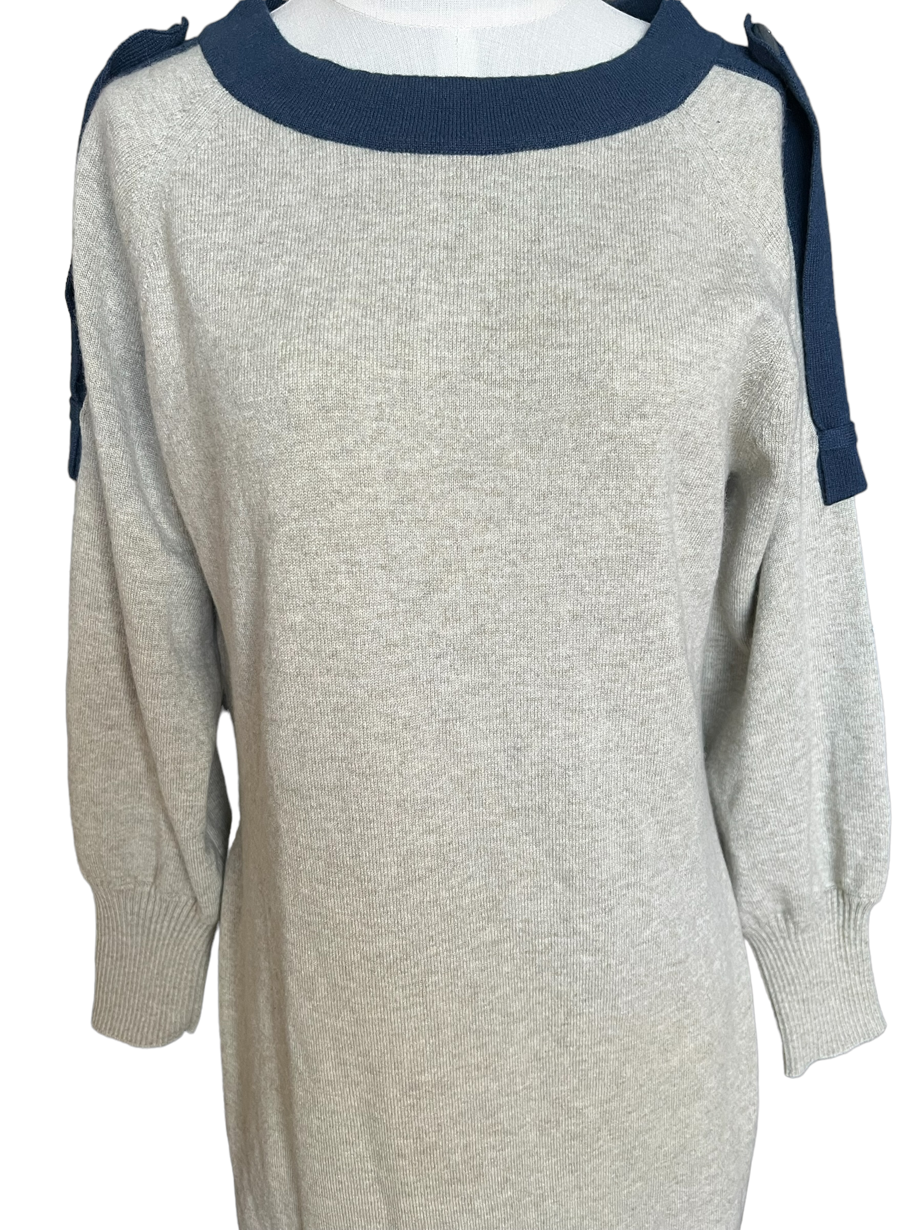 Gray cashmere 08C long sleeve dress with Coco logo buttons and navy trim