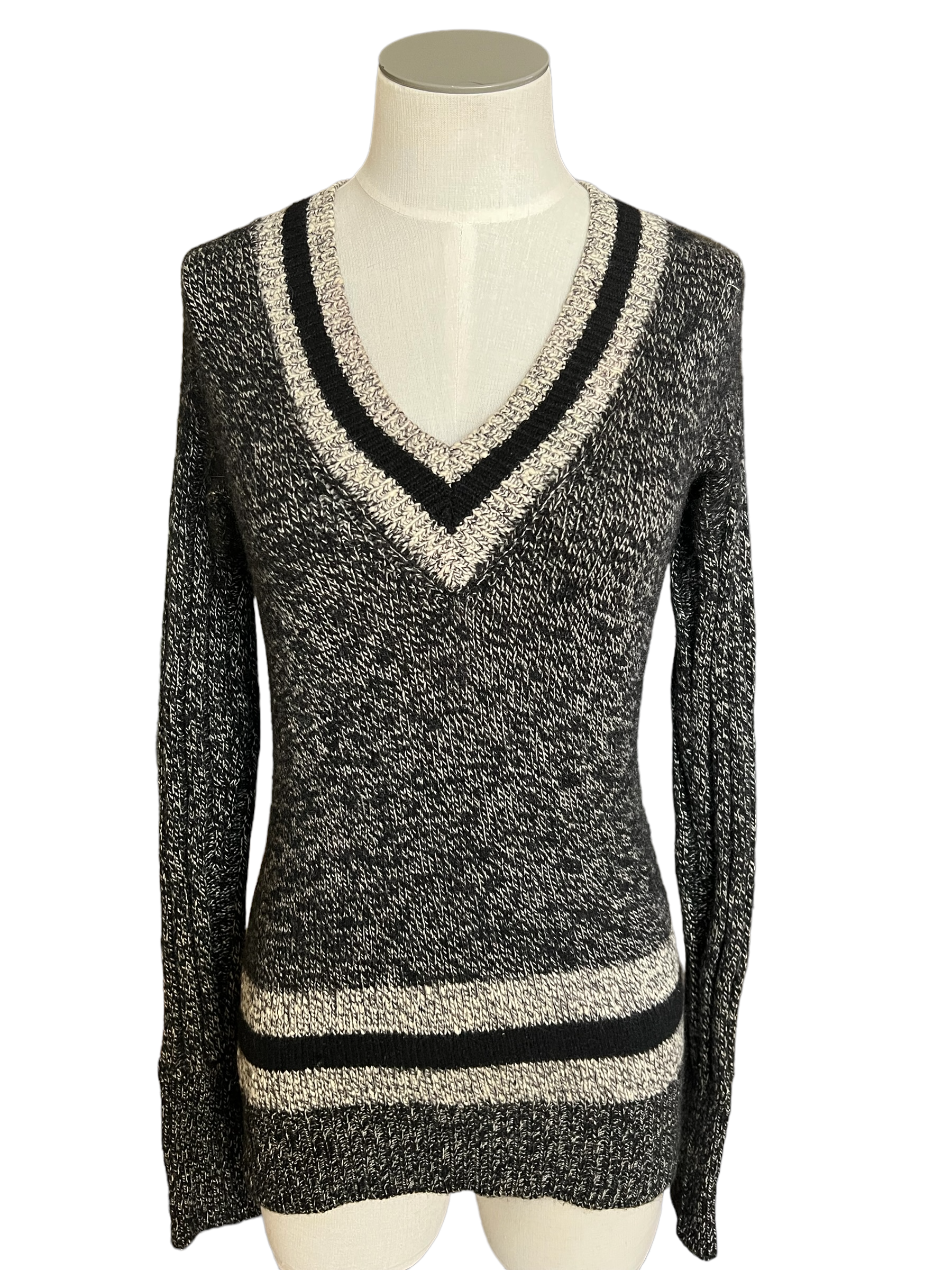 Gray charcoal 96A cashmere long sleeve v-neck sweater with cream CC logo back. Size/care tag is missing