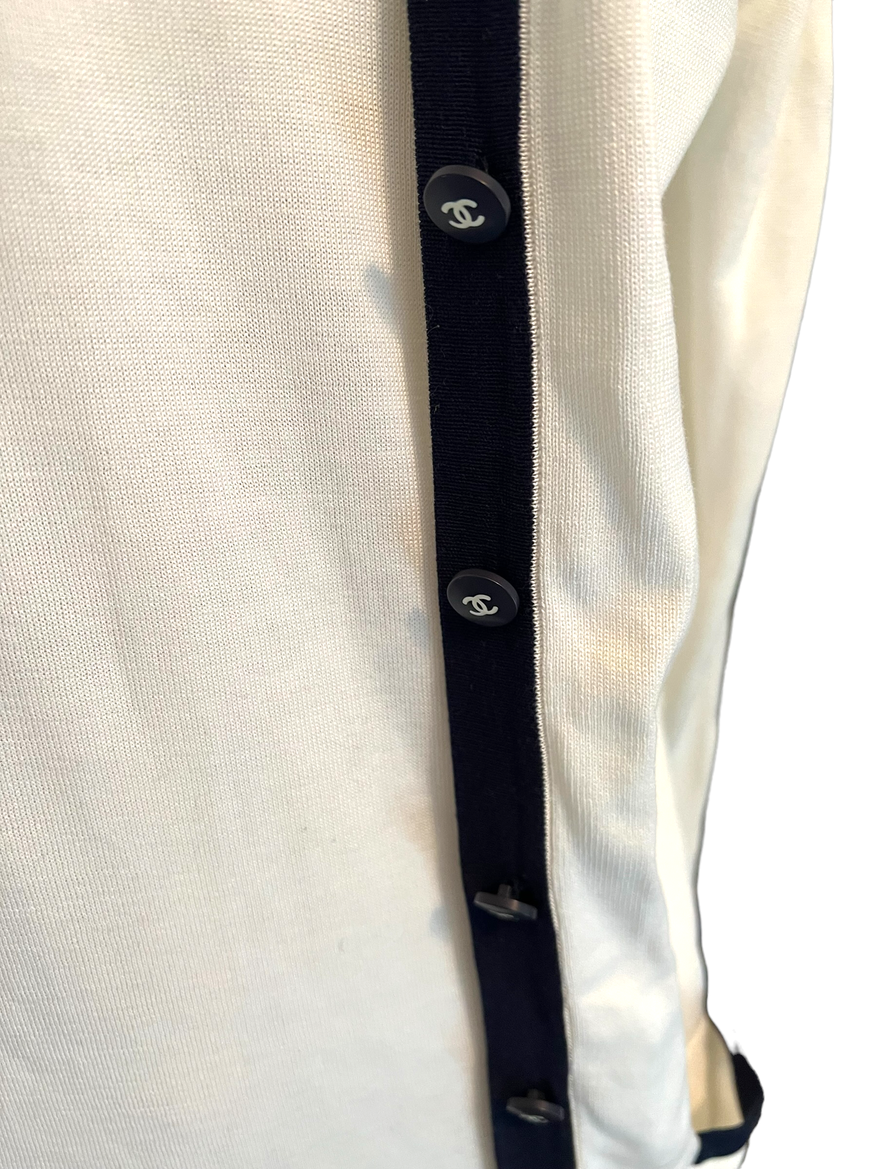 Off white lightweight knit 96P cardigan with CC logo buttons and navy trim. Comes with matching tank top