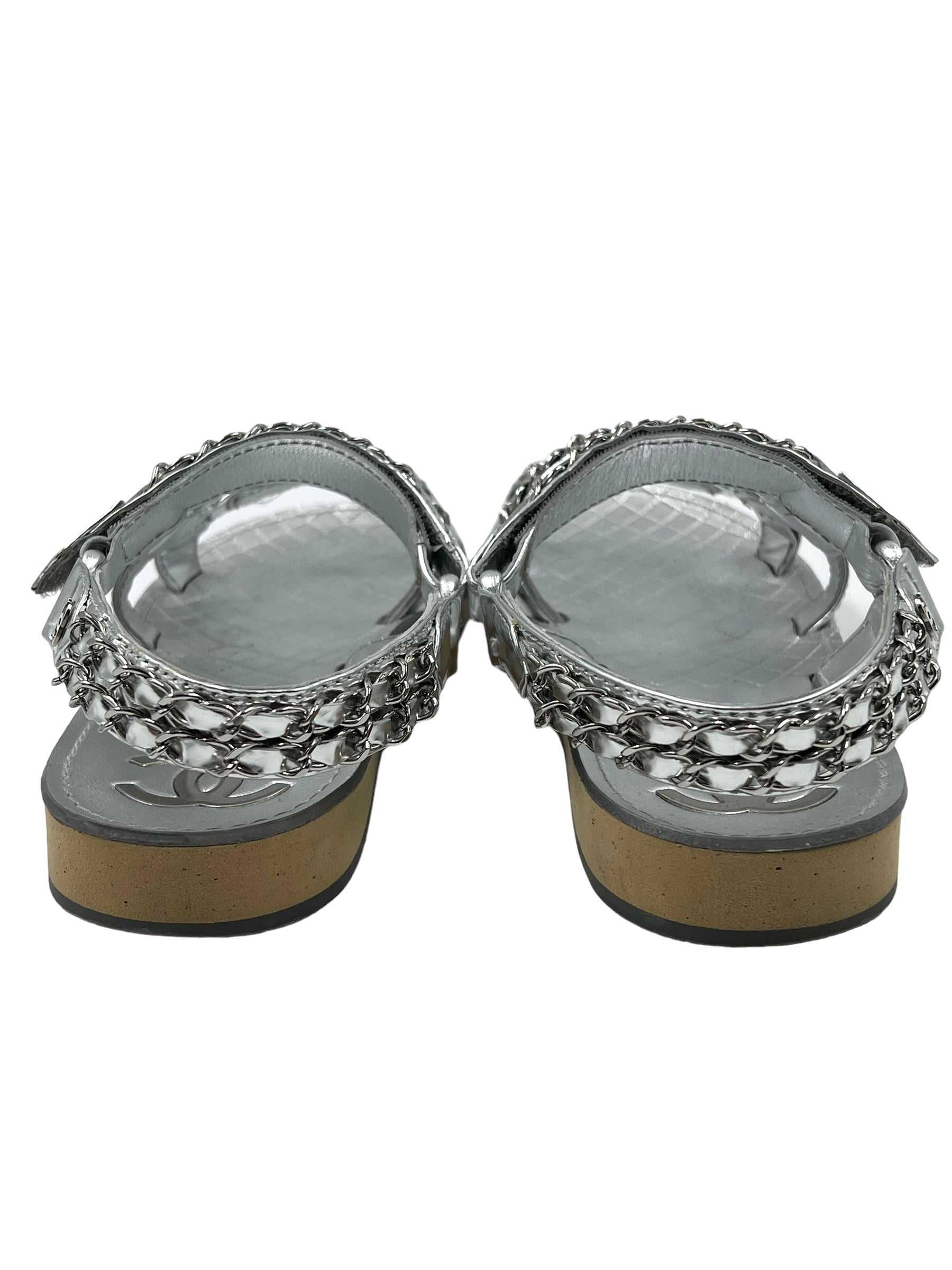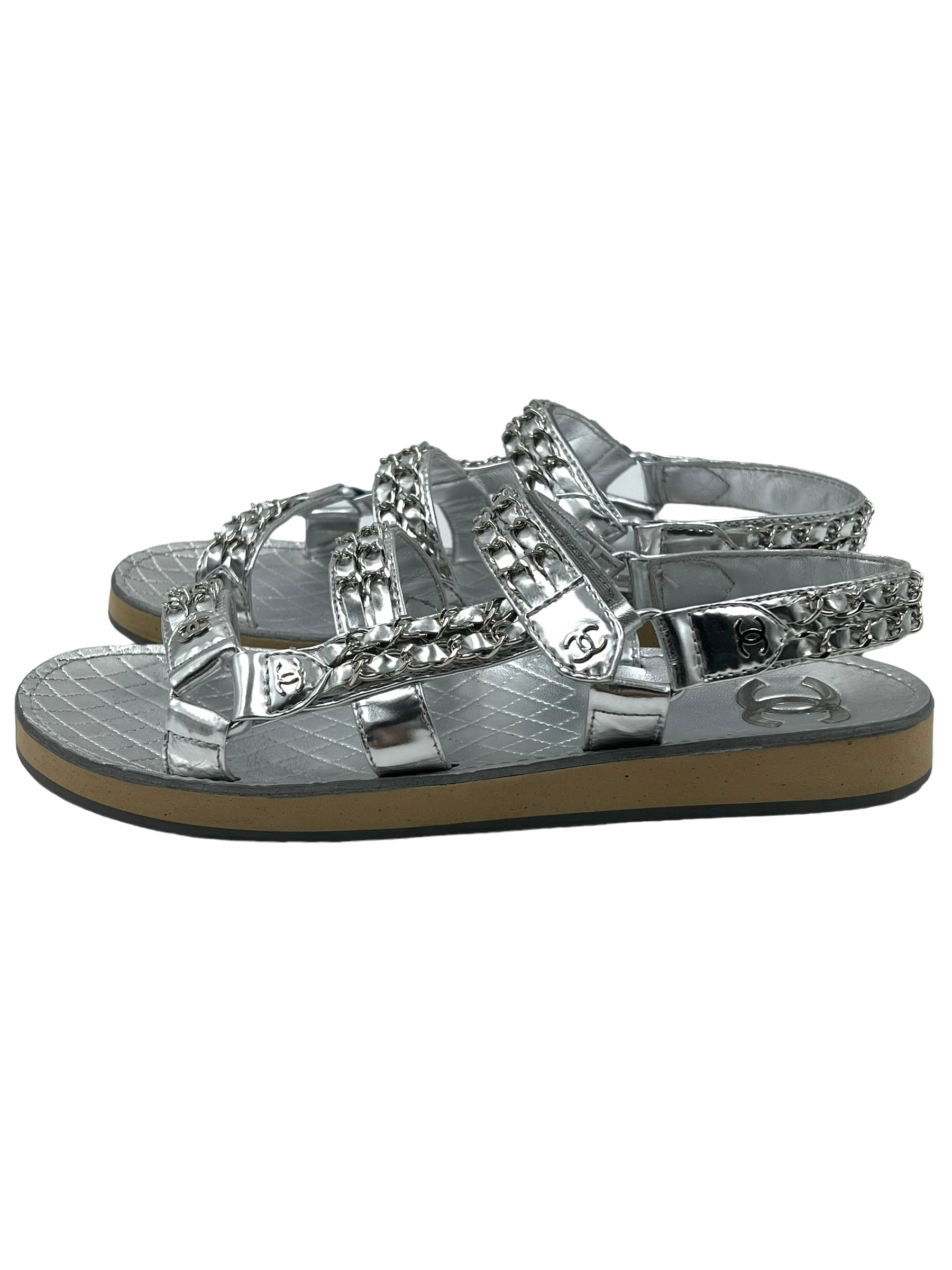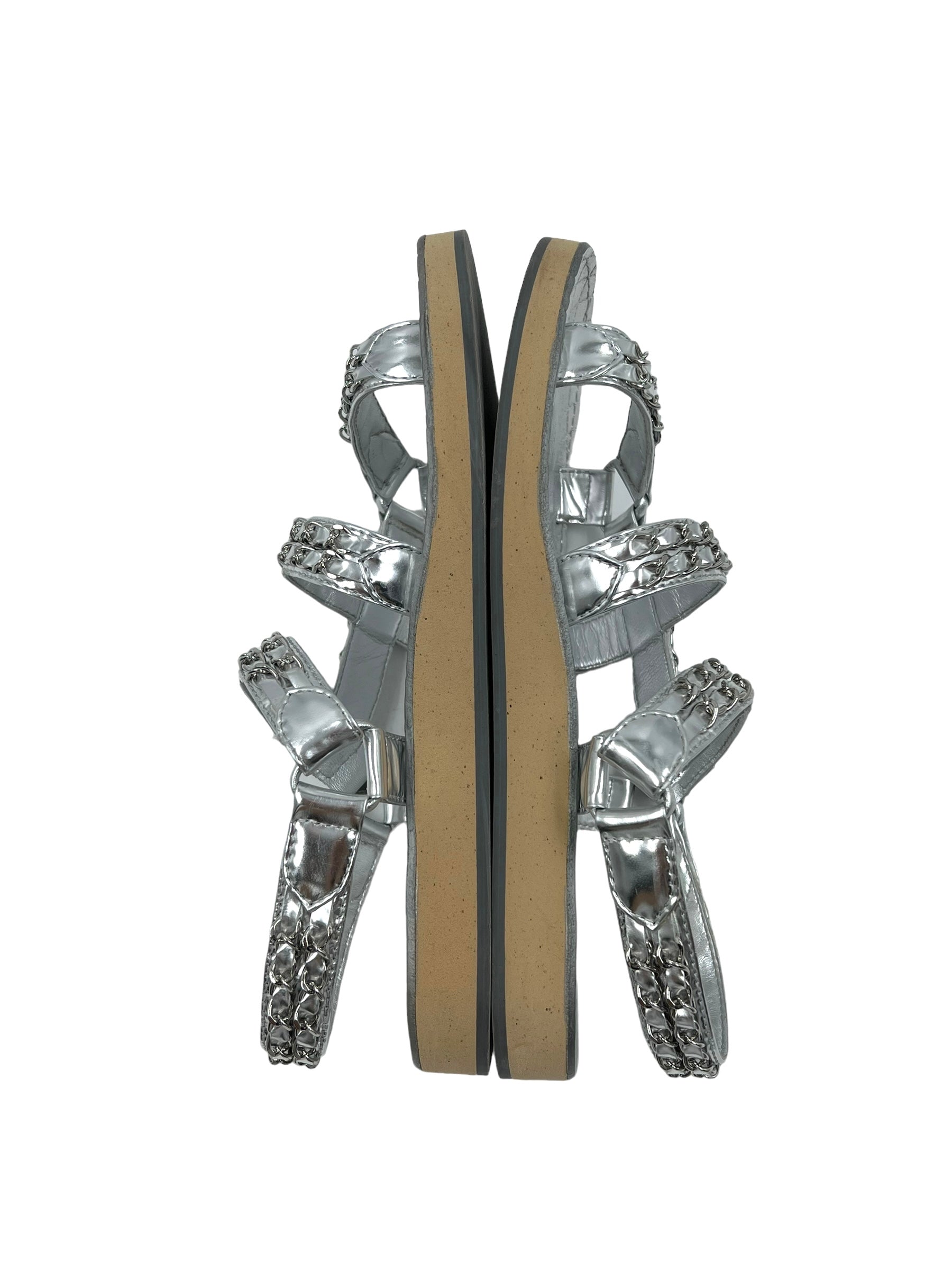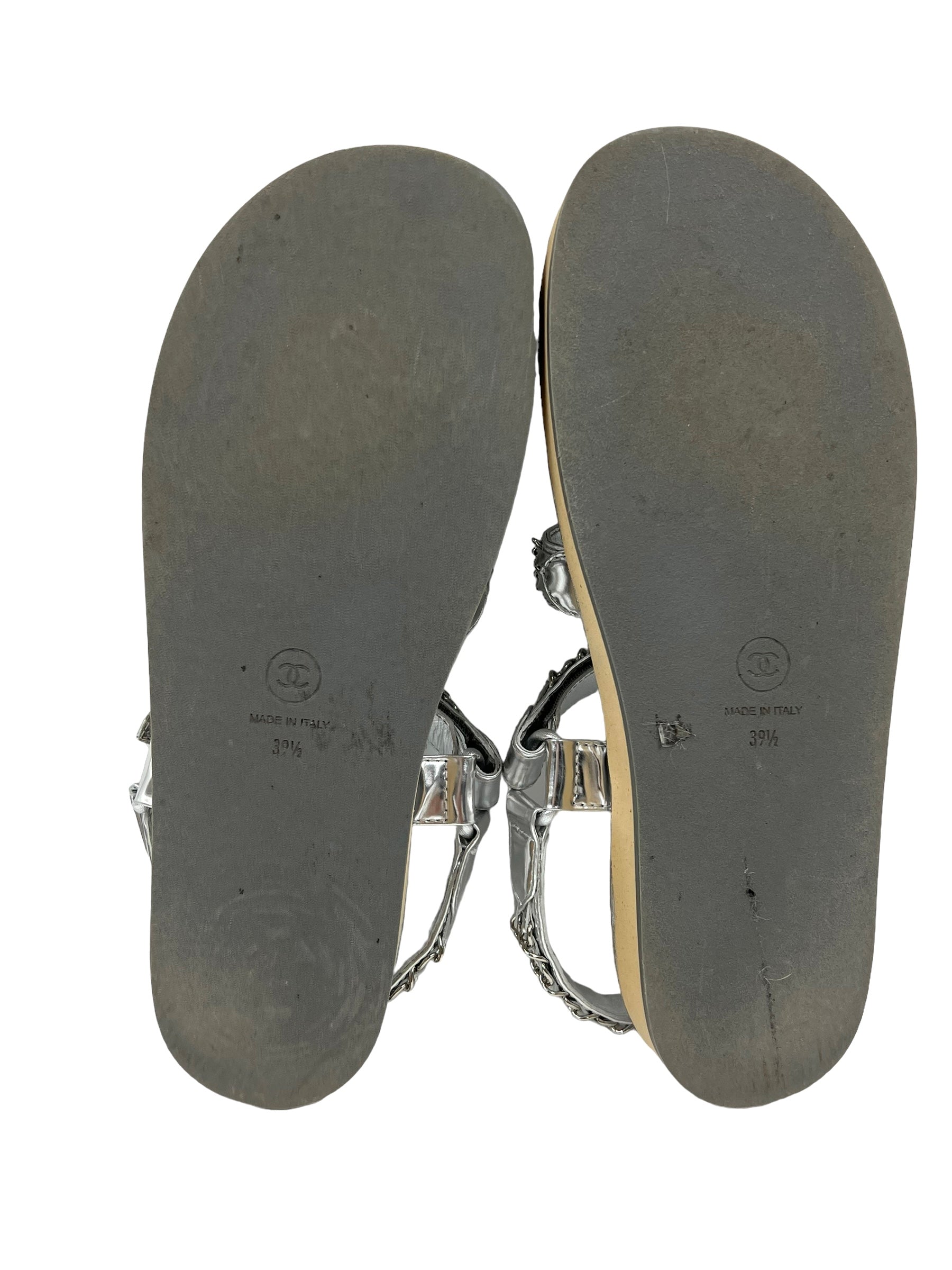 Chanel Size 39.5 Silver Leather Dad Chain Sandals