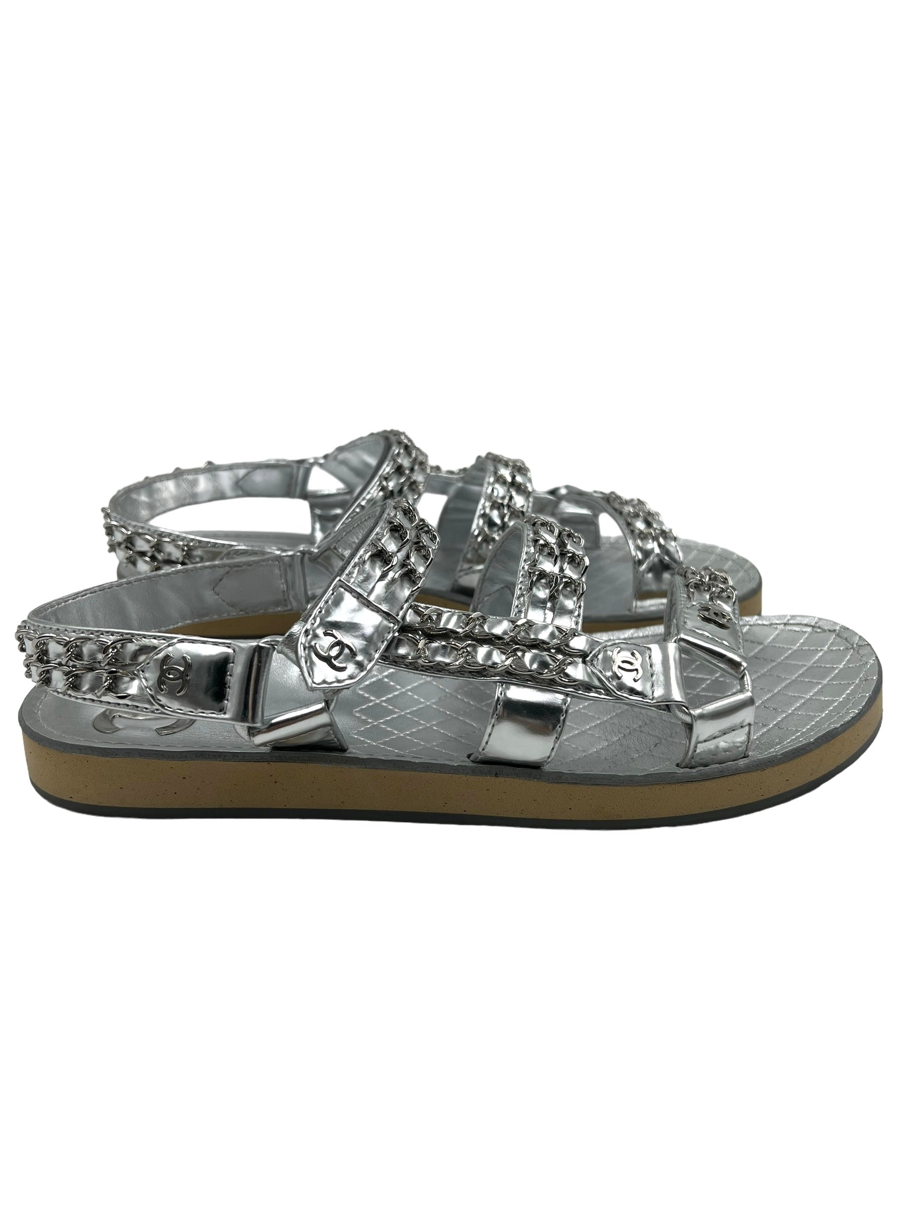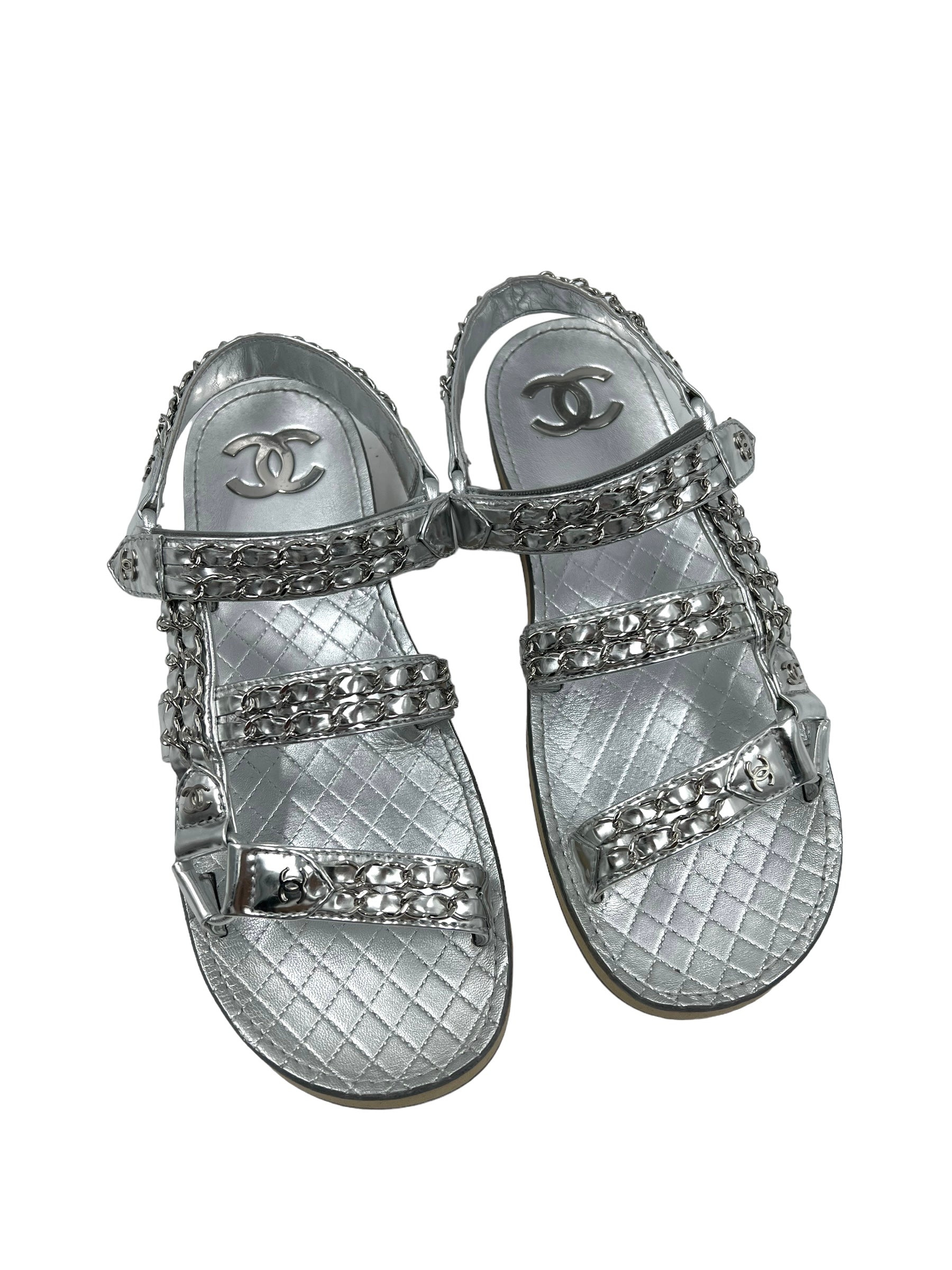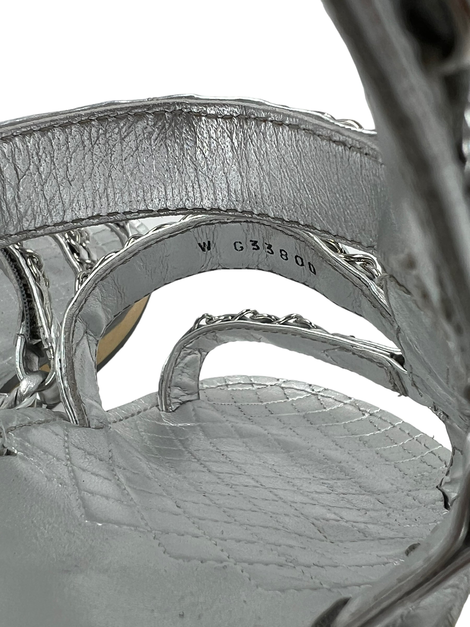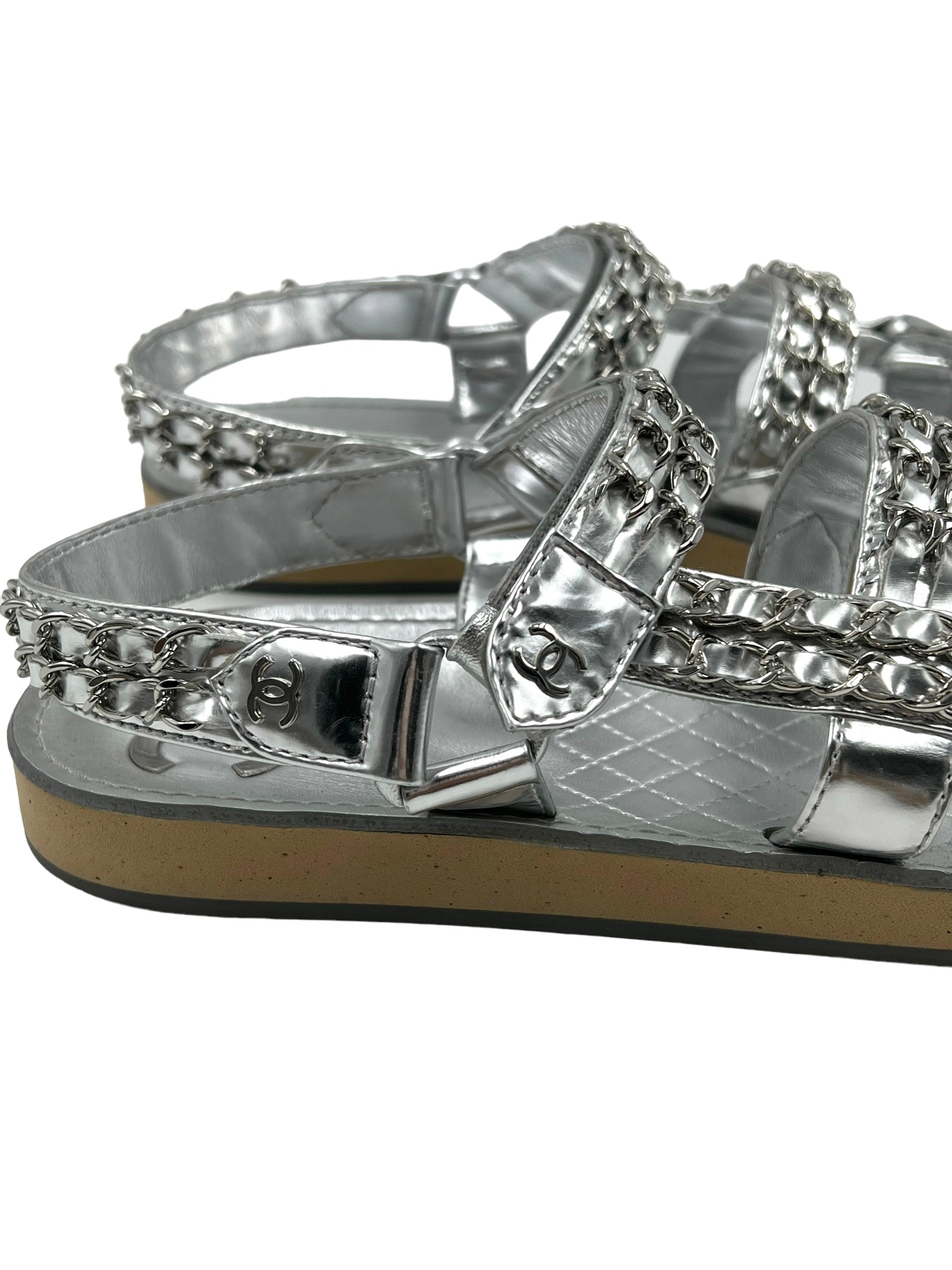 Chanel Size 39.5 Silver Leather Dad Chain Sandals