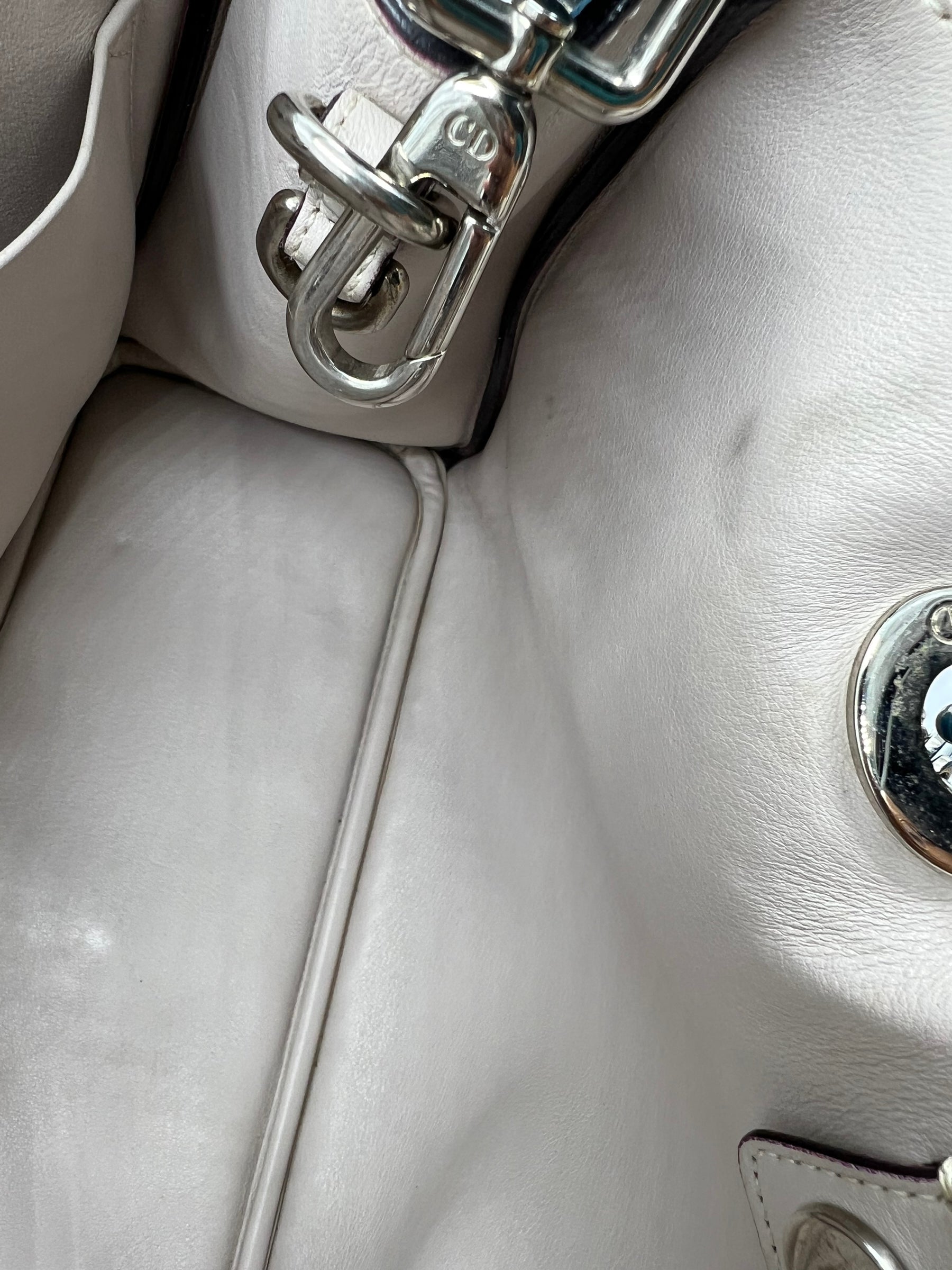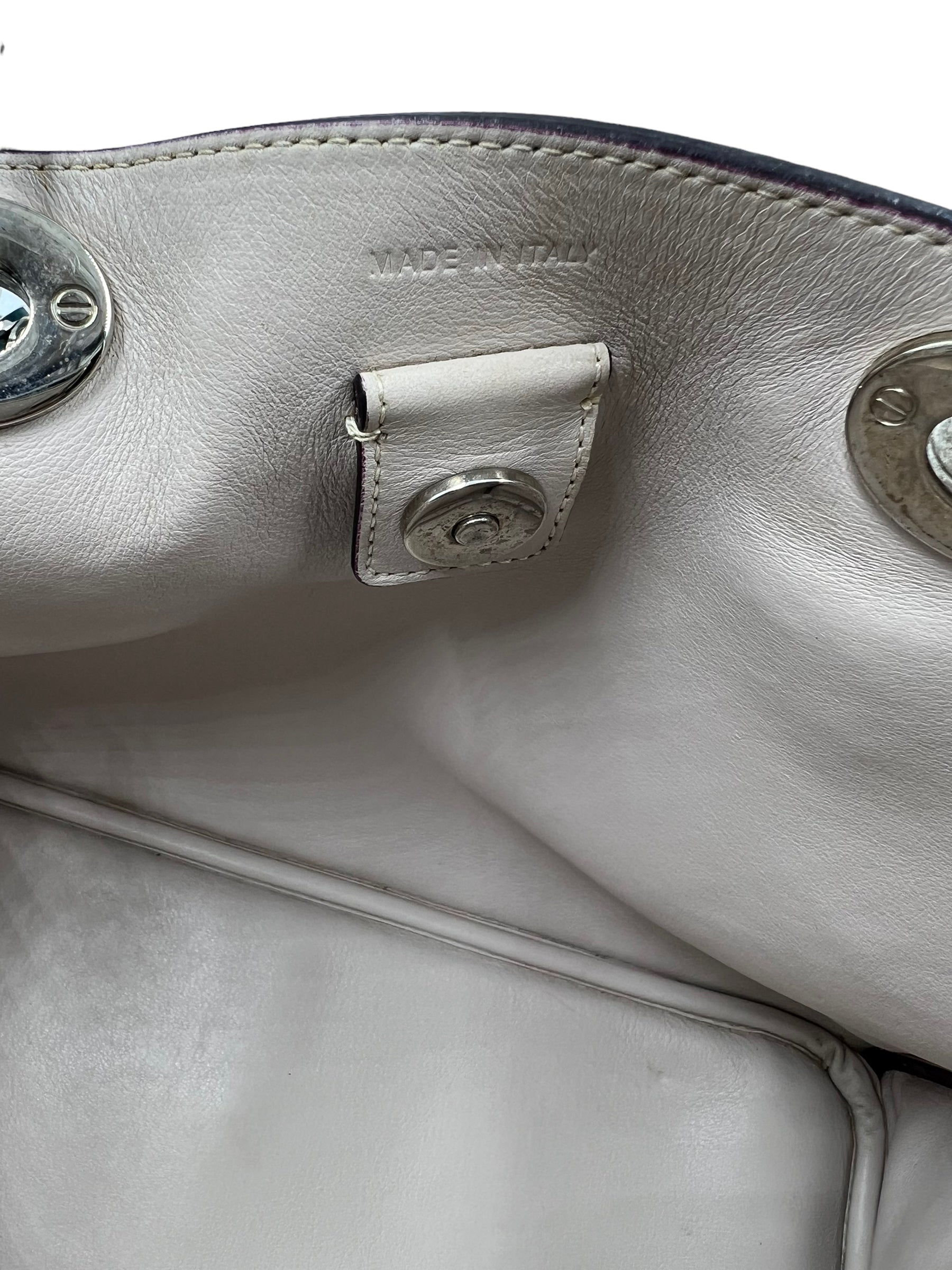 C-Good pre-owned condition with some wear on exterior leather/corners (including strap/handles) and hardware. Interior shows light signs of wear.