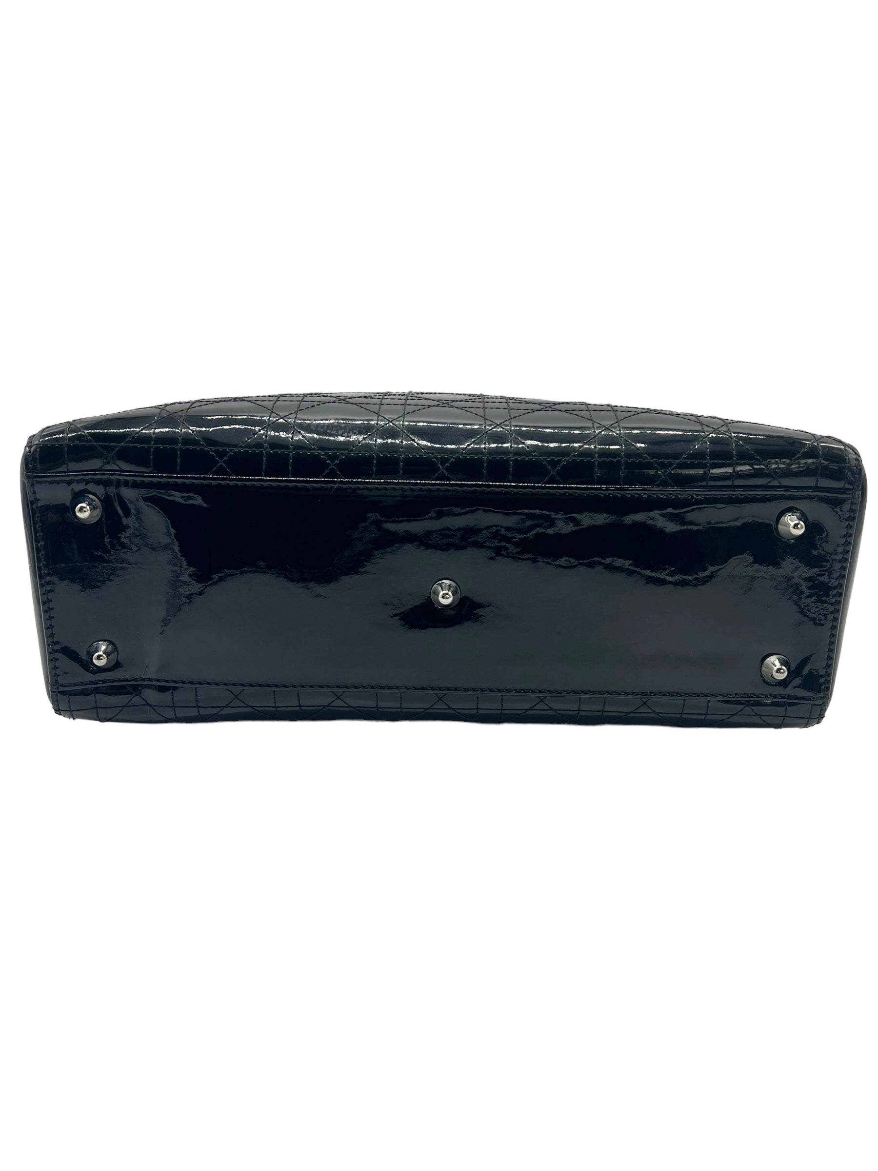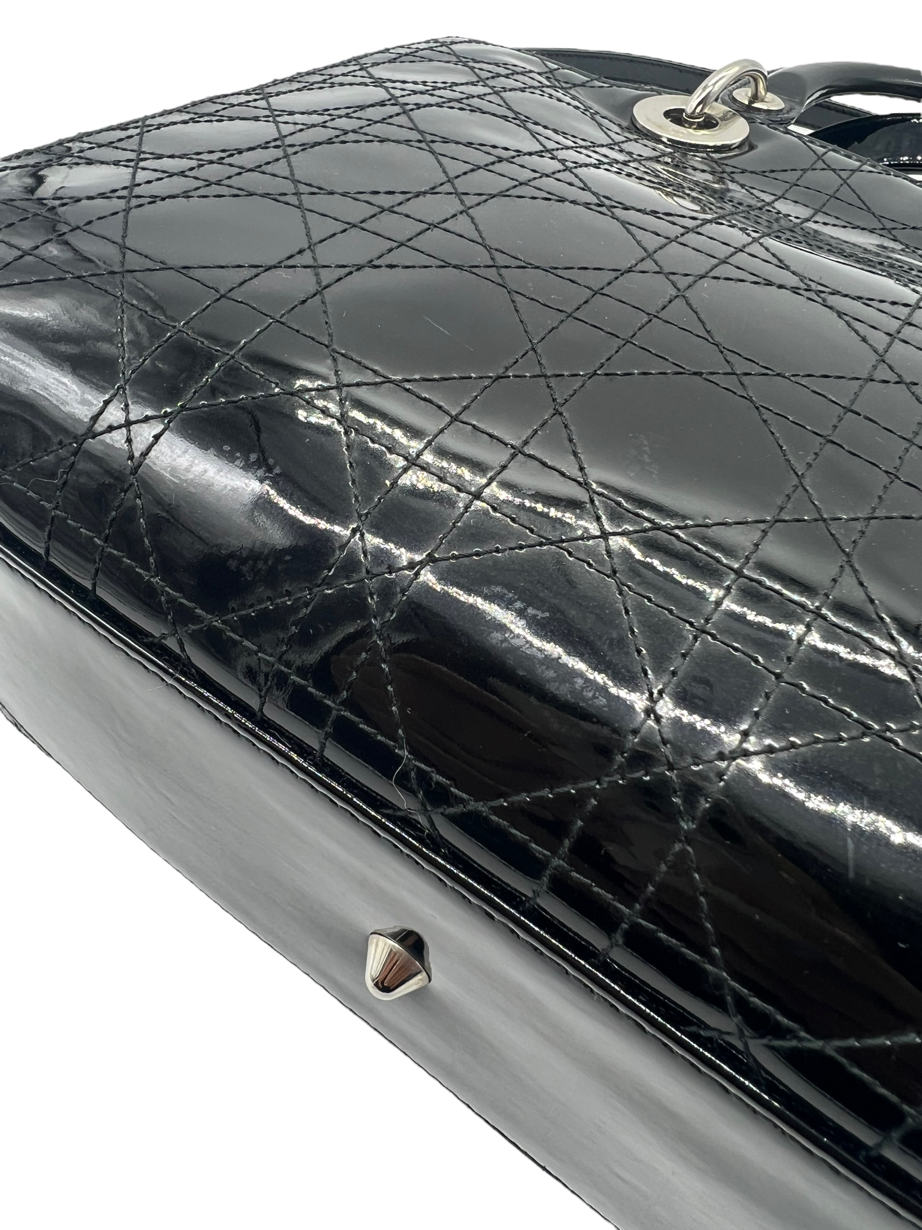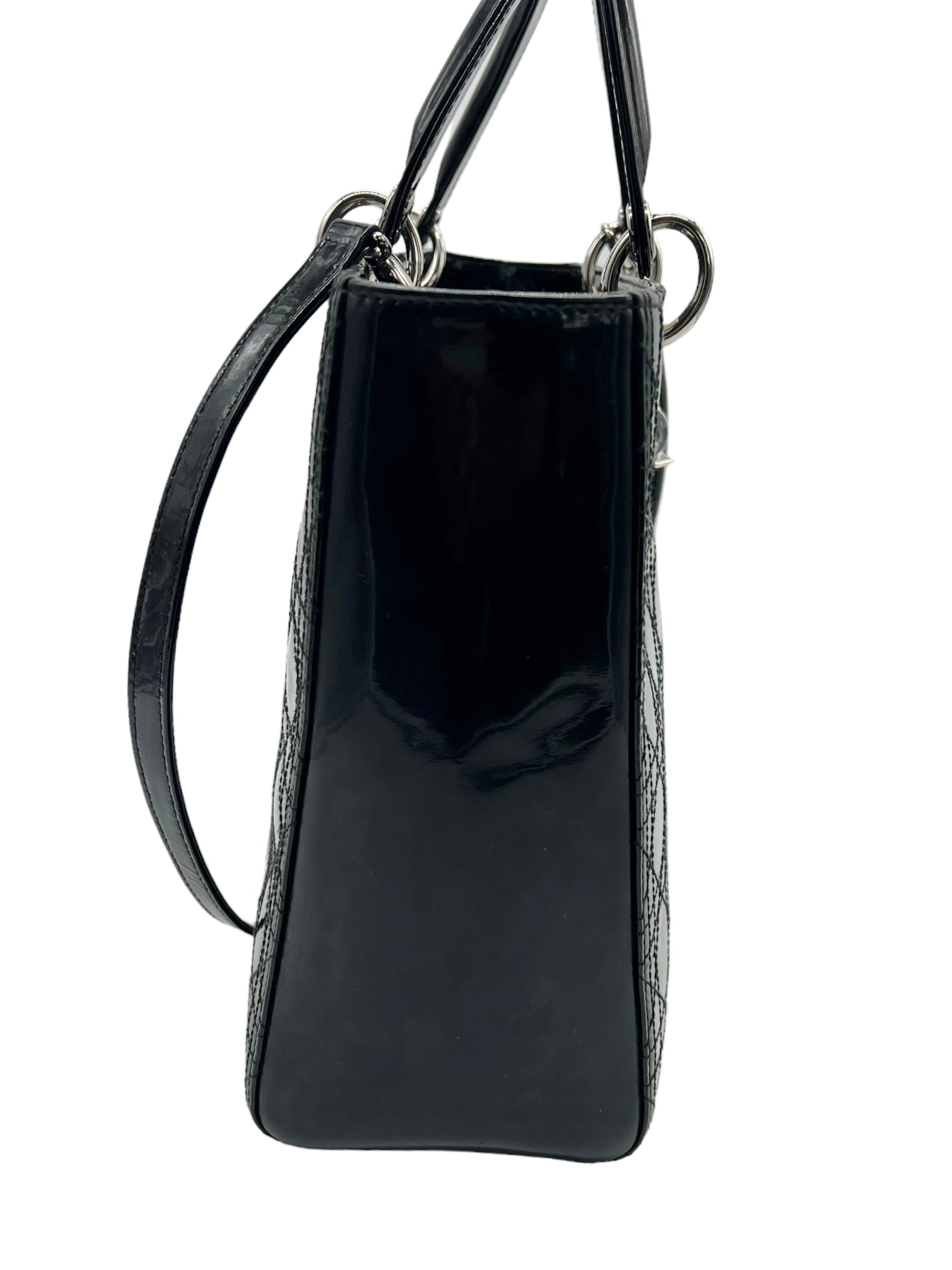 Black patent leather Lady Dior tote with detachable long strap and silver hardware. Comes with dust bag.