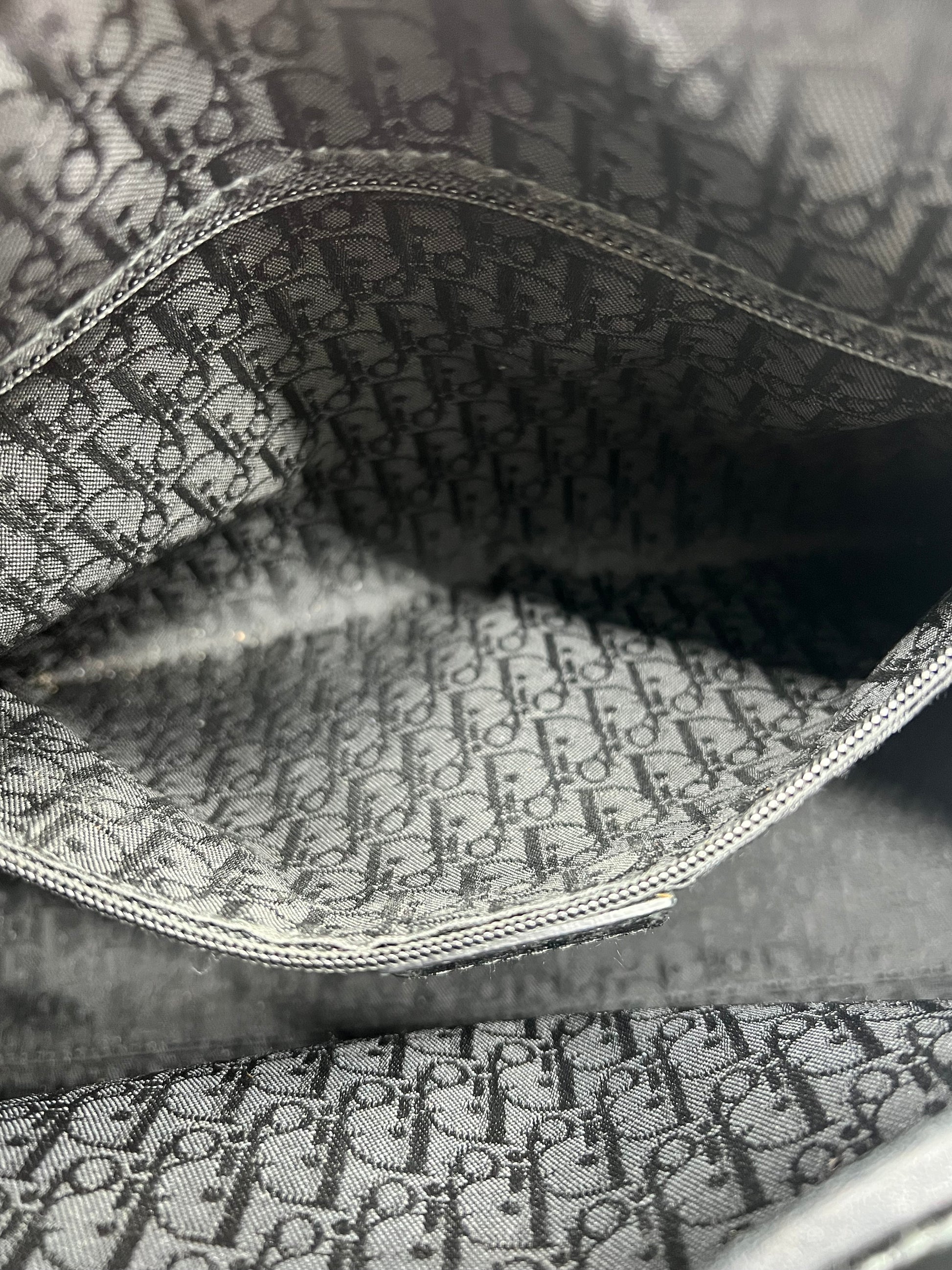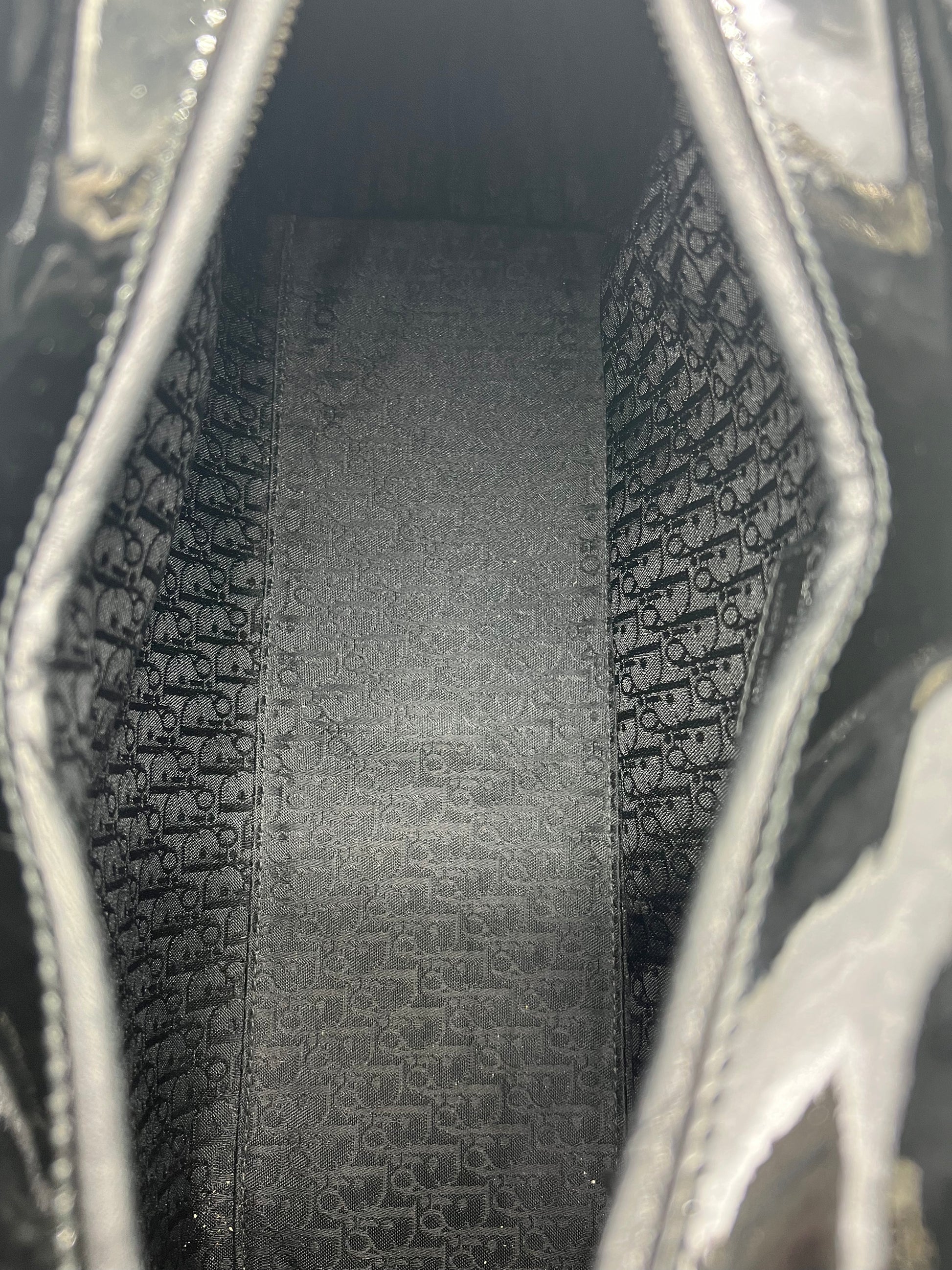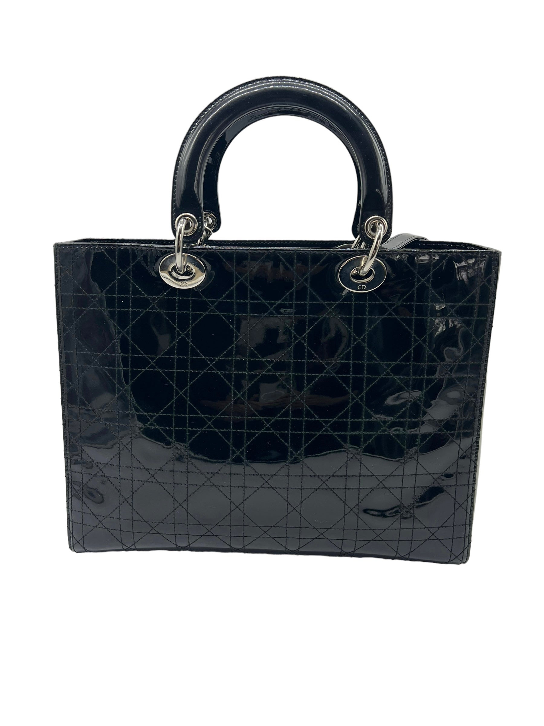 Black patent leather Lady Dior tote with detachable long strap and silver hardware. Comes with dust bag.