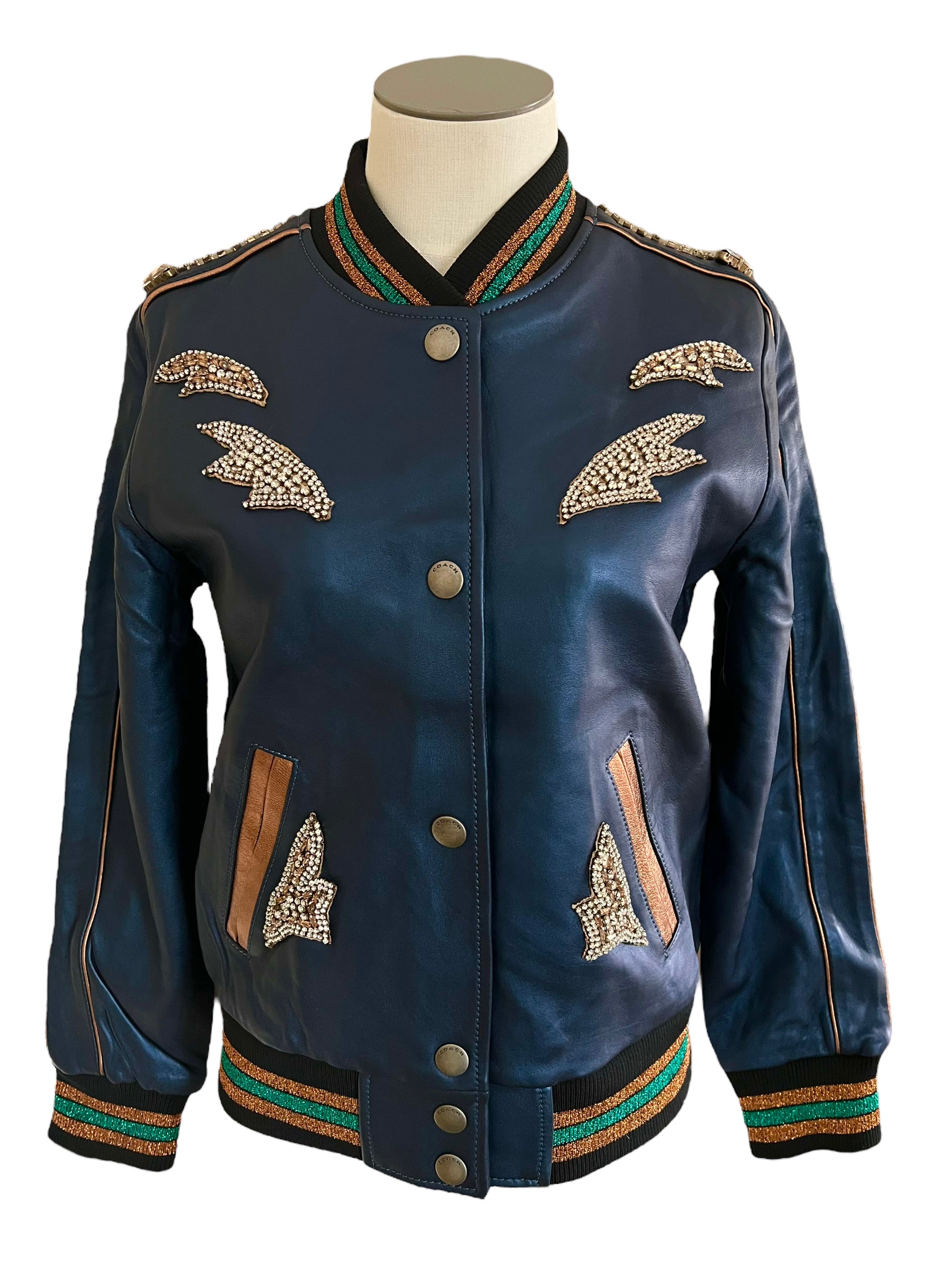 Blue metallic lamb leather embellished snap button varsity jacket. Comes with original tags.