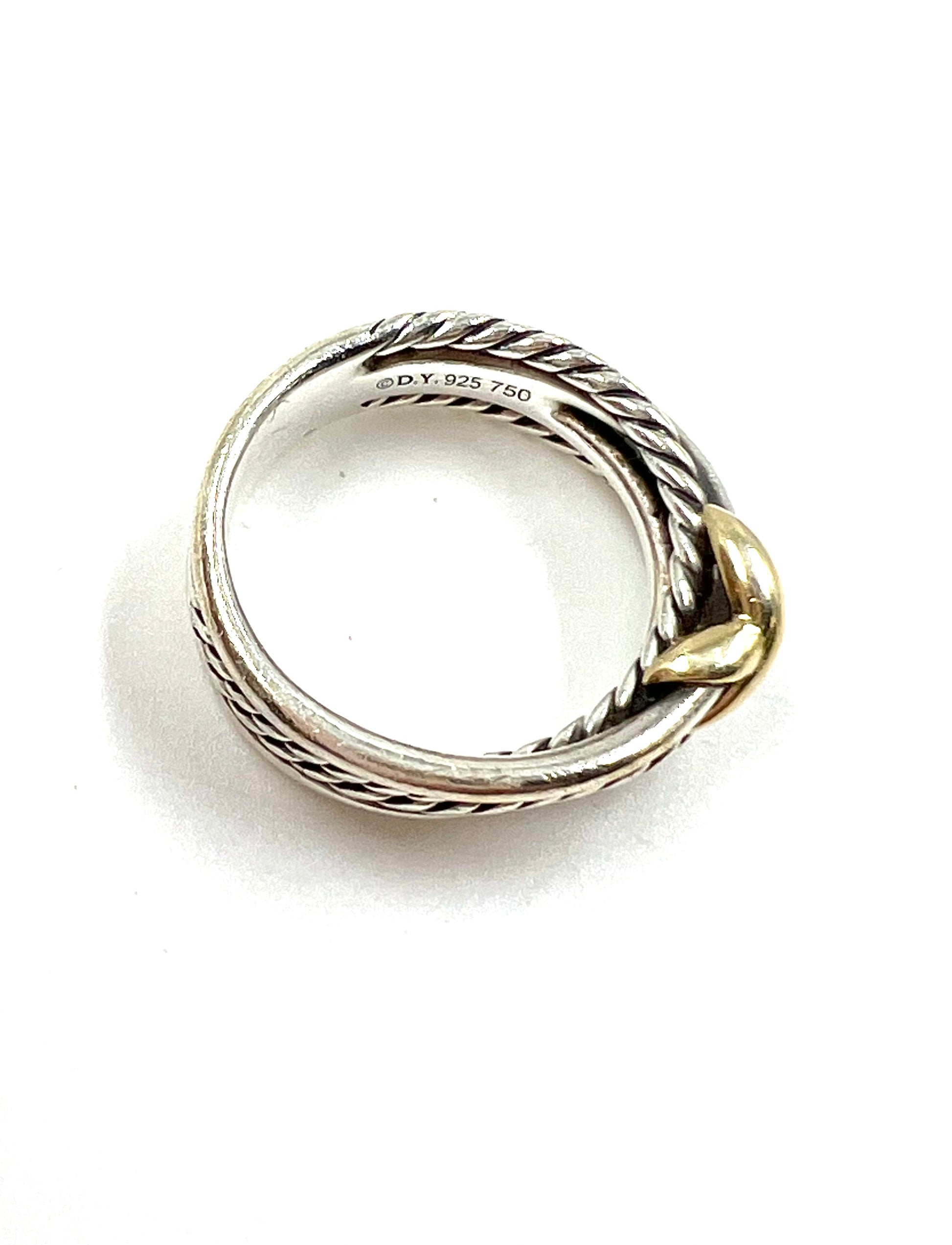 Sterling Silver X Crossover band ring with 18k Yellow Gold detail. Comes with dust bag.