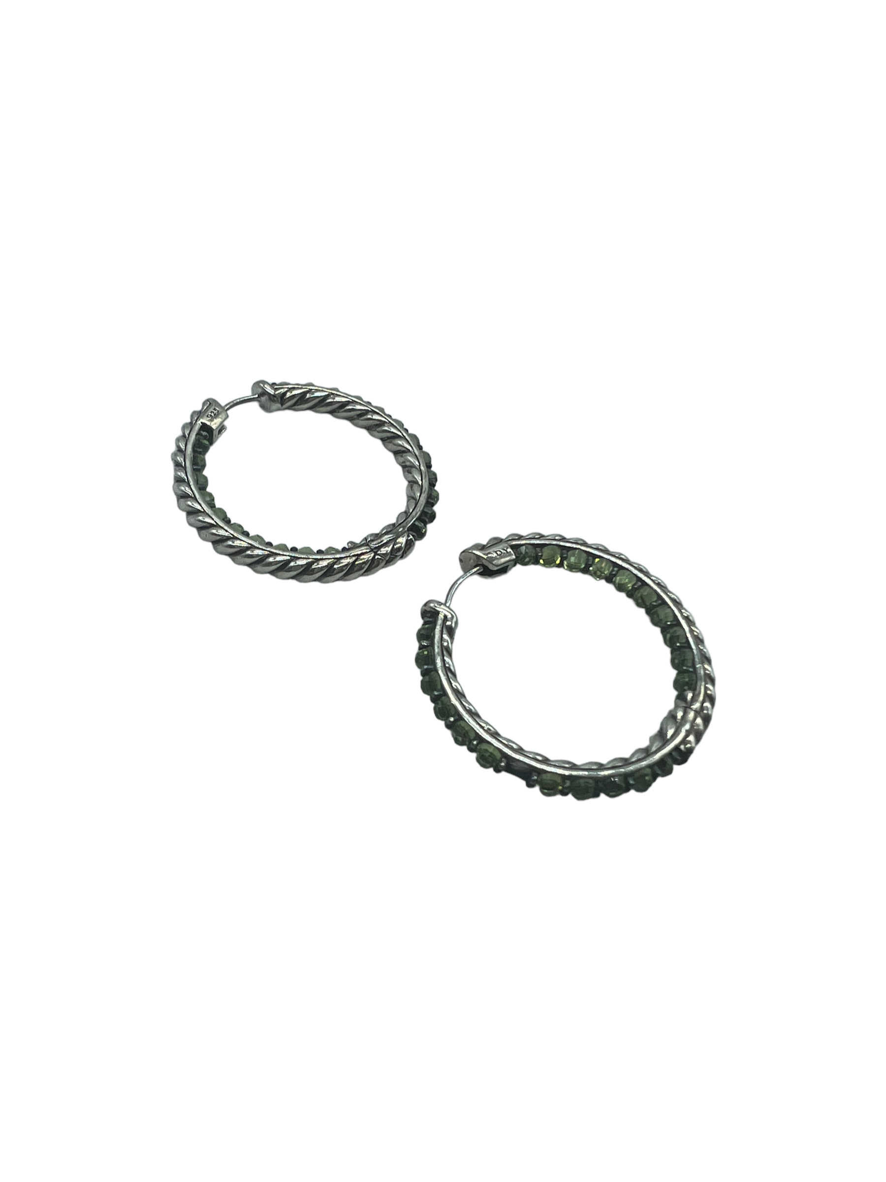 Sterling silver Prasioite Berries hoop earrings with dust bag. Missing one gemstone.