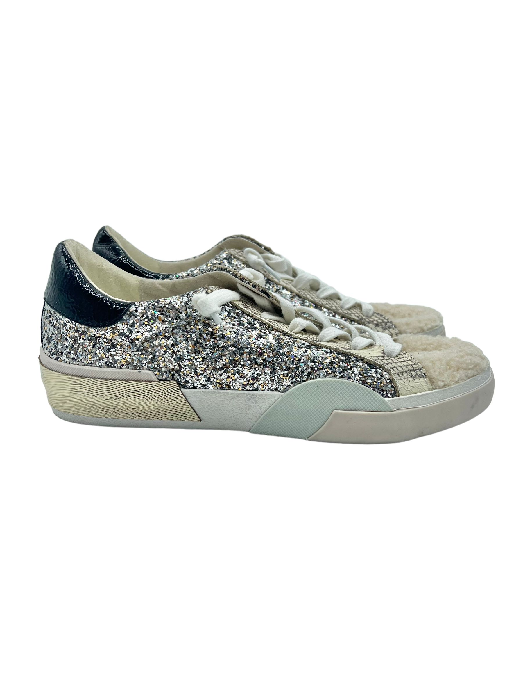 Silver glitter Zina low top distressed sneakers with shearling toe detail and black patent trim.