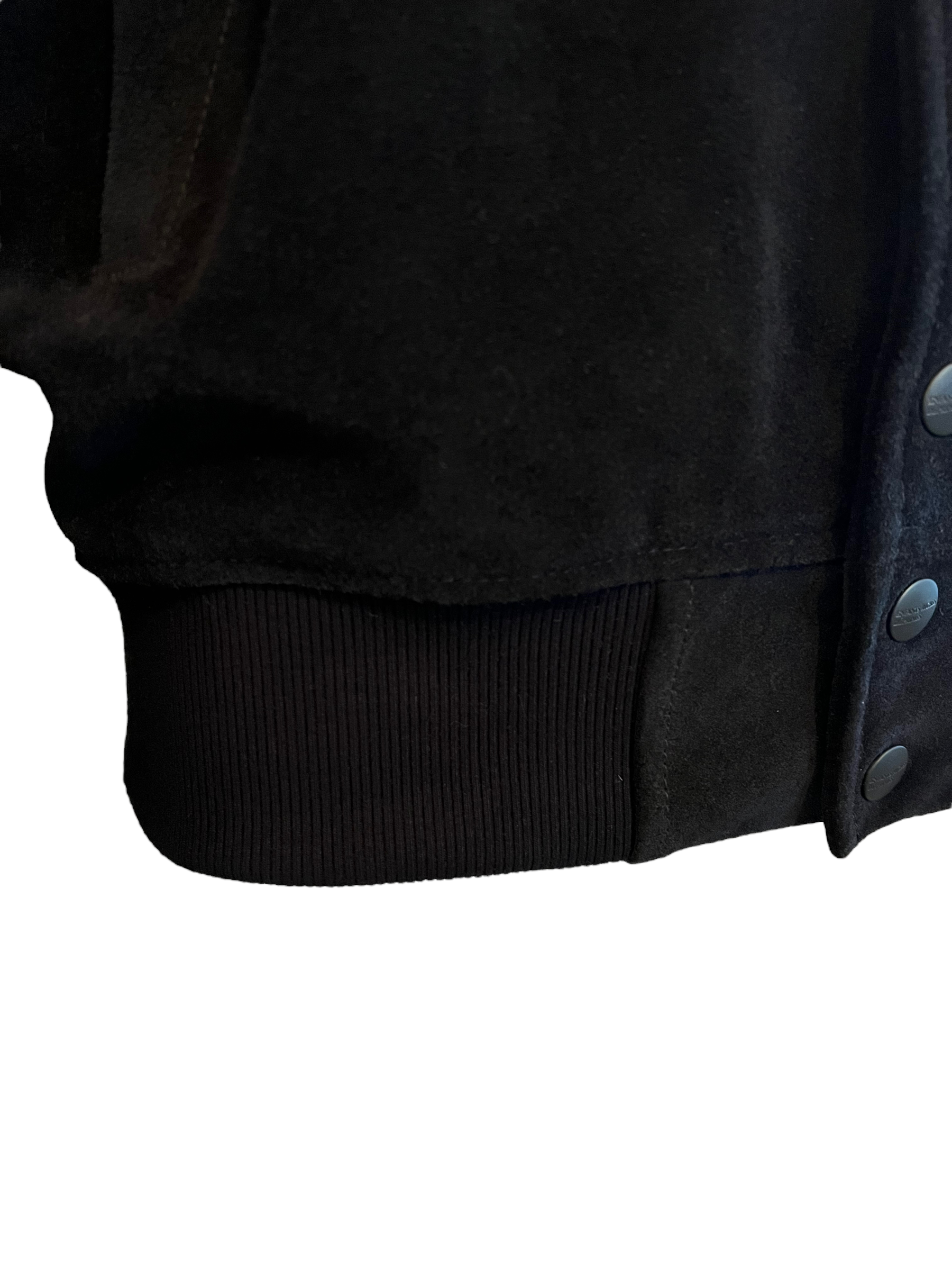 Black suede snap button bomber jacket with white embroidery detail on back.