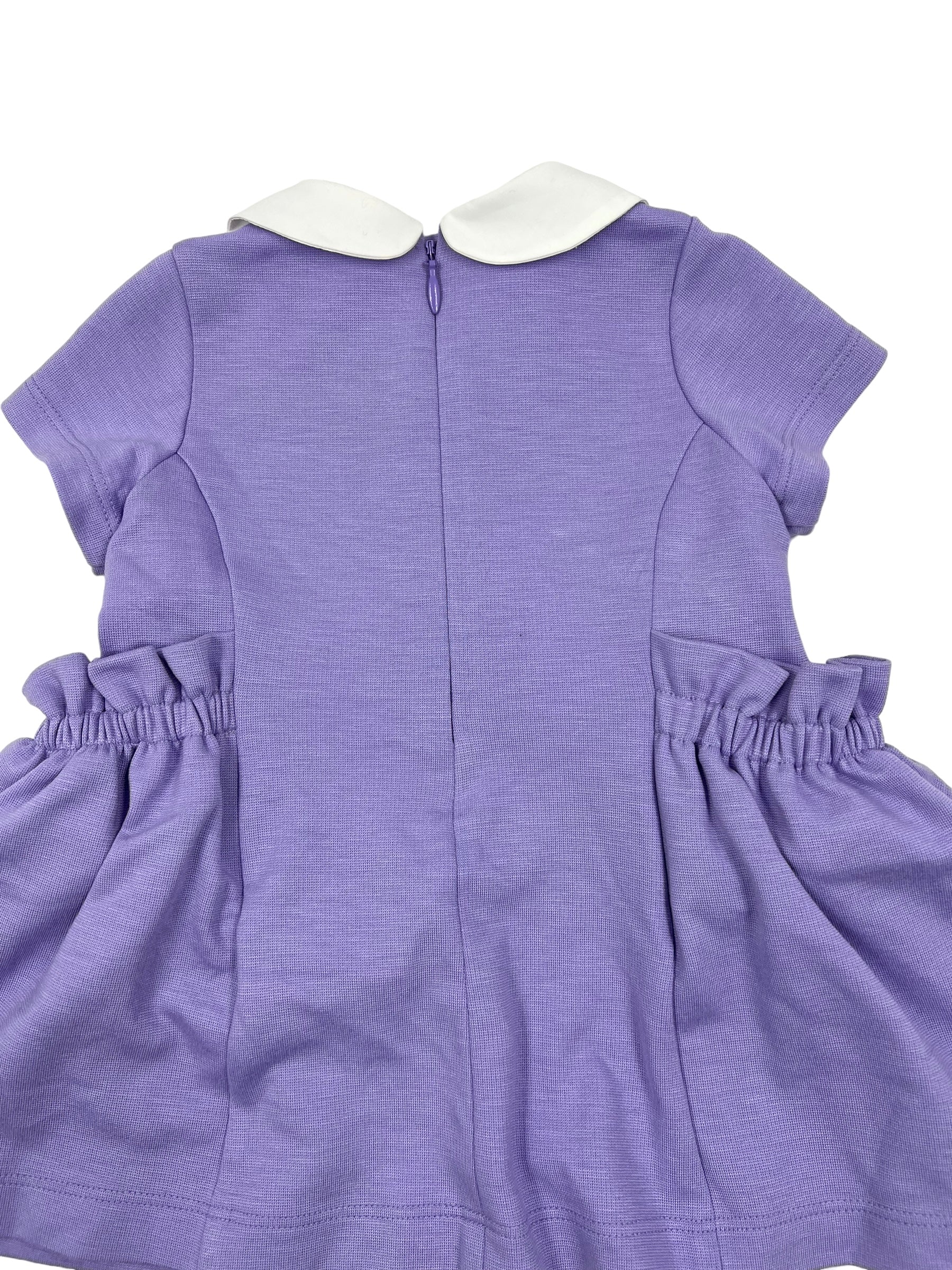 Purple dress with white Peter Pan collar and ruffle side pockets. Features back zip closure and pink embroidered logo.