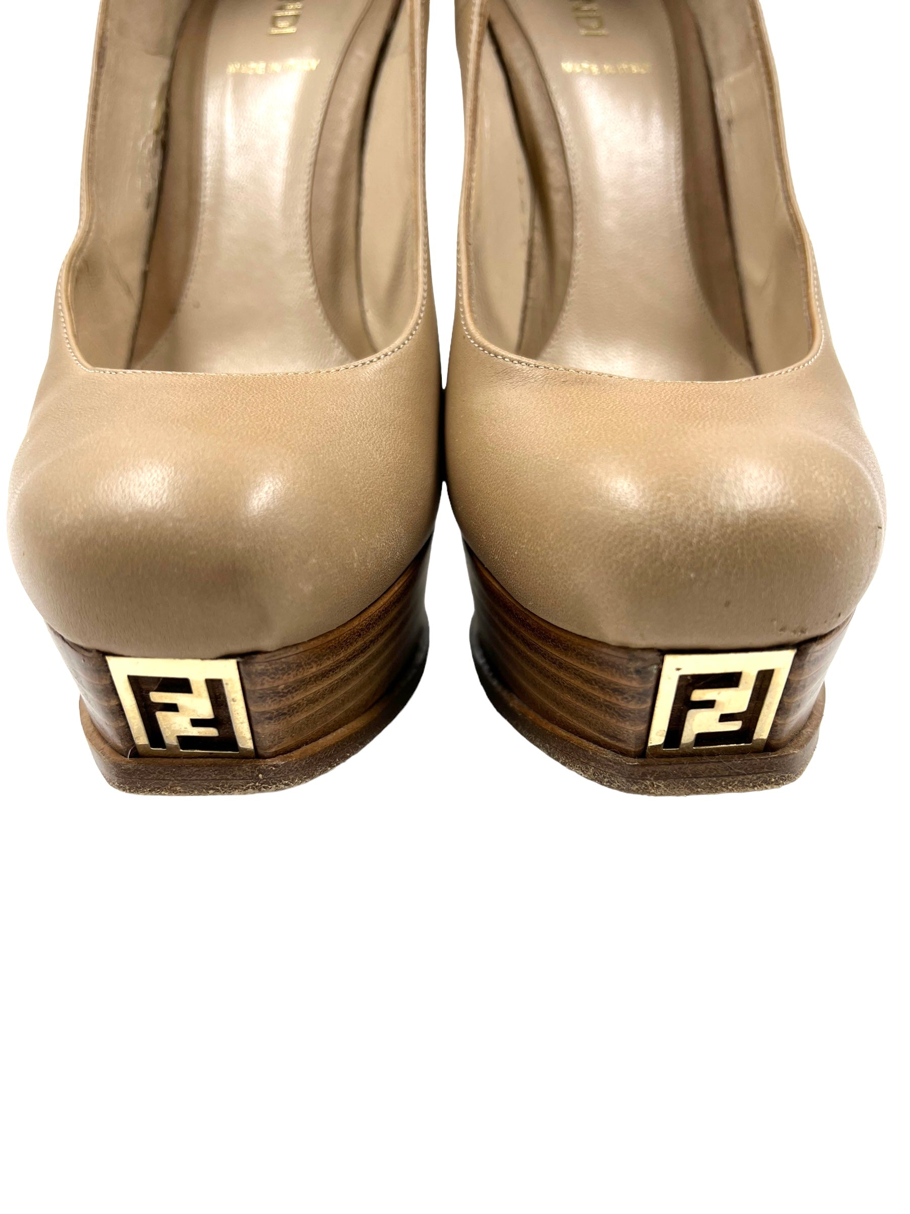 Nude leather 'Fendista' platform heels with gold logo toe detail. Comes with dust bag and box.