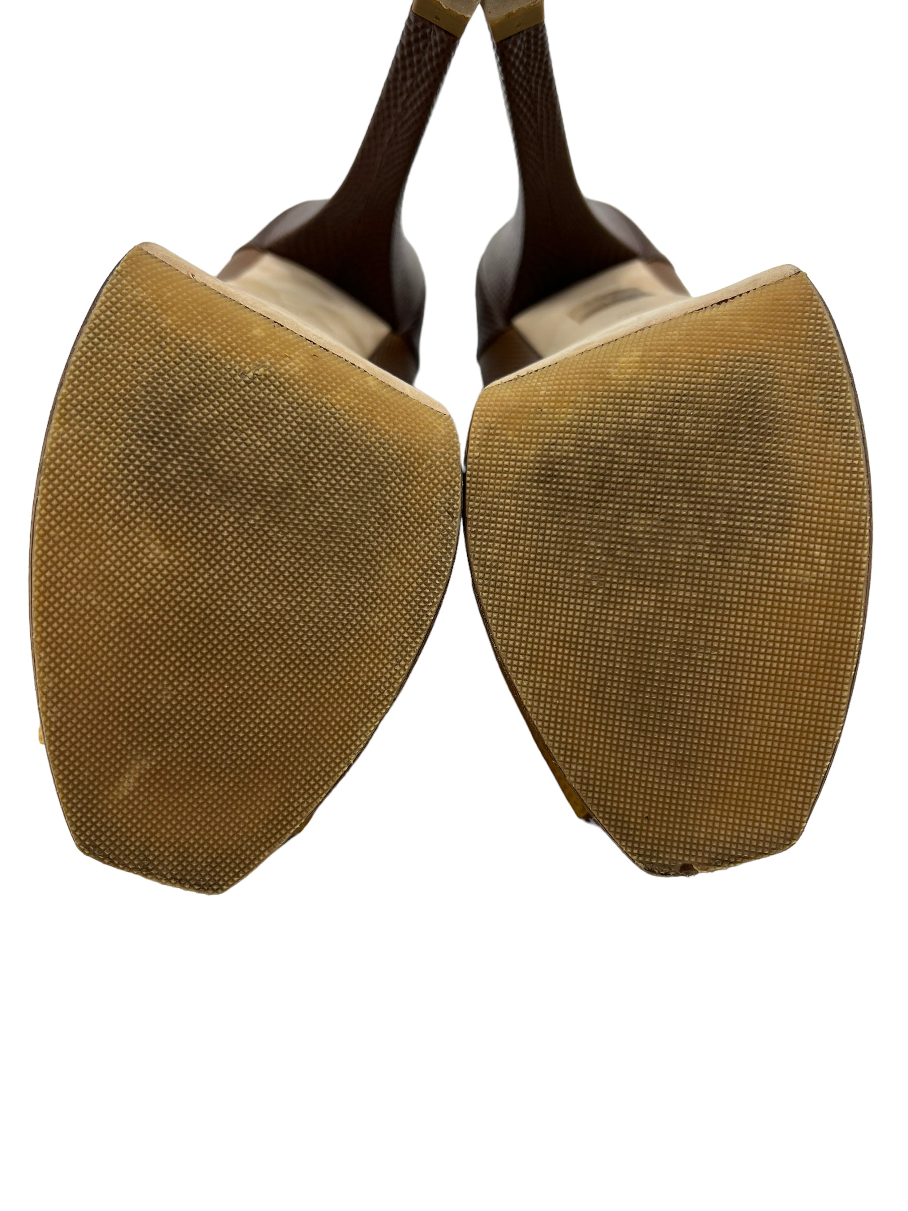 Yellow/tan/brown color block leather lizard embossed 'Fendista' open toe platform heels with gold logo toe detail. Comes with dust bag and box.