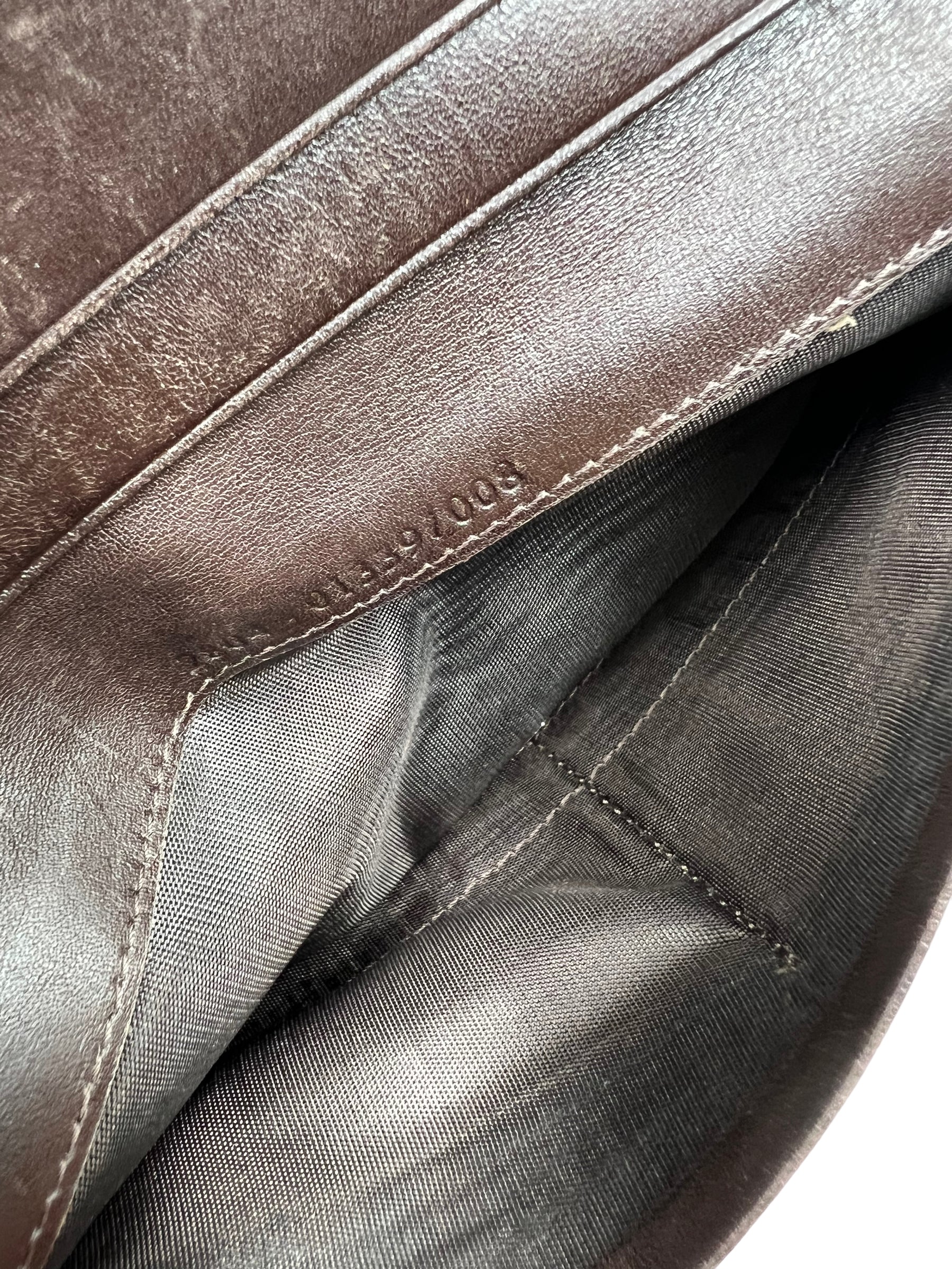 Zucca print canvas front flap wallet with brown leather trim/details. Features front exterior slip pocket, six interior card slots and three interior slip pockets. Does not come with dust bag or box.