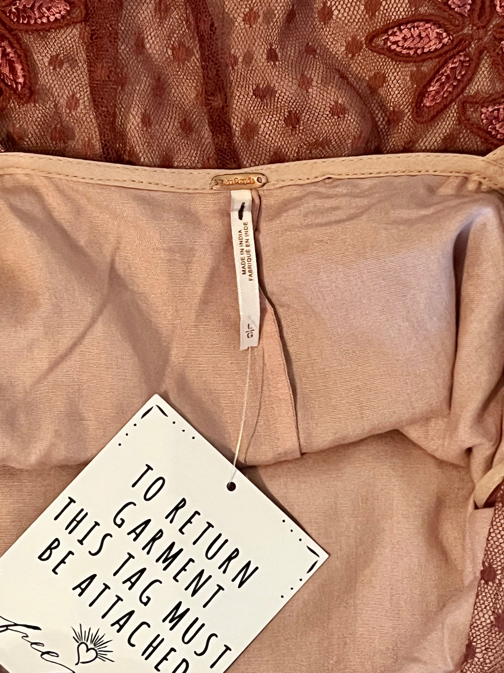 Mauve lace embroidered lined Sundown mini dress with tassel back tie.