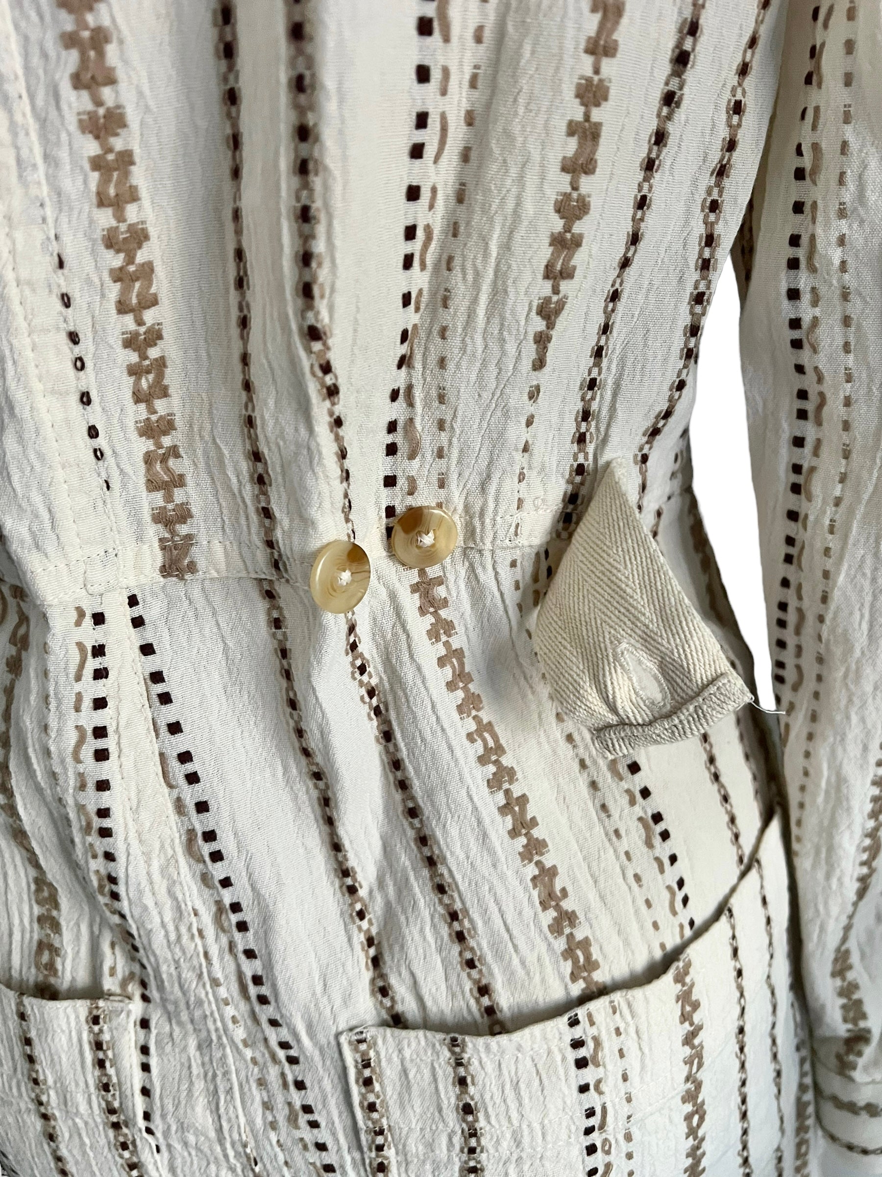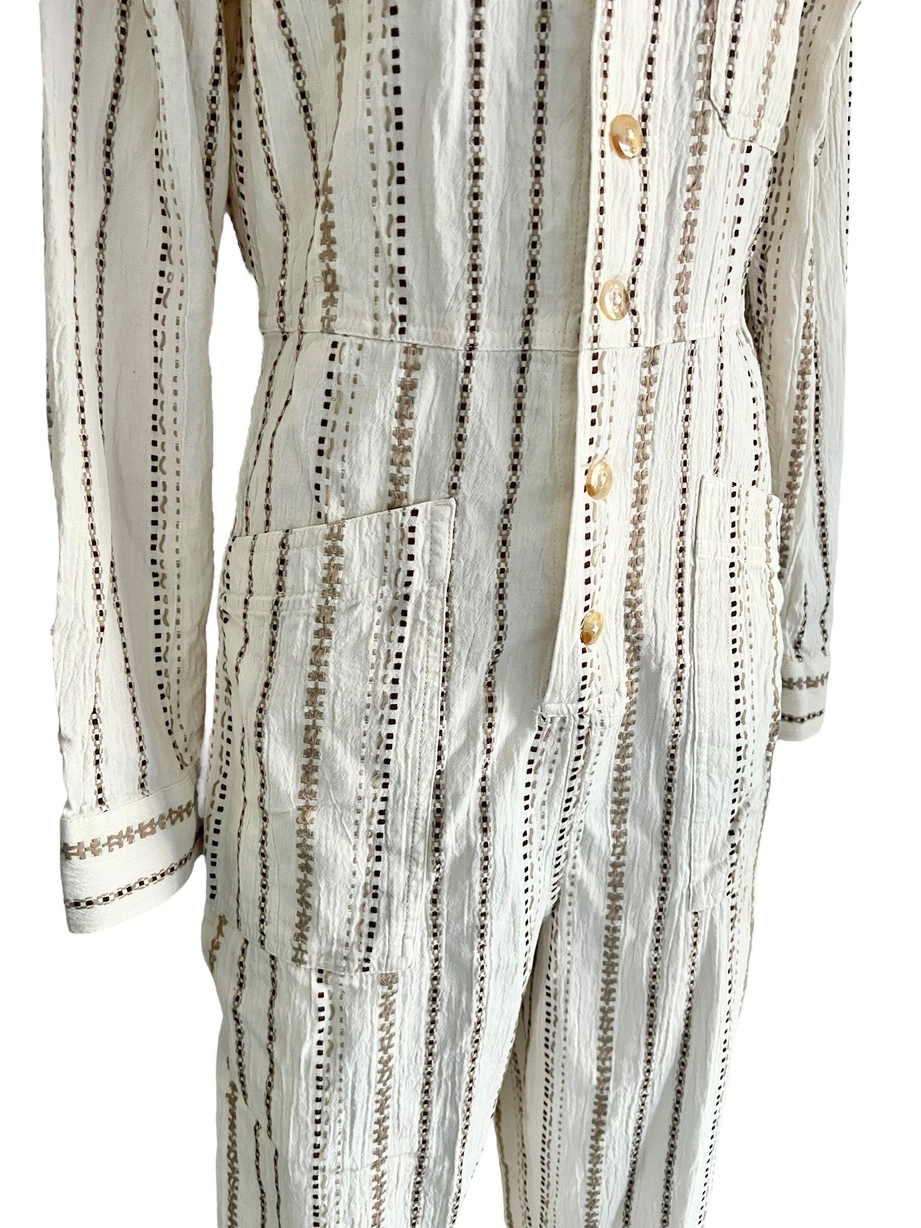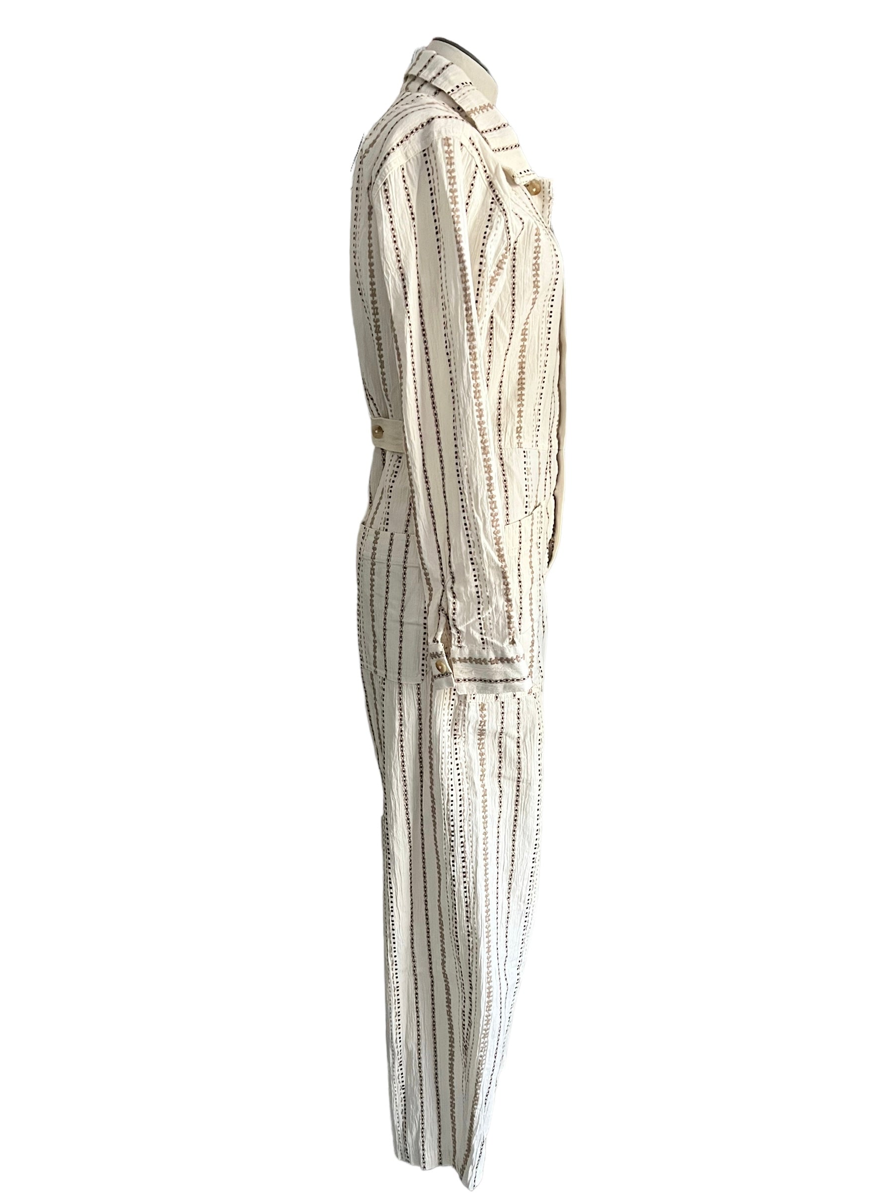 Cream/neutral Gia stitch/embroidered stripe half button coverall/jumpsuit with front and back pockets. Features back adjustable buttons to tighten at waist.