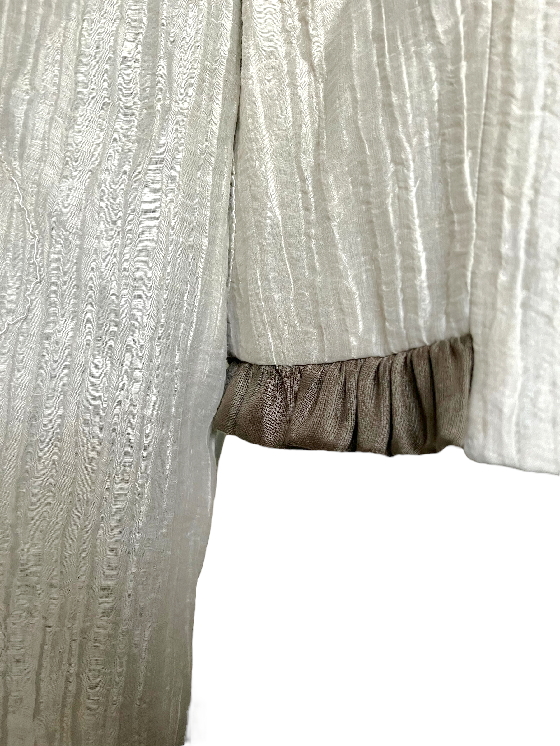 Beige textured linen blend jacket with brown ruffle silk trim. Comes with original tags