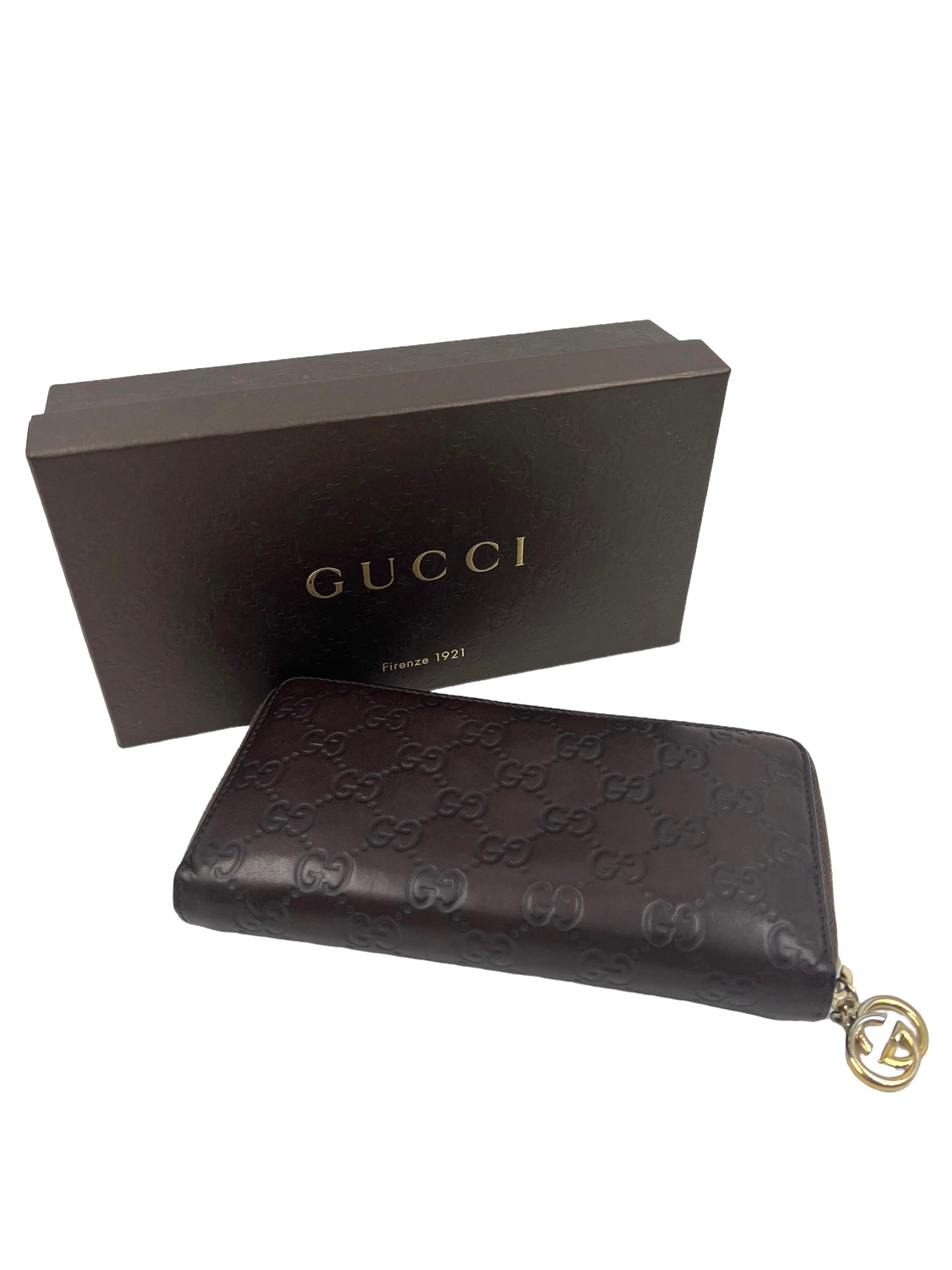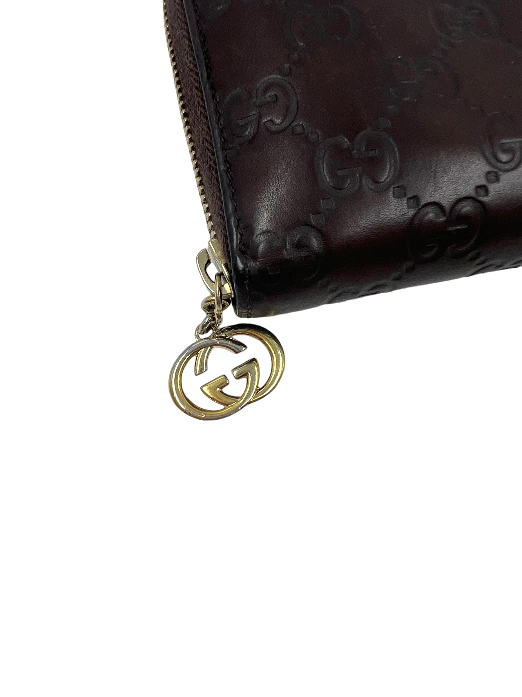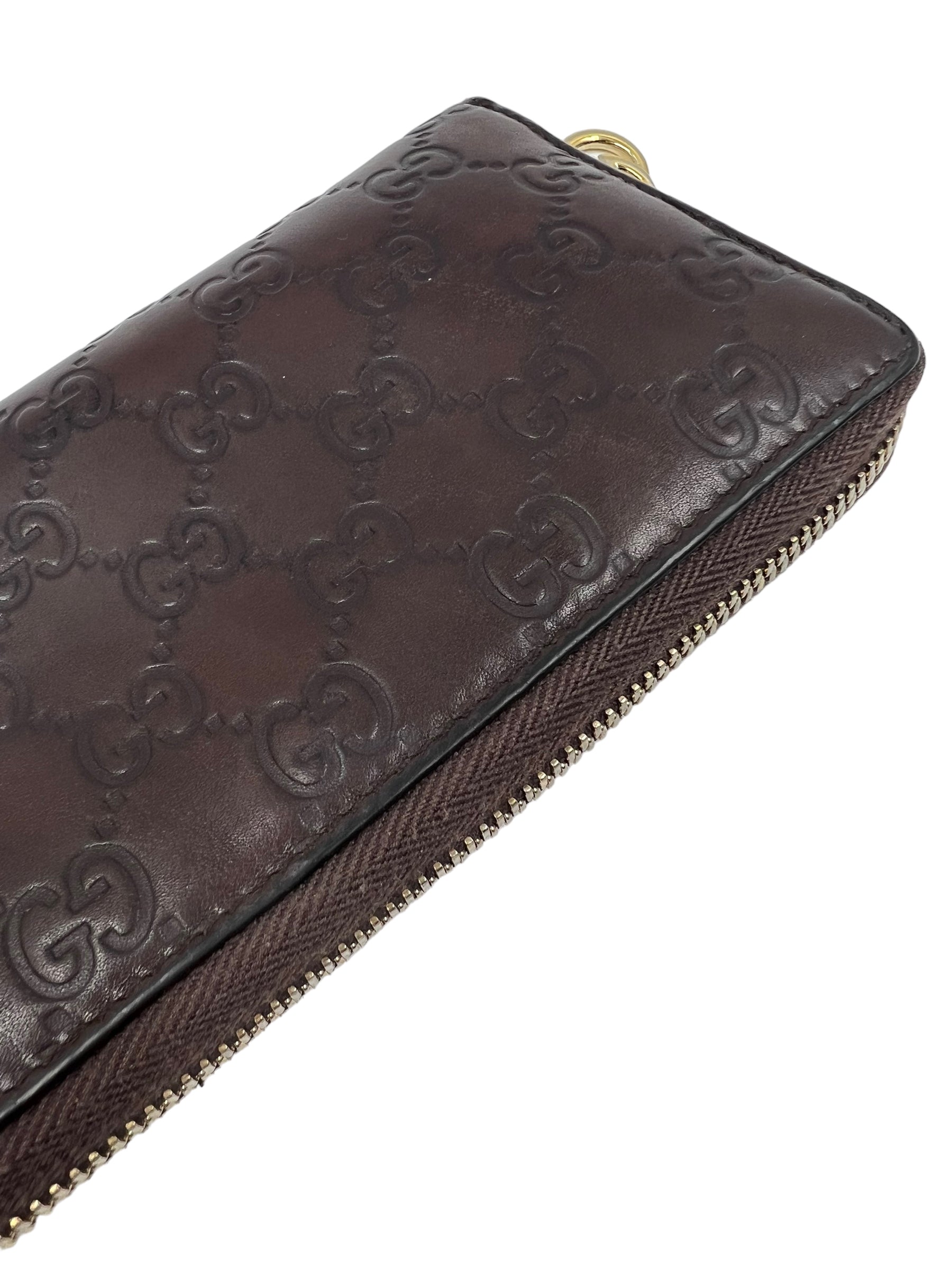 Chocolate brown leather Guccissima zip around wallet with gold hardware. Comes with dust bag, box and original cards.