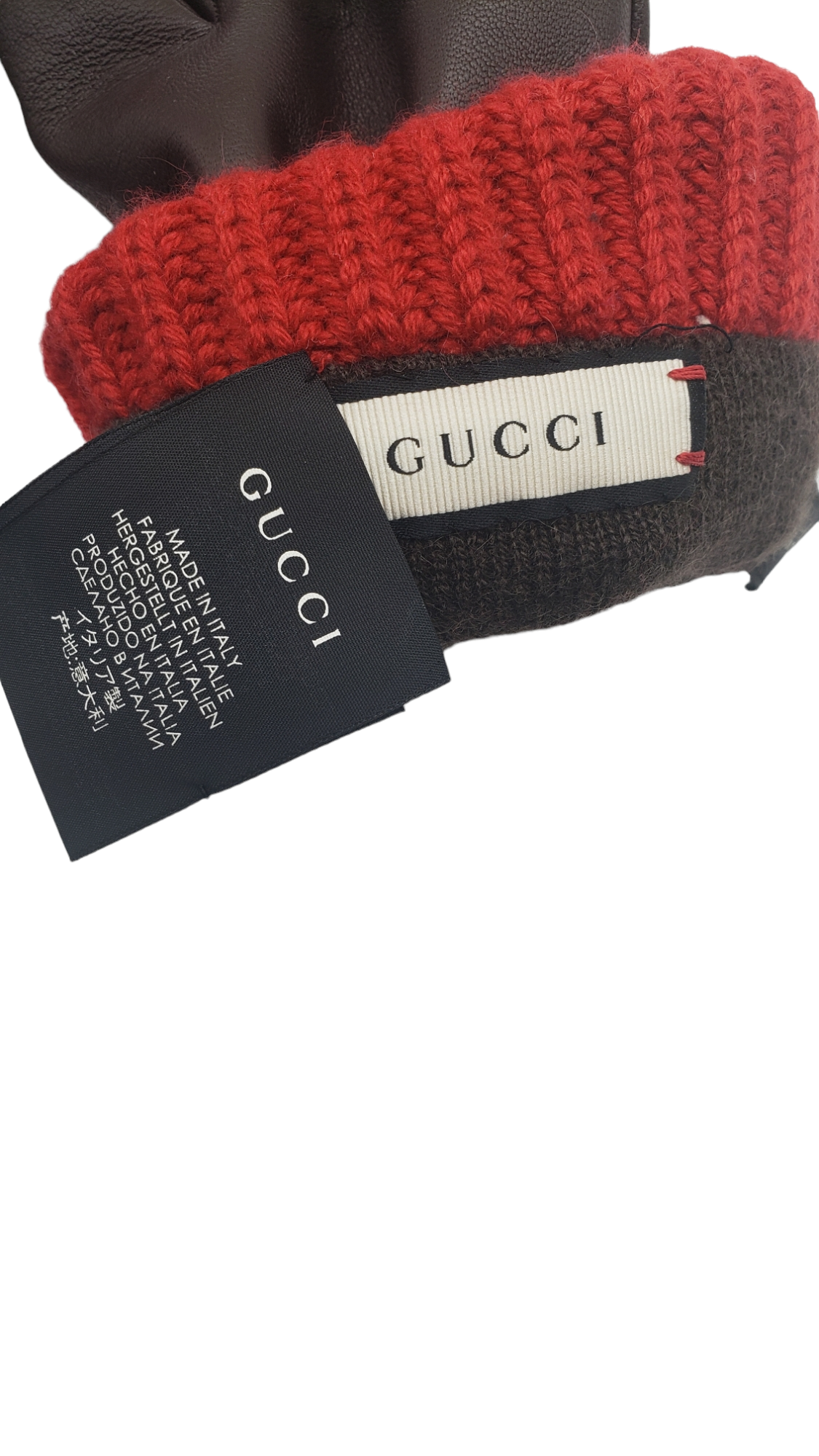 Brown leather gloves with red and navy stripe ribbed knit trim. Comes with dust bag
