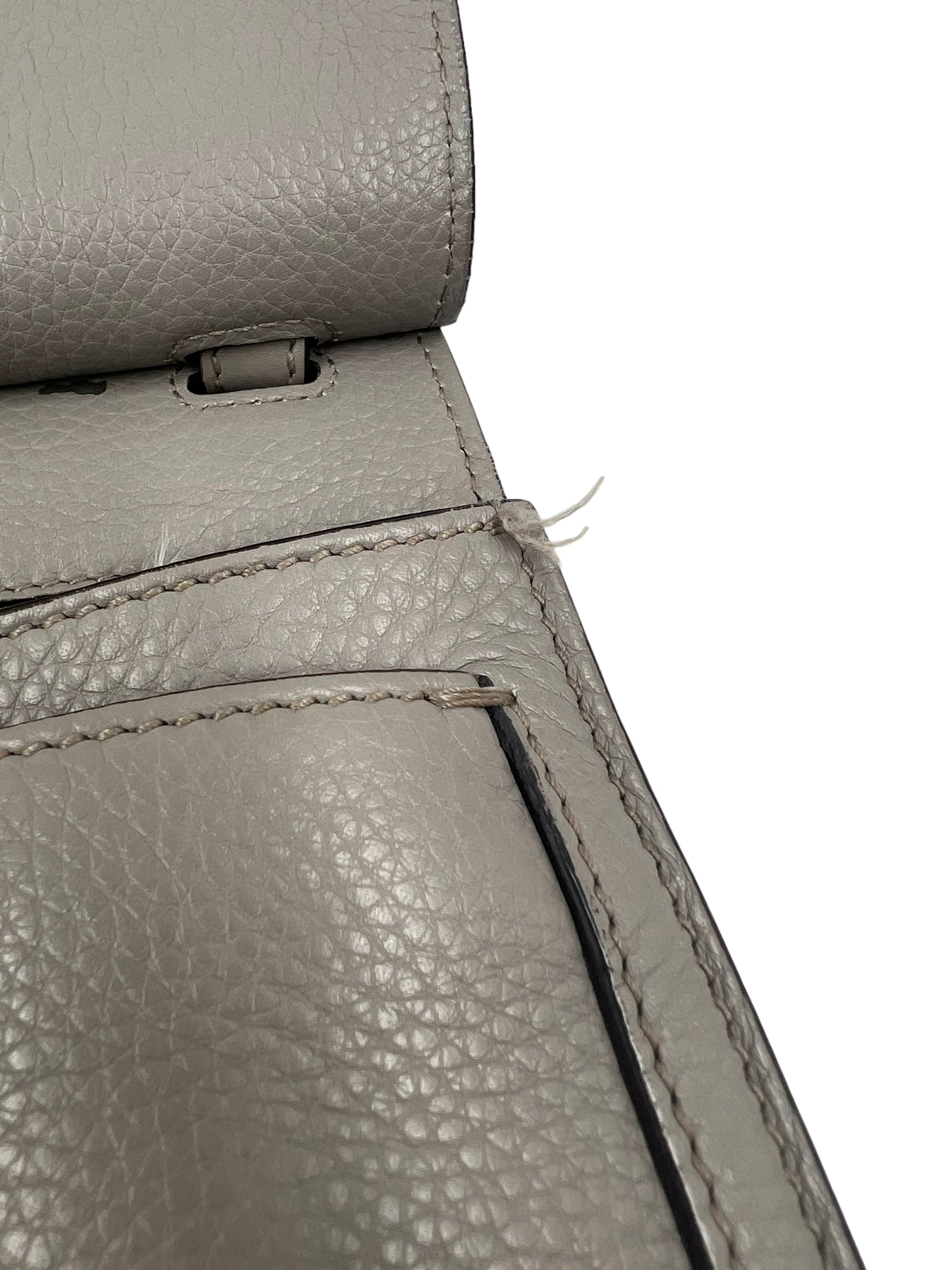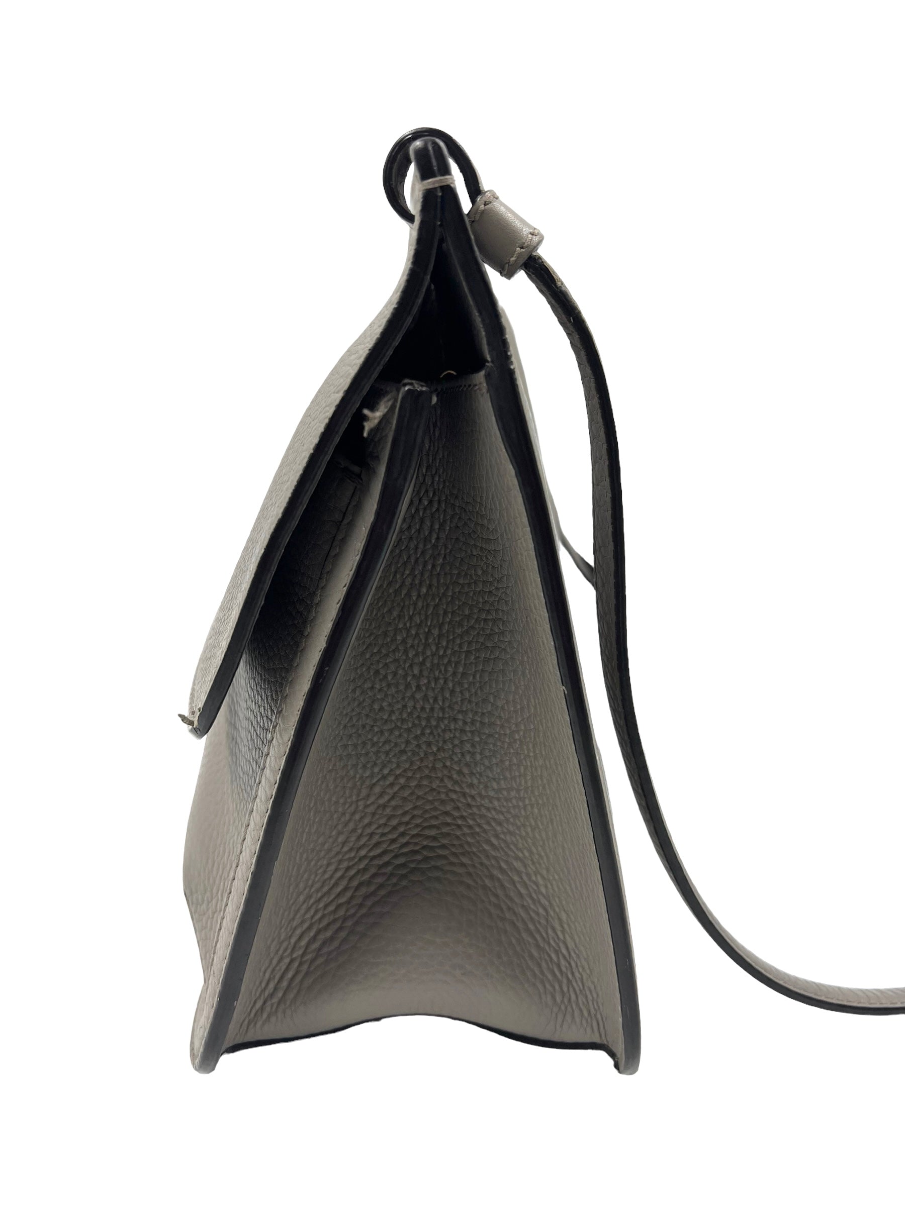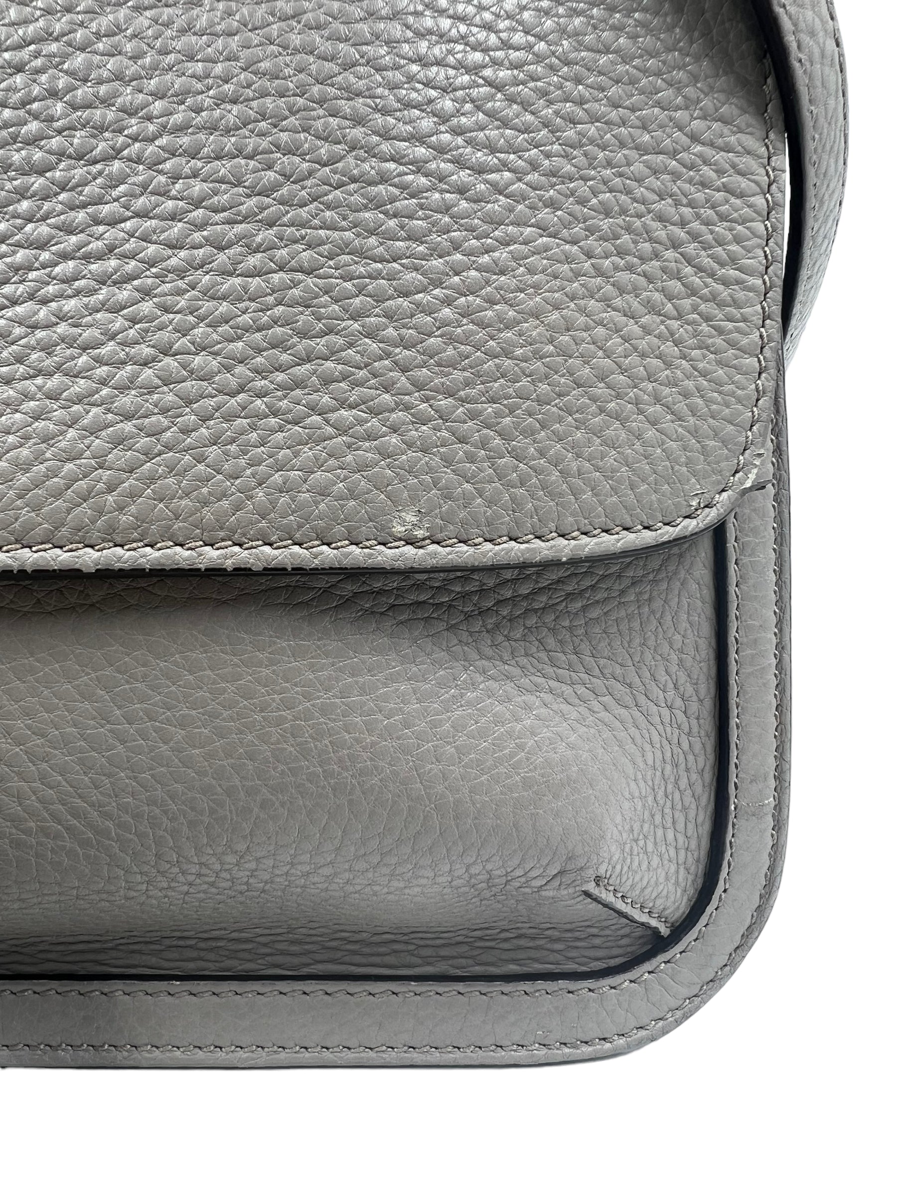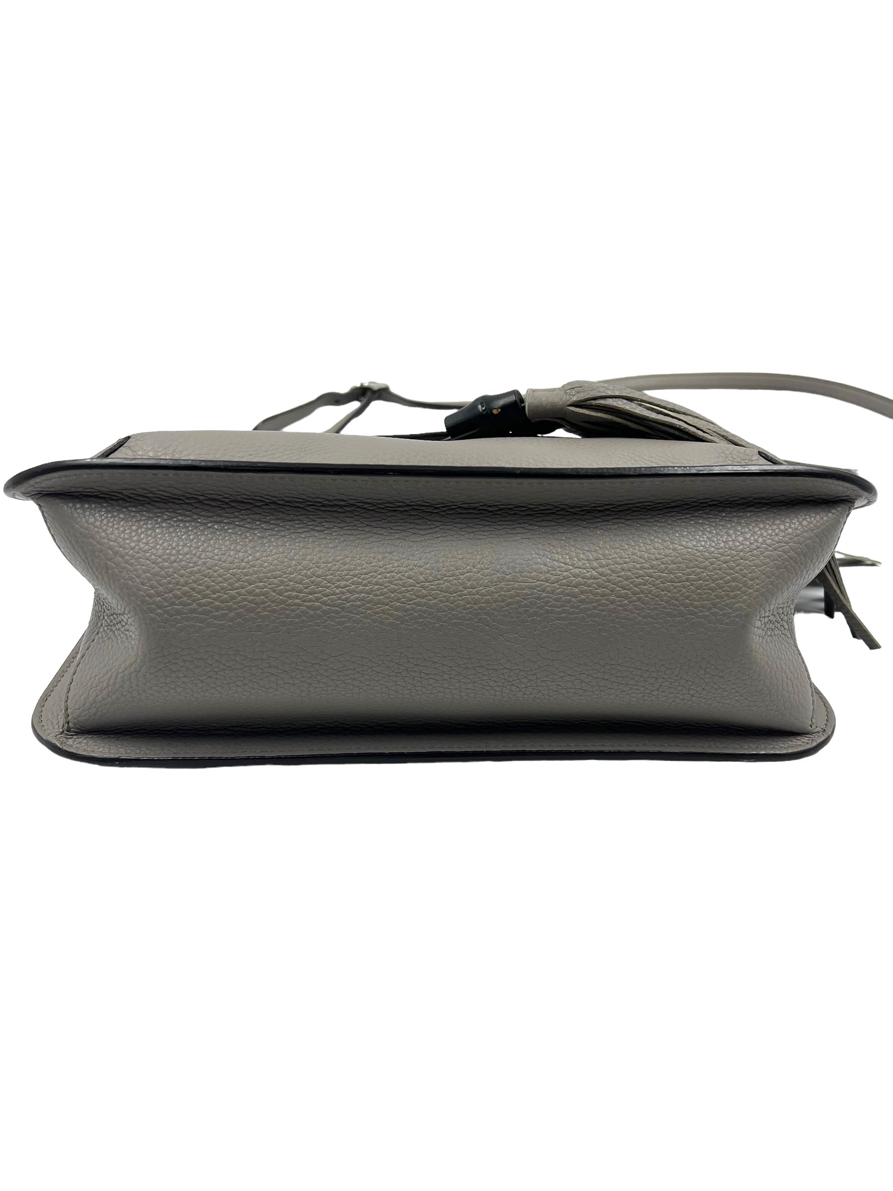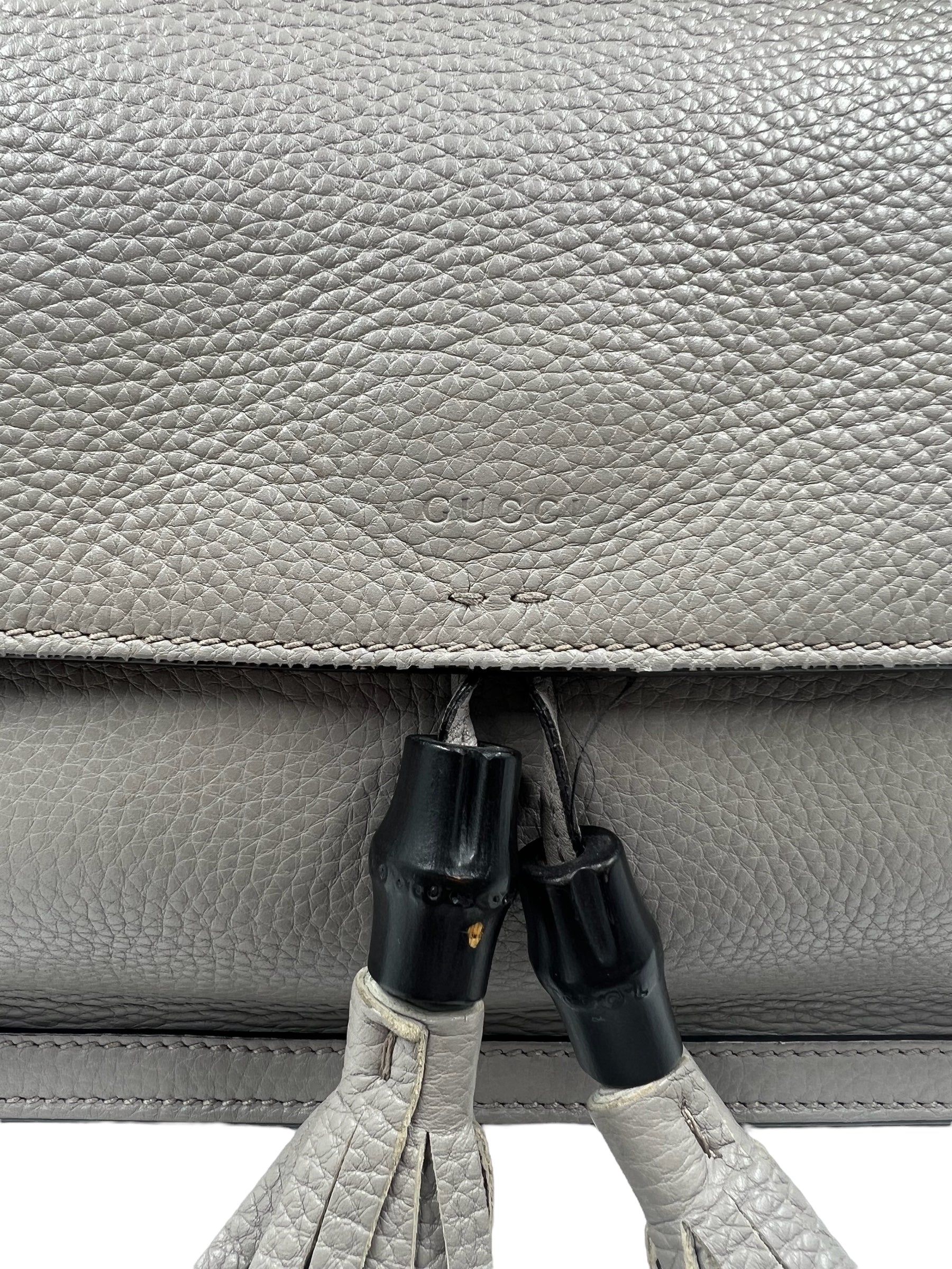 Gray pebble leather medium Bamboo Daily Flap bag with adjustable long strap and bamboo tassel detail. Comes with dust bag.