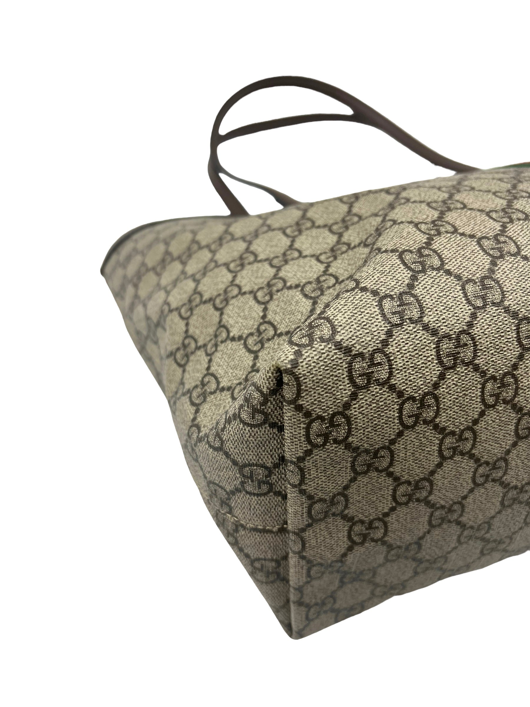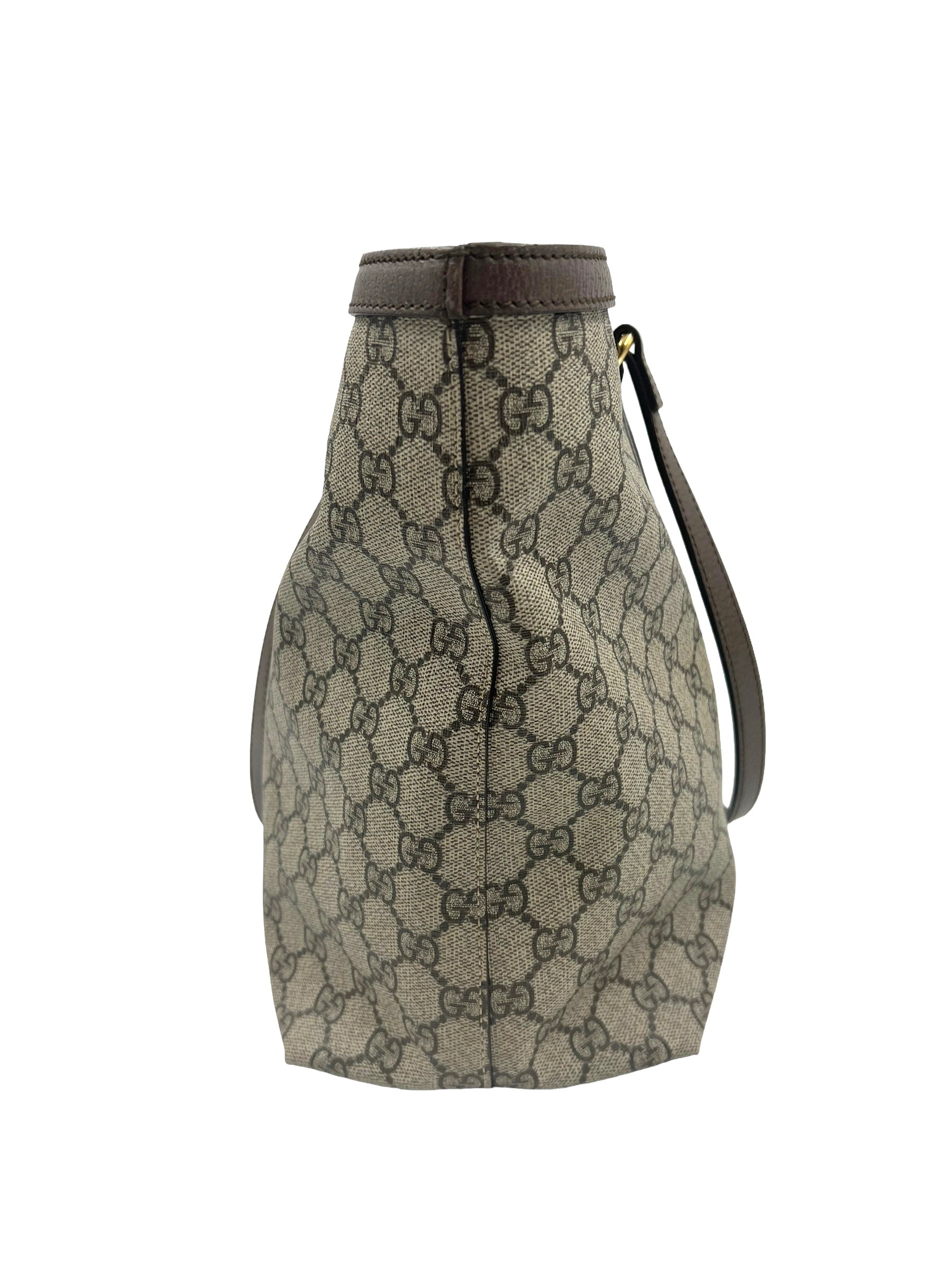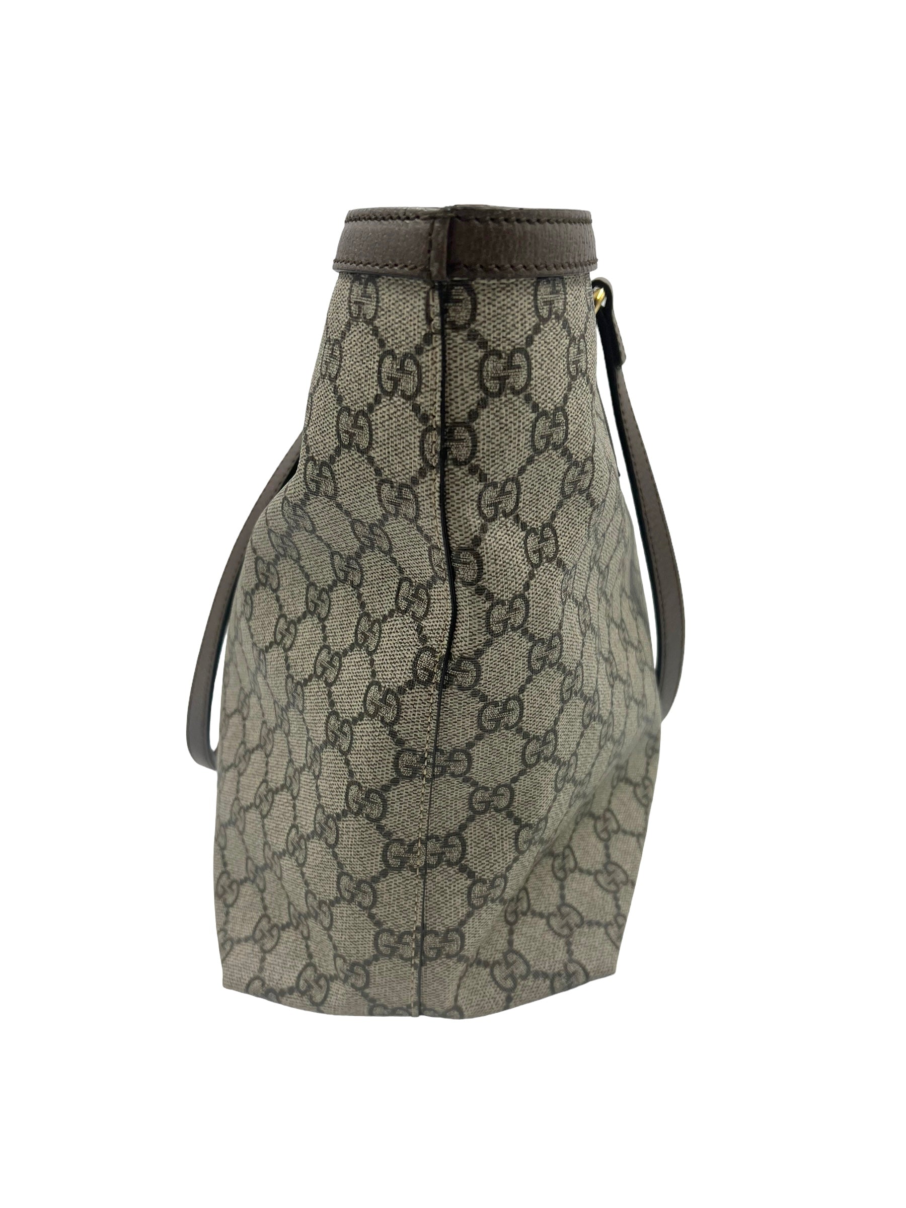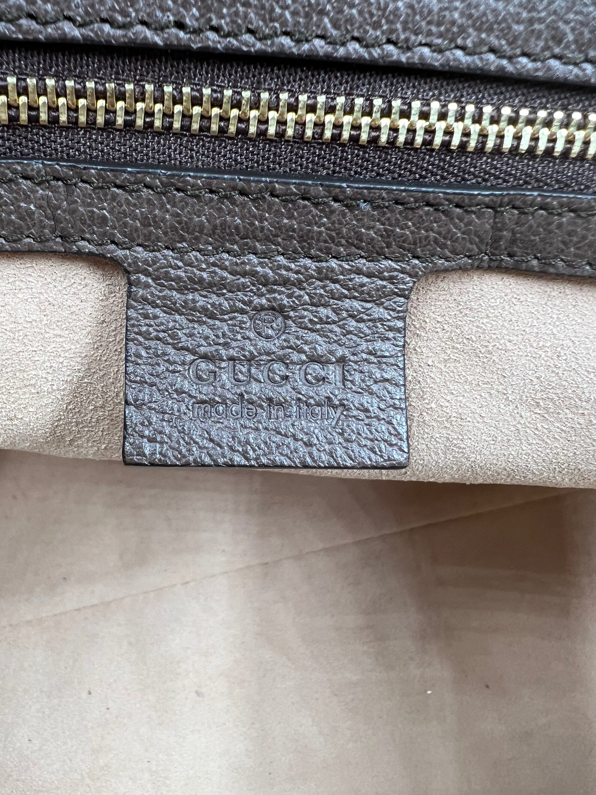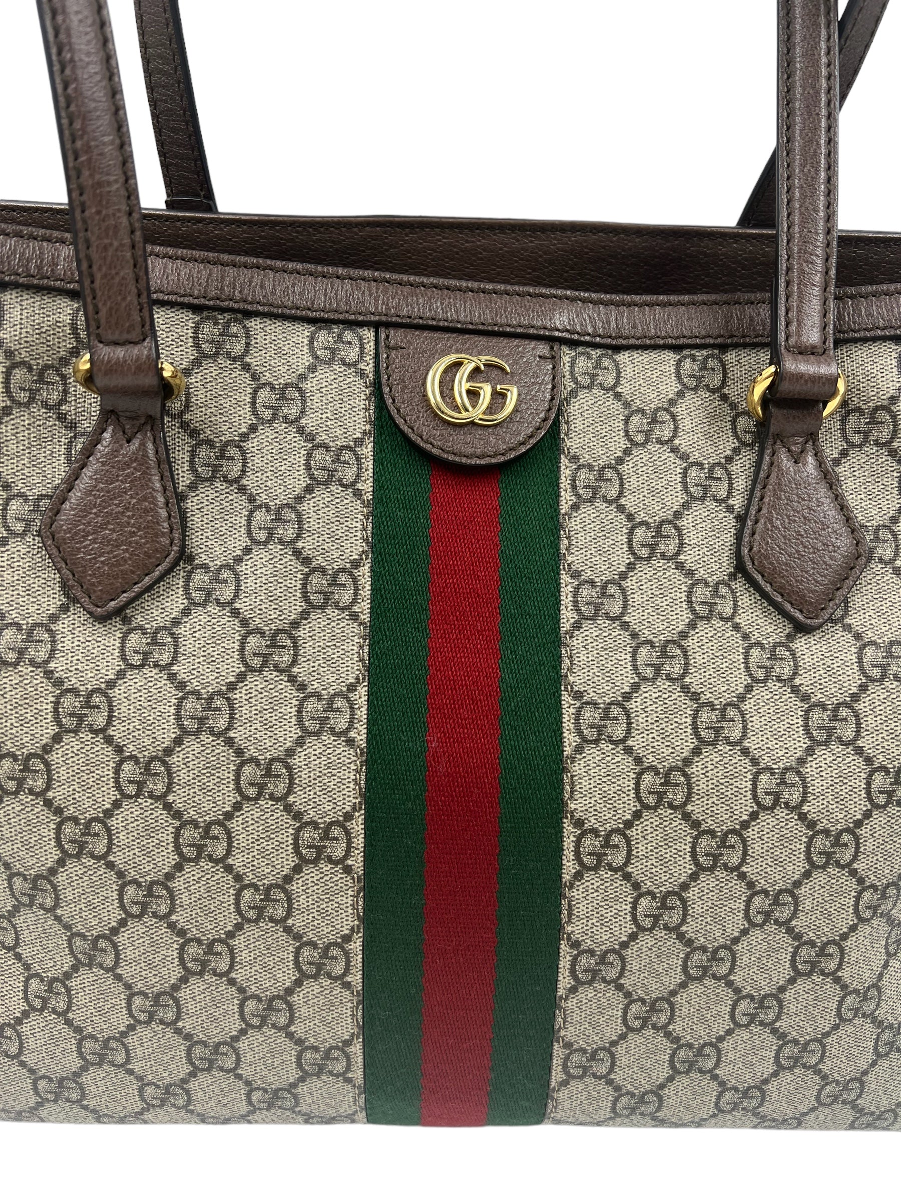 Brown GG coated canvas medium Ophidia tote with green and red web stripe detail, gold hardware and leather trim. Does not come with dust bag or box.
