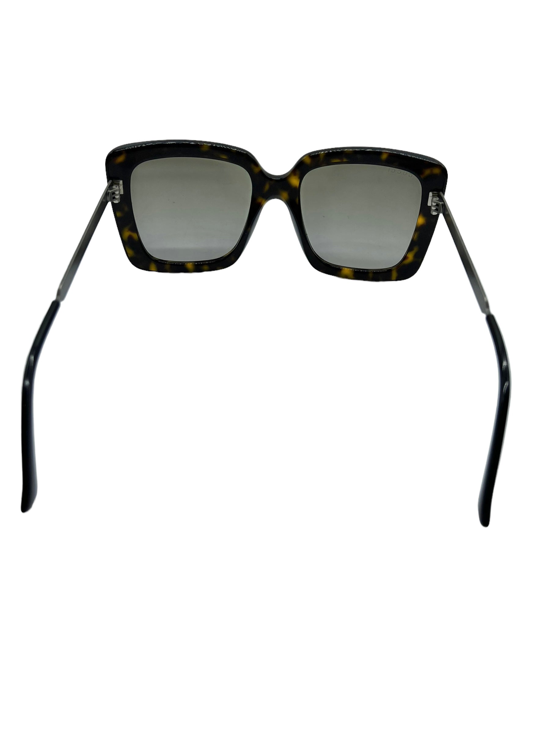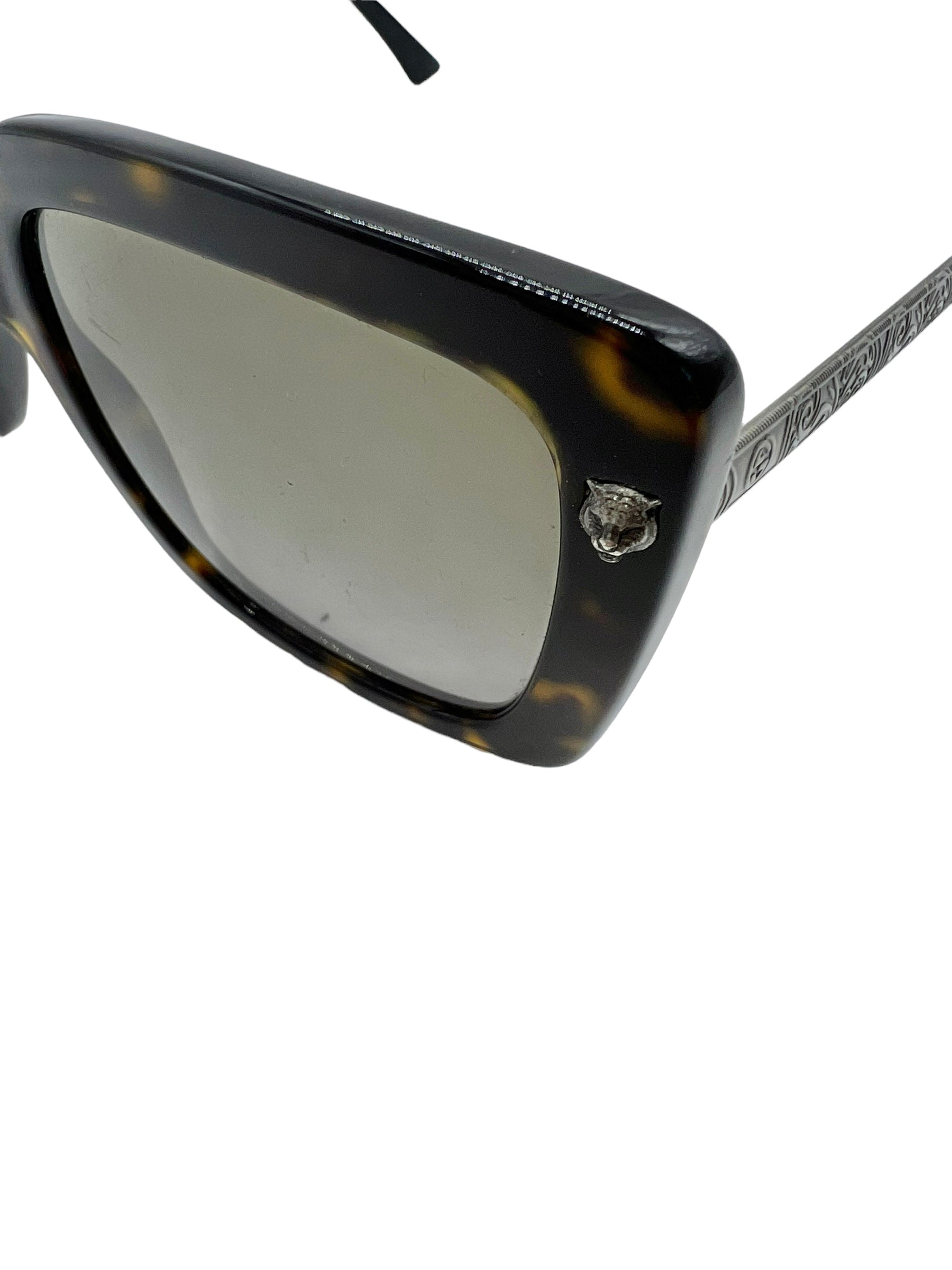 Tortoise oversize square sunglasses with silver antique arms and tiger head detail. Comes with case.