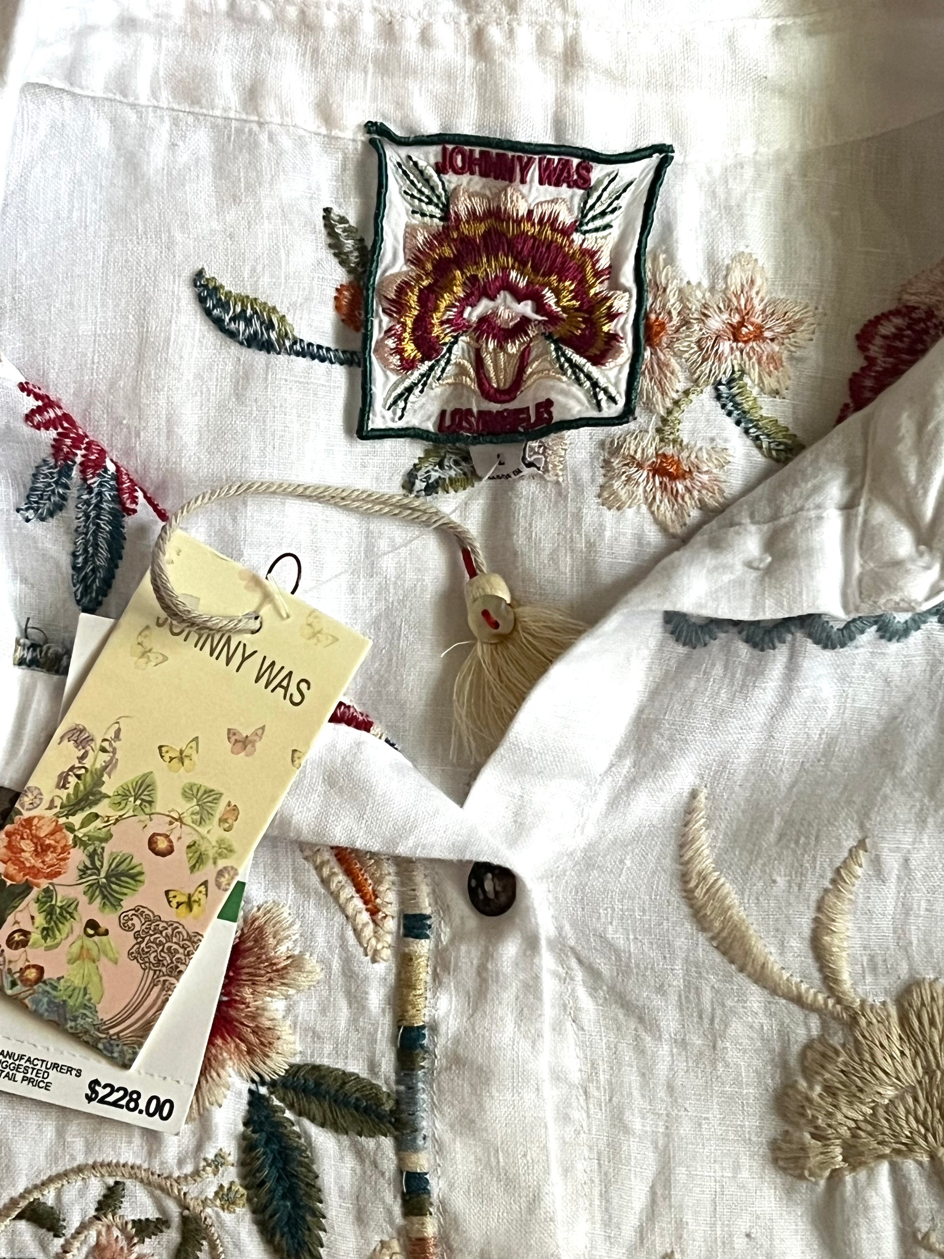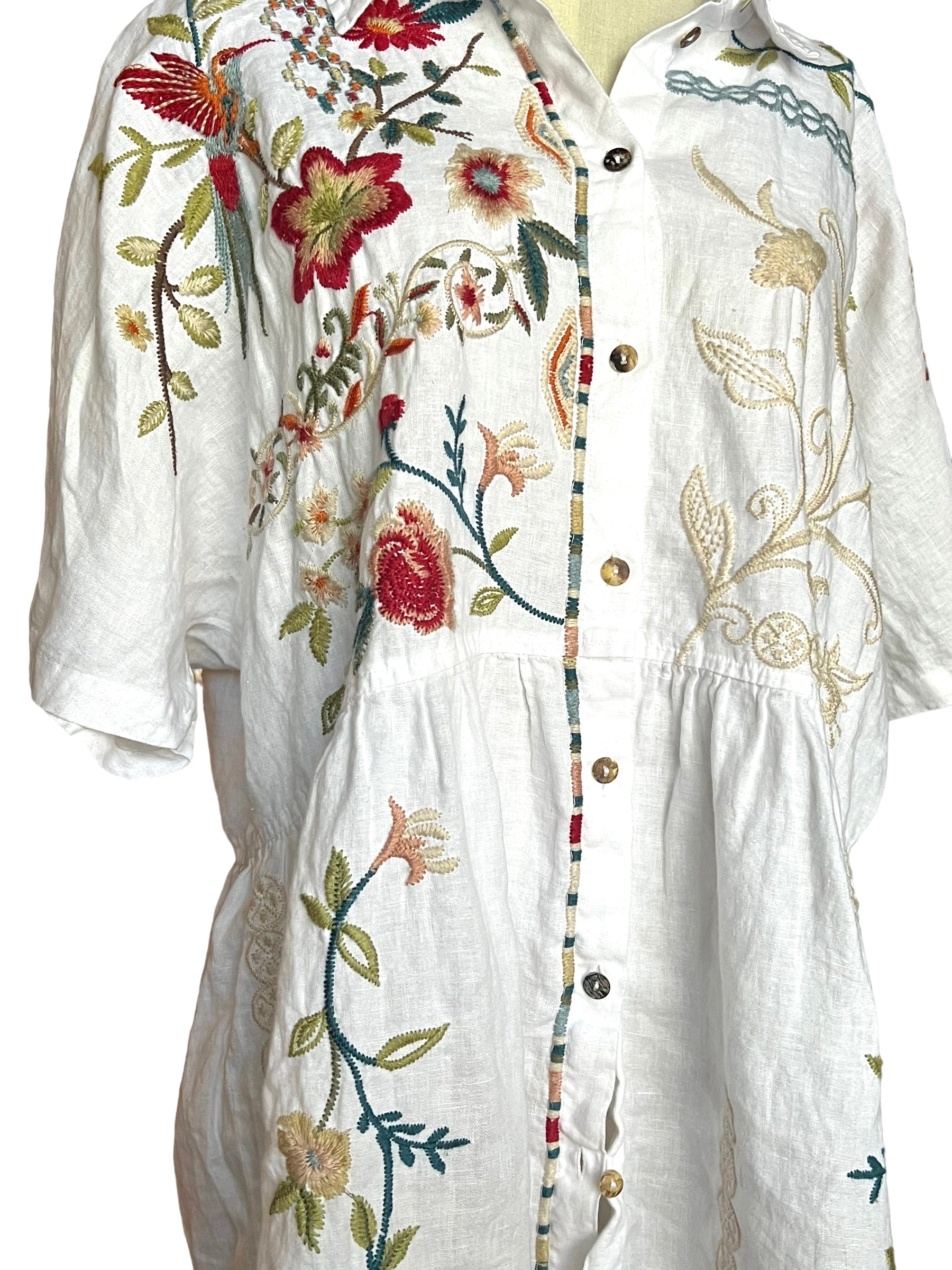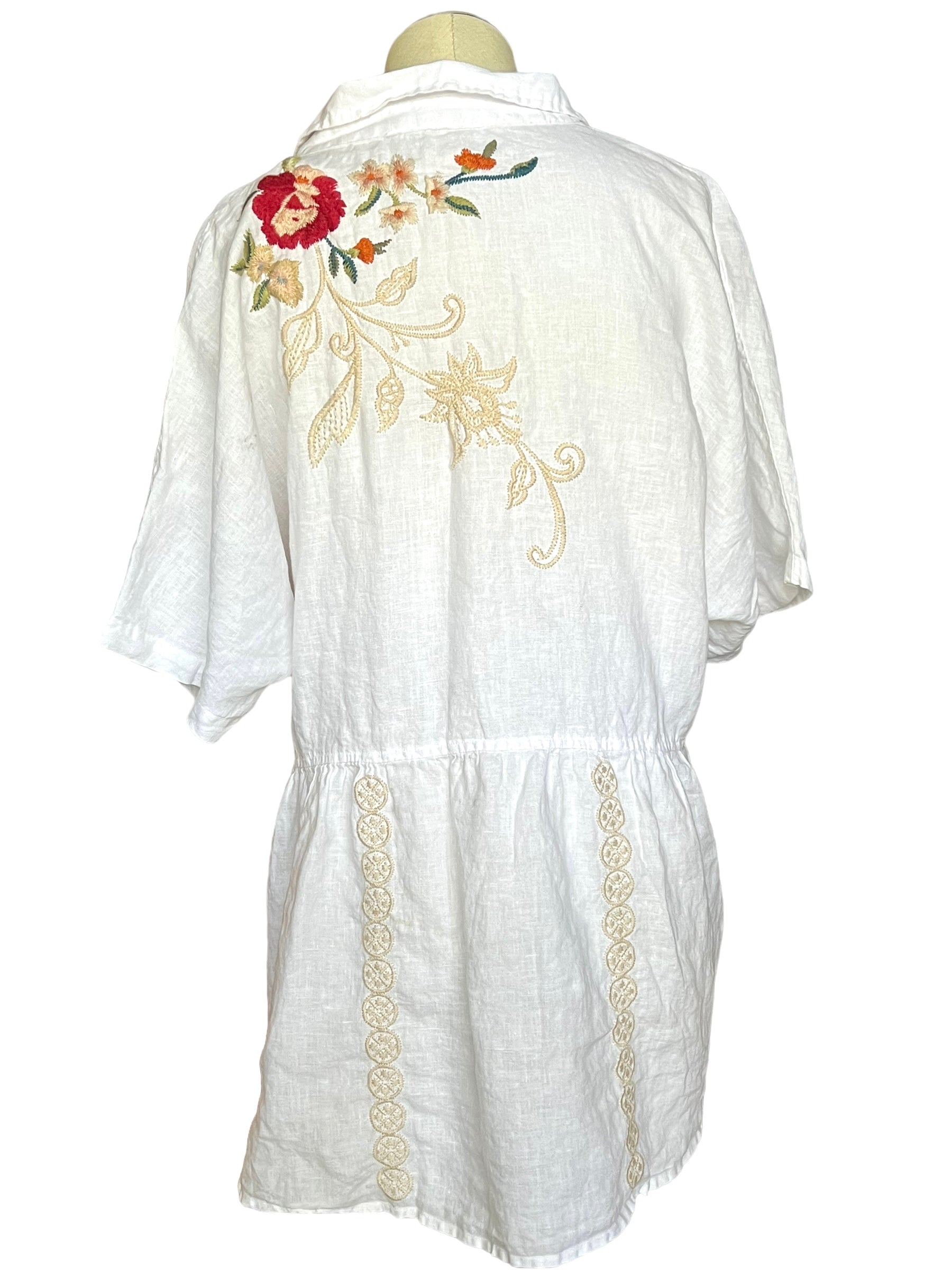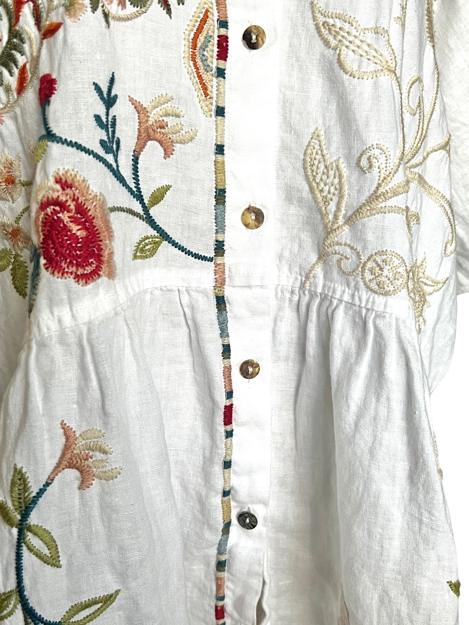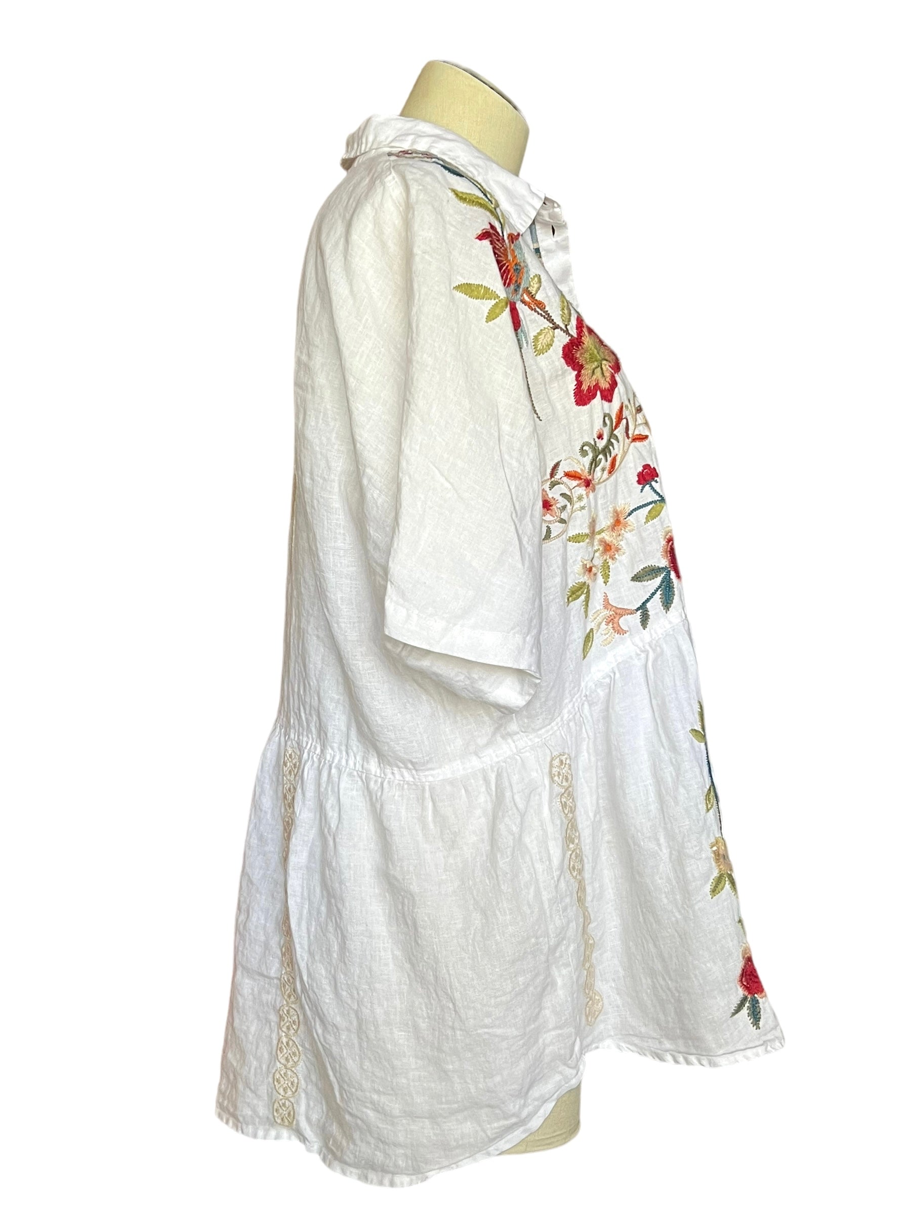 White embroidered button down linen Ellia peplum tunic. Comes with original tags.