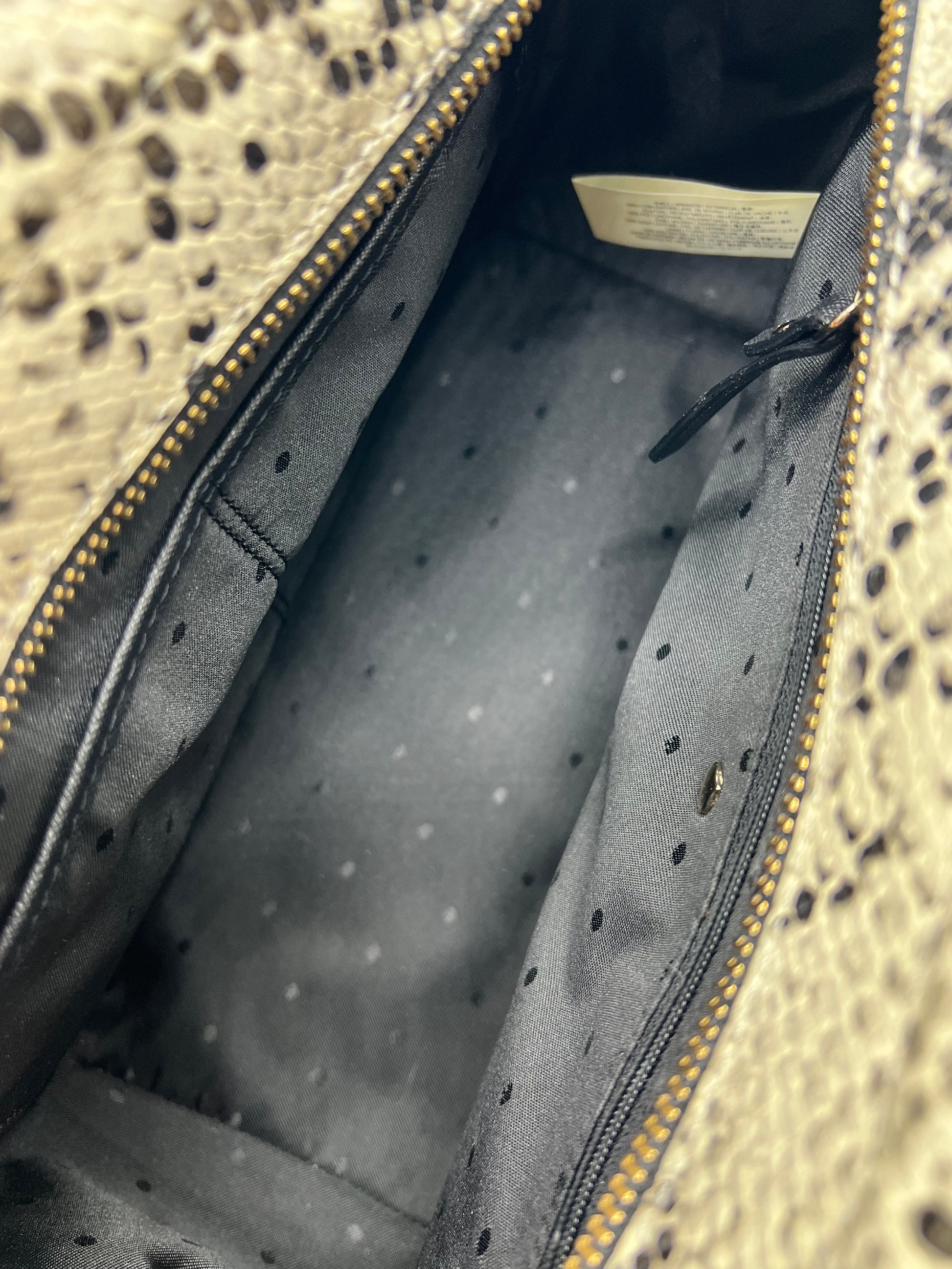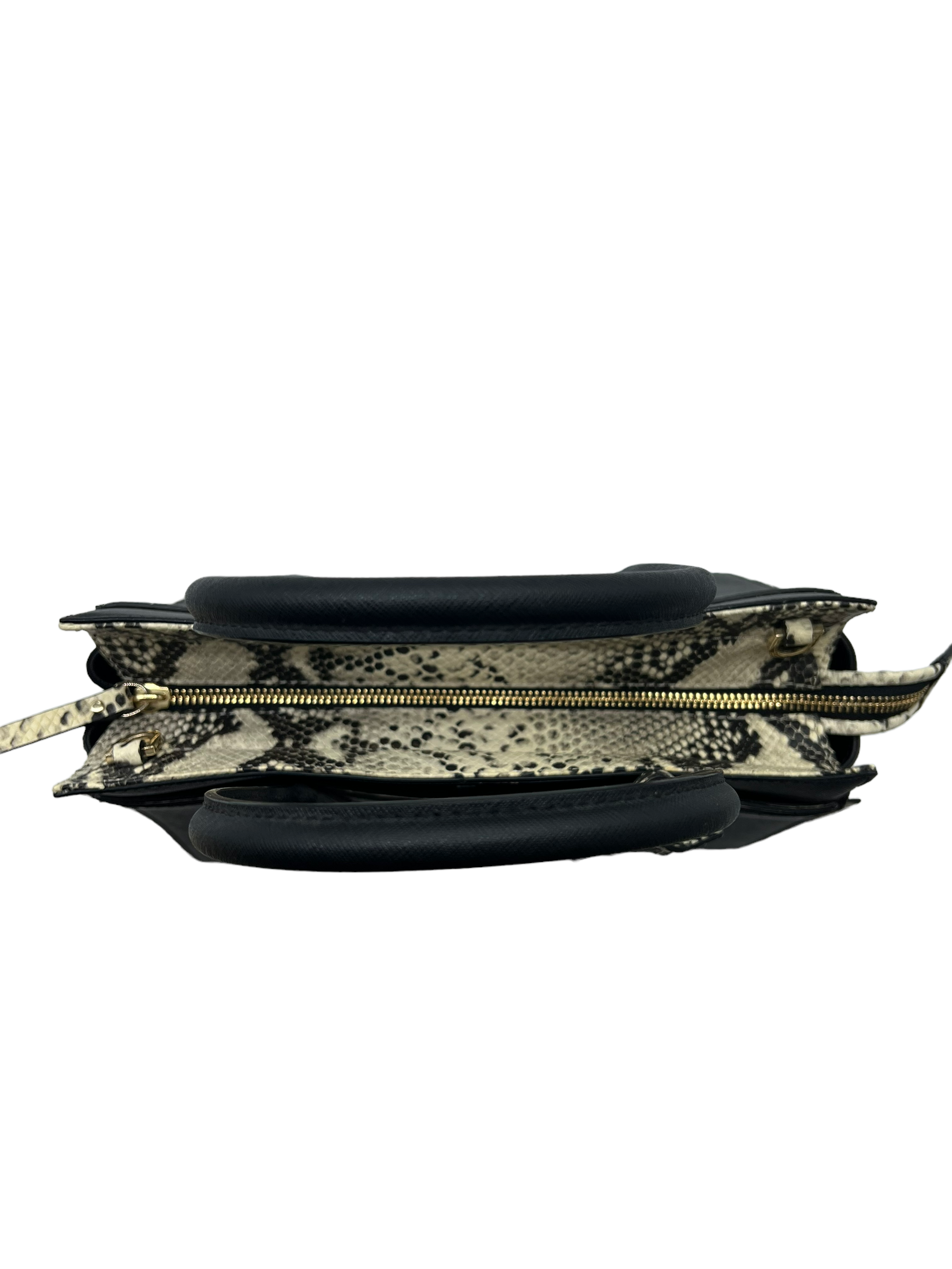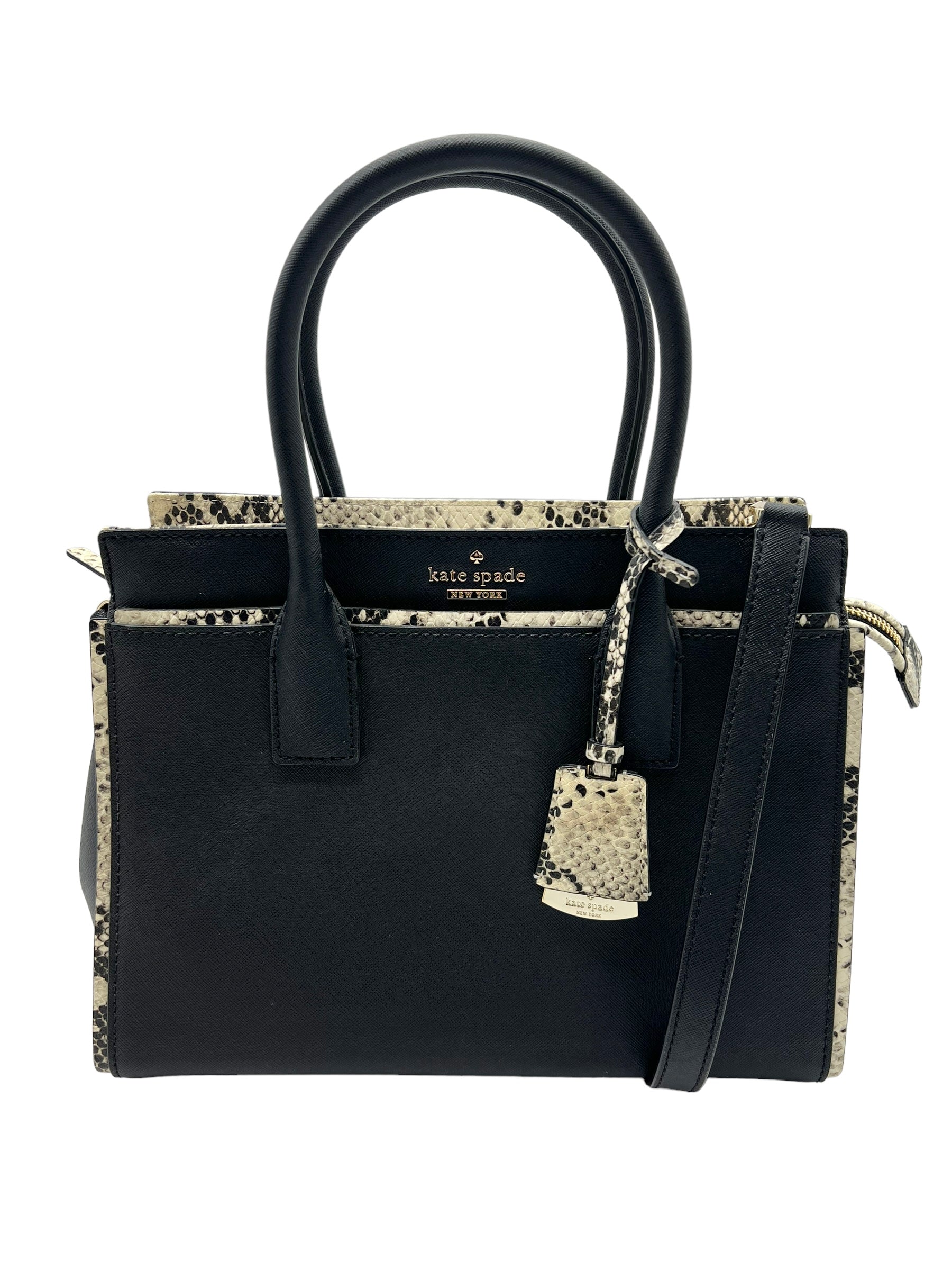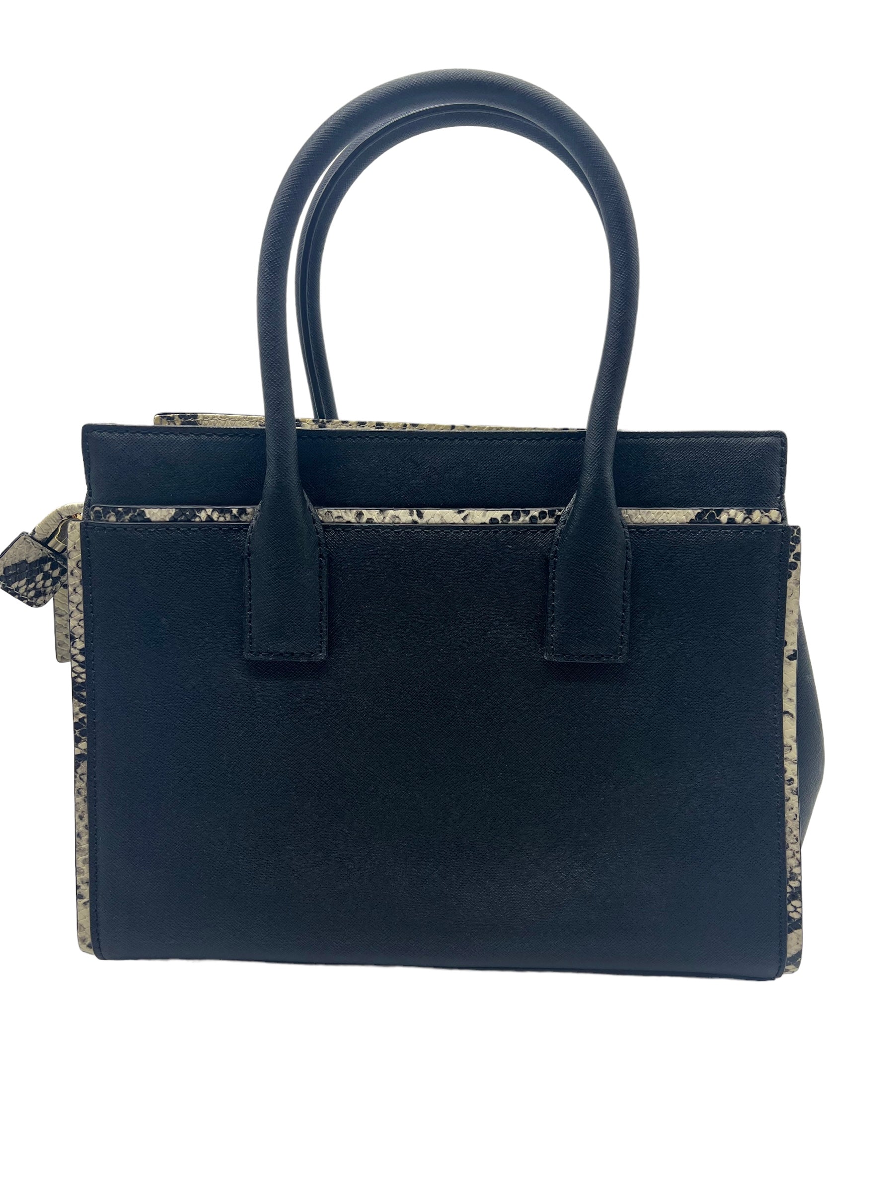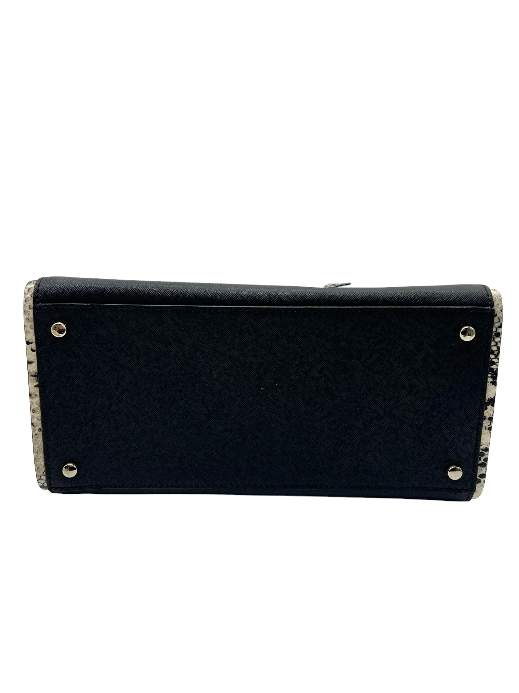 Black saffiano leather Cameron Street 'Candace' satchel with beige embossed snakeskin trim. Features front snap pocket. Comes with detachable/adjustable long strap and unbranded dust bag.