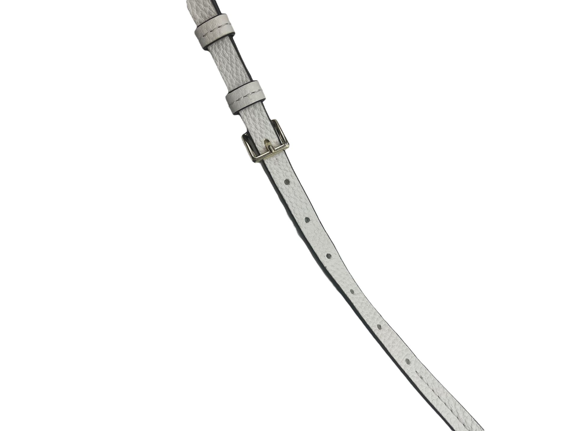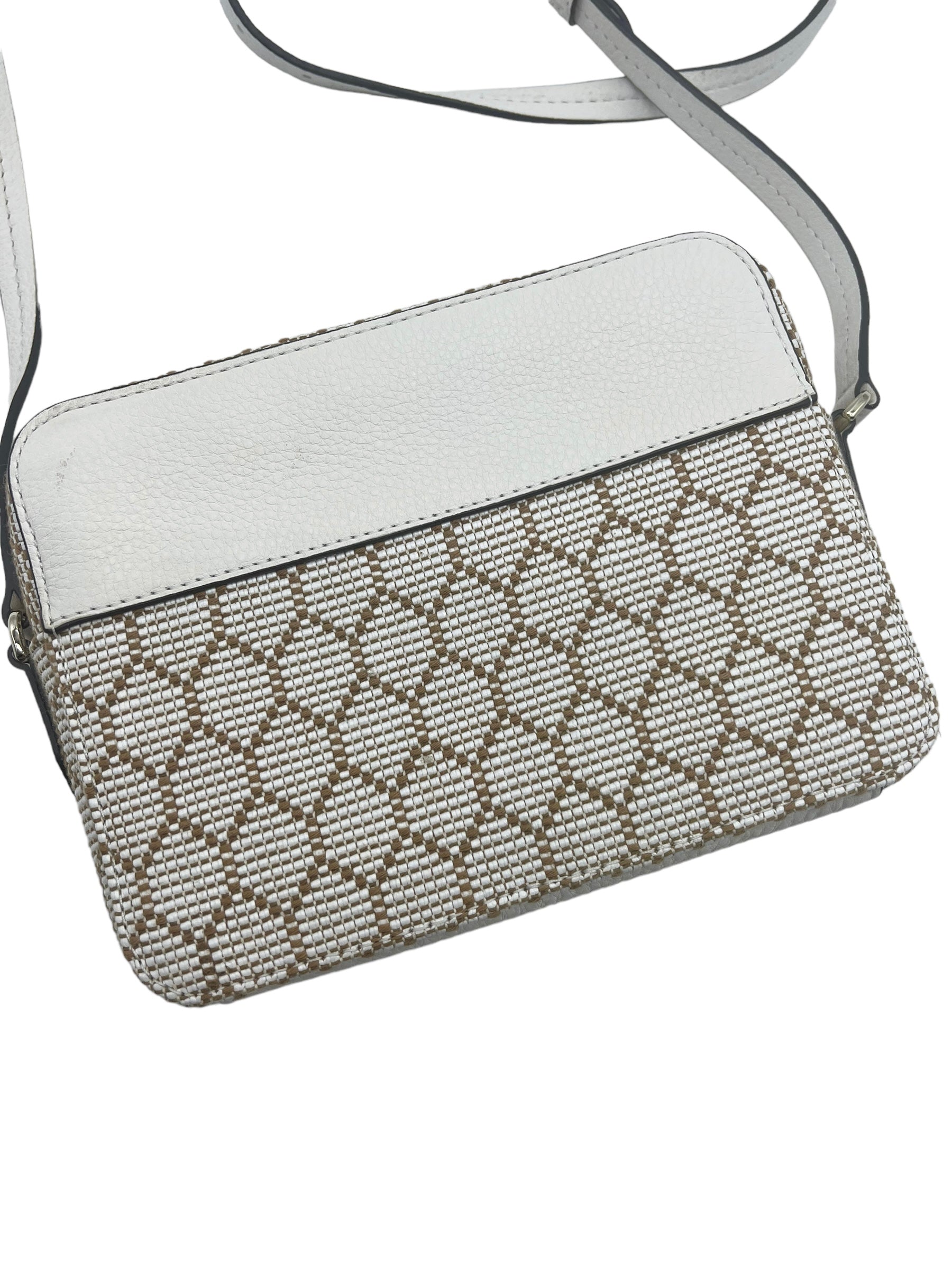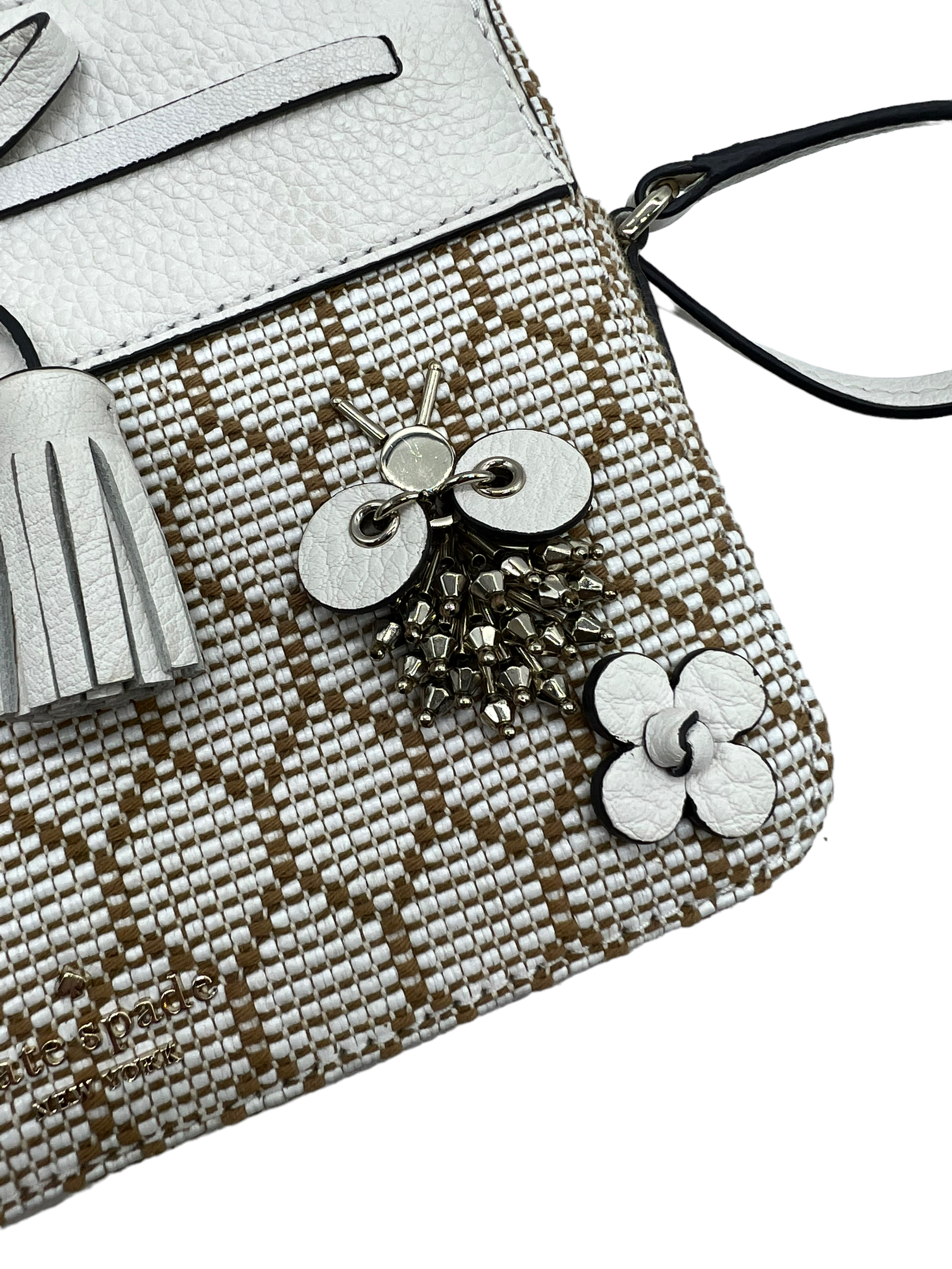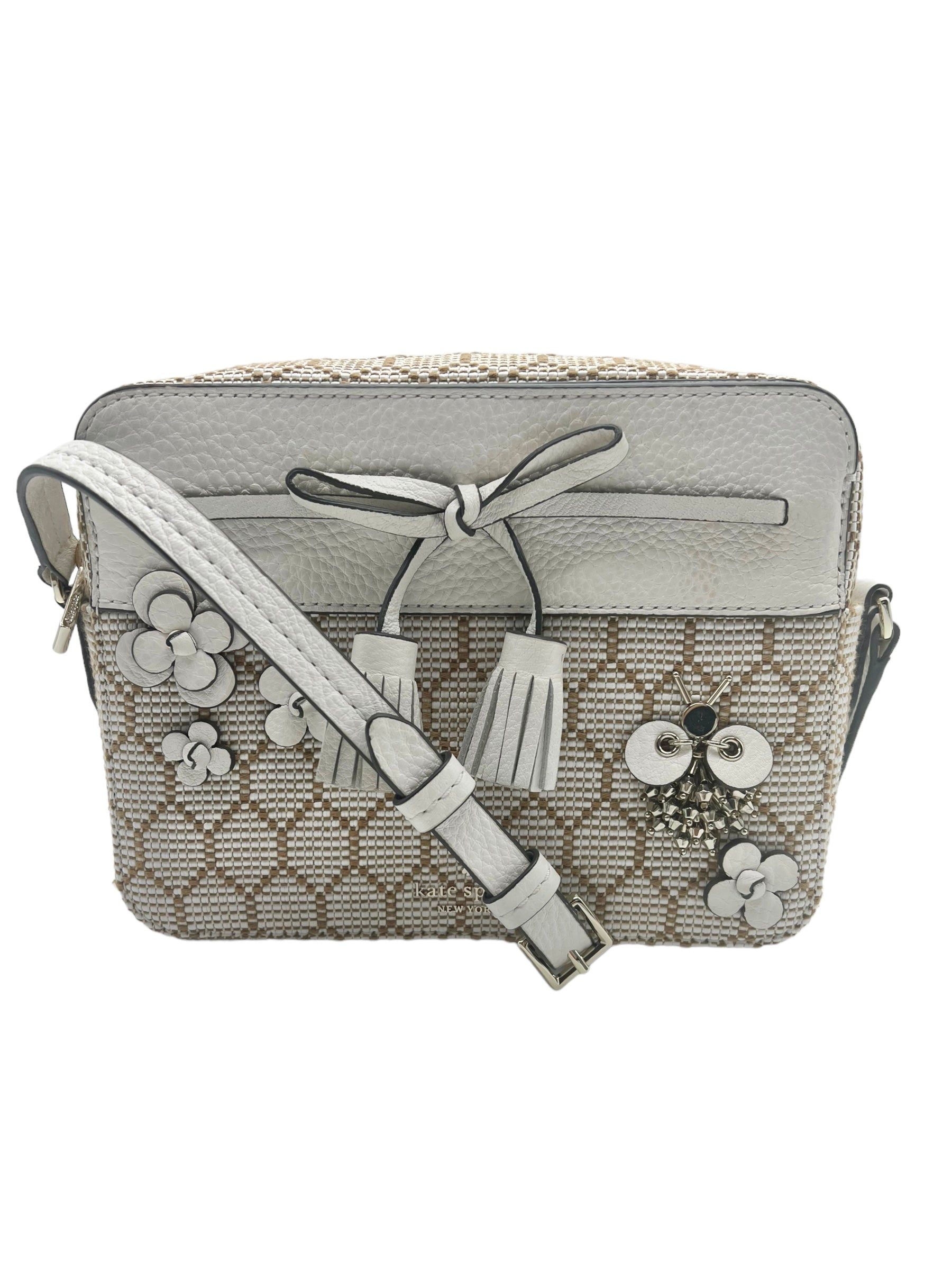 Beige and white jacquard and leather camera bag with leather flower and beaded bee embellishments/details. Features gold hardware. Long strap is adjustable. Comes with unbranded dust bag.
