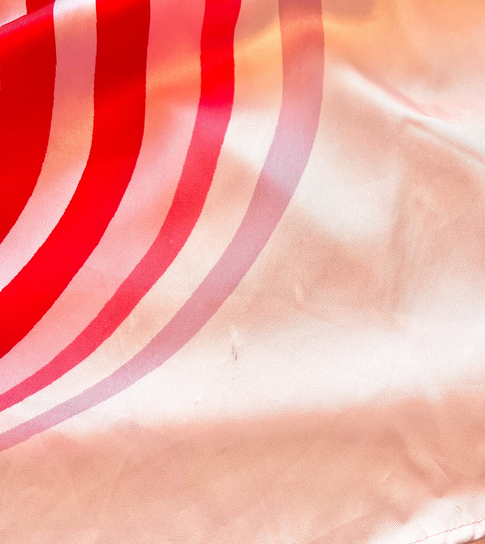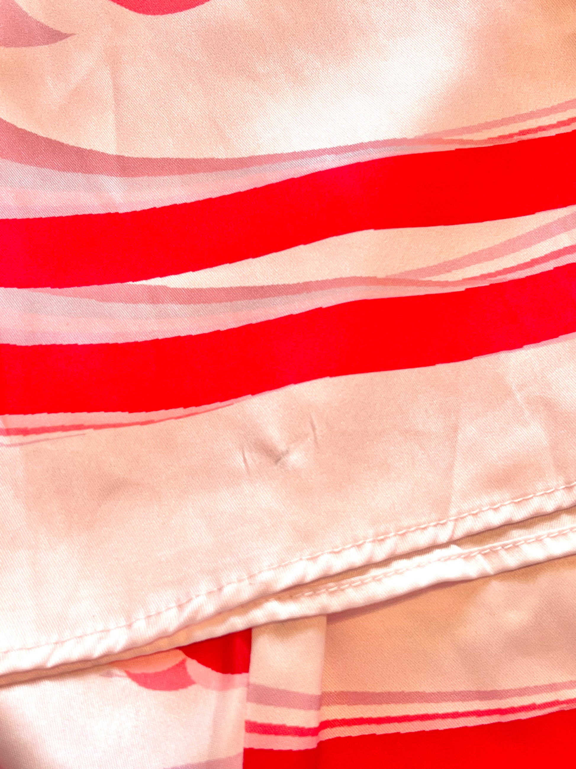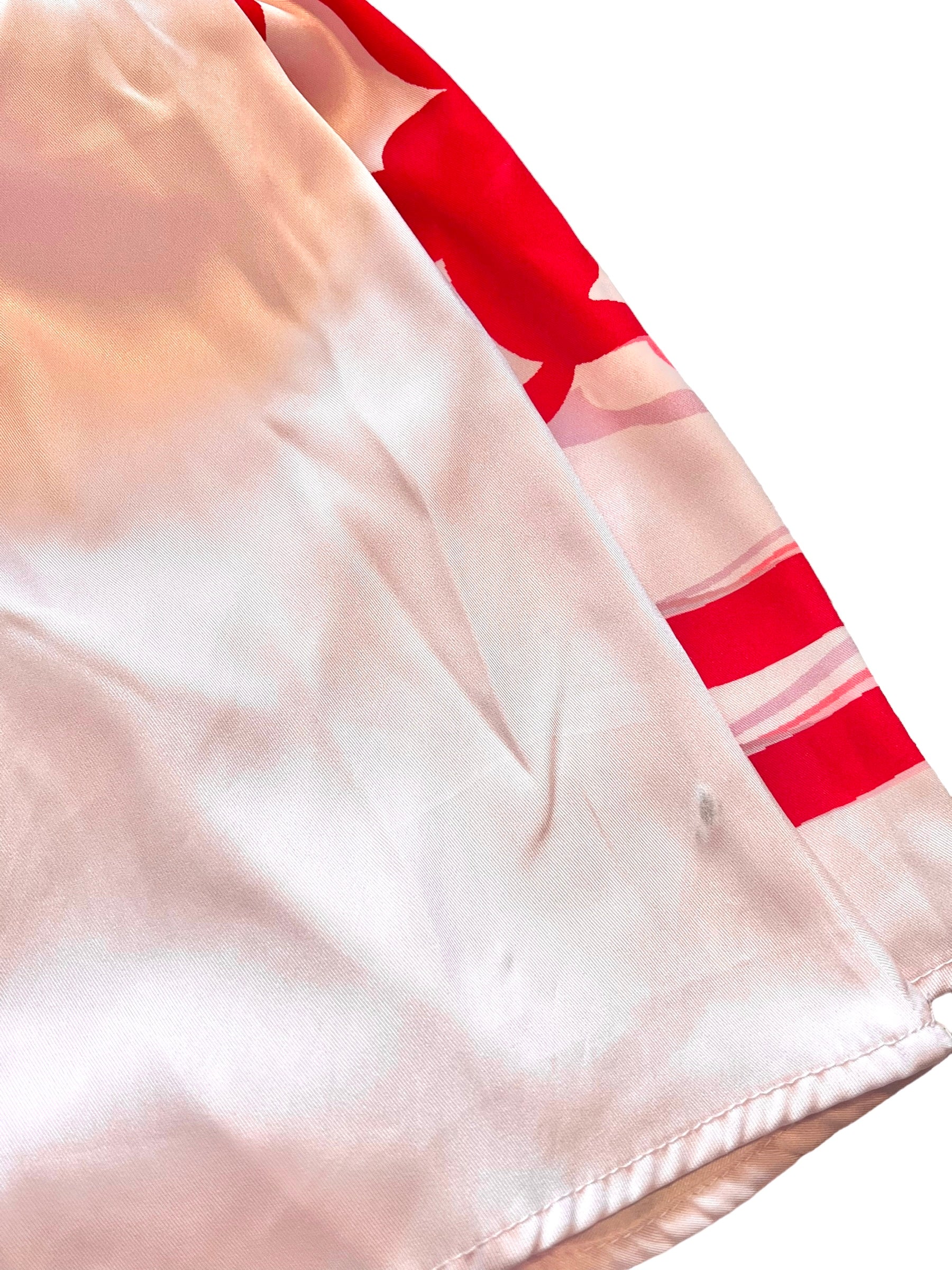 Red/white/pink multicolor mixed print lined wide leg flowy jumpsuit with blush pink faux leather belt. Features half button front, button details at cuff and elastic waist.