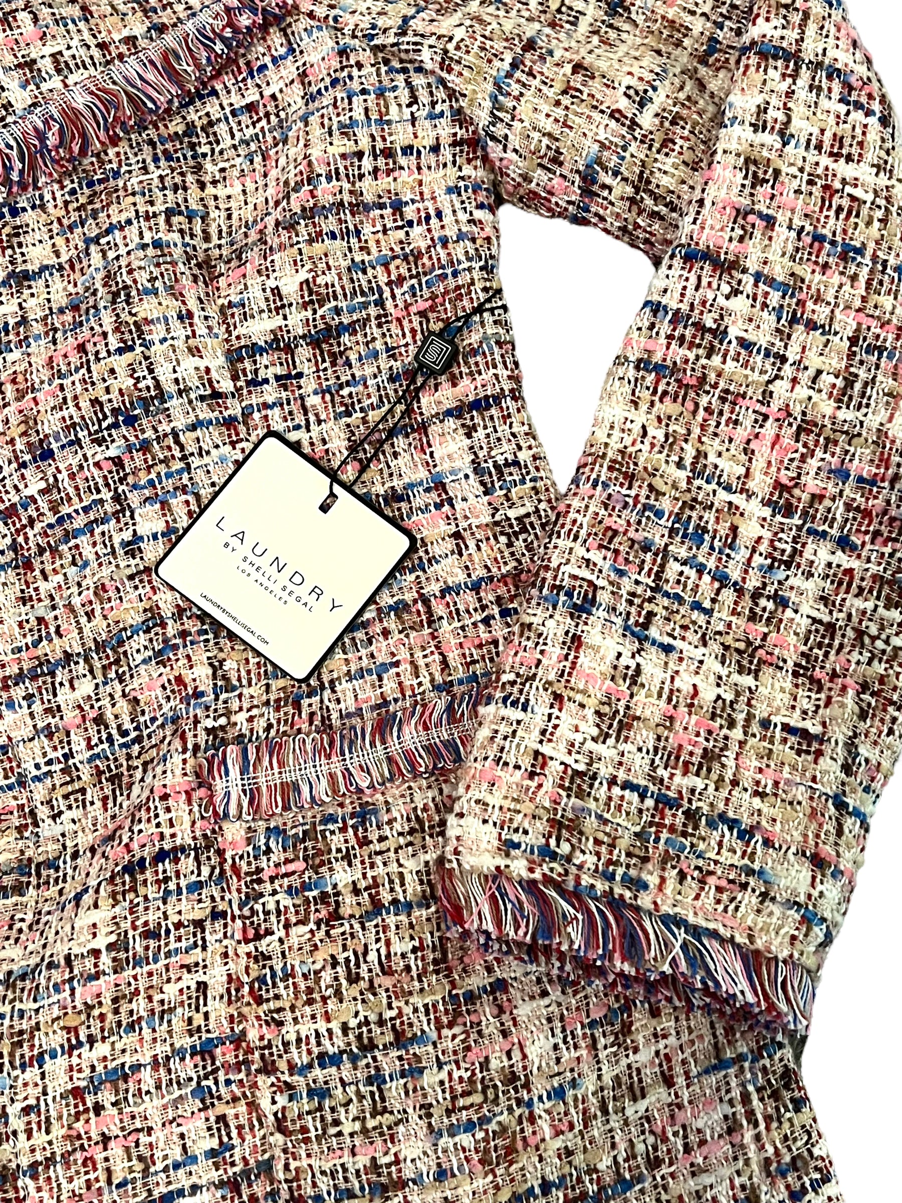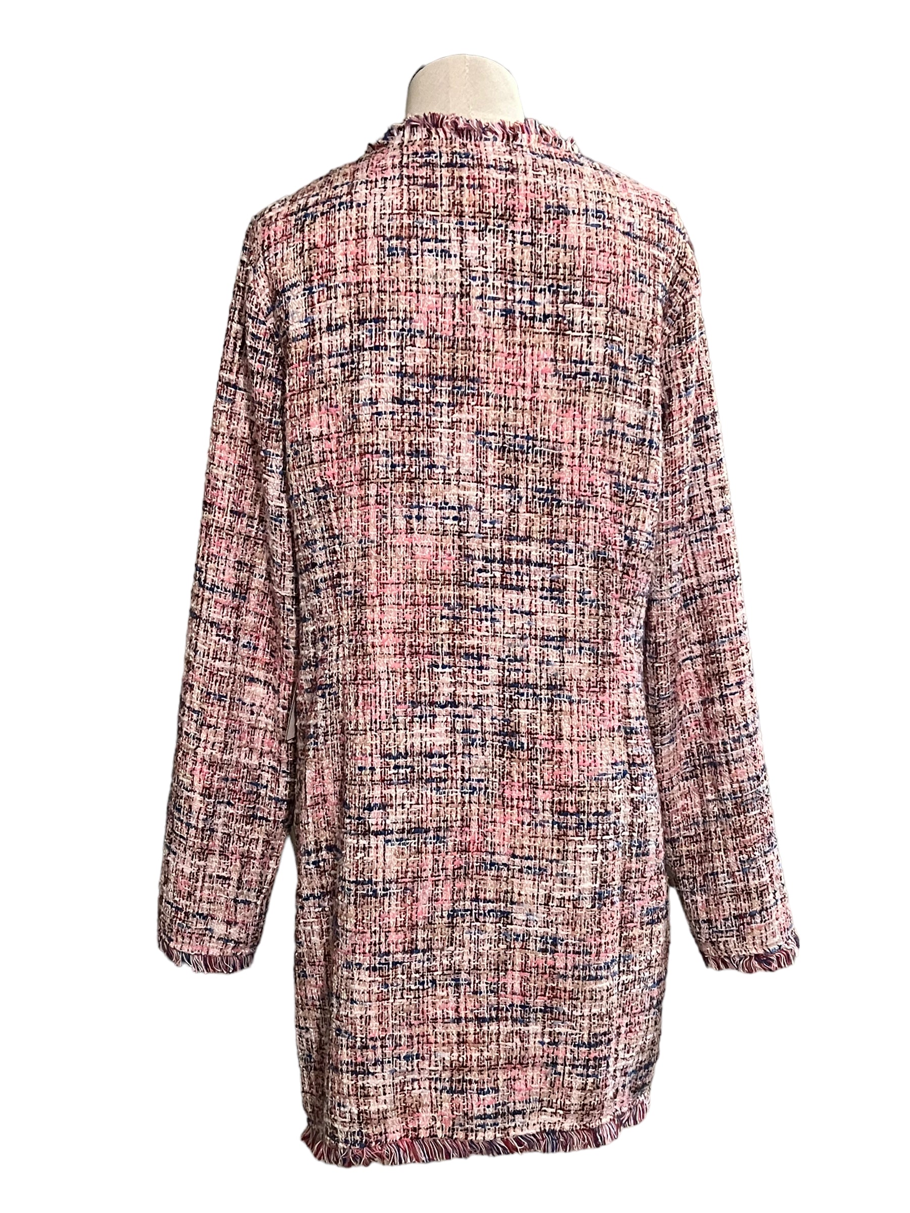 Pink multicolor tweed open jacket/blazer with fringe trim. Comes with original tags.