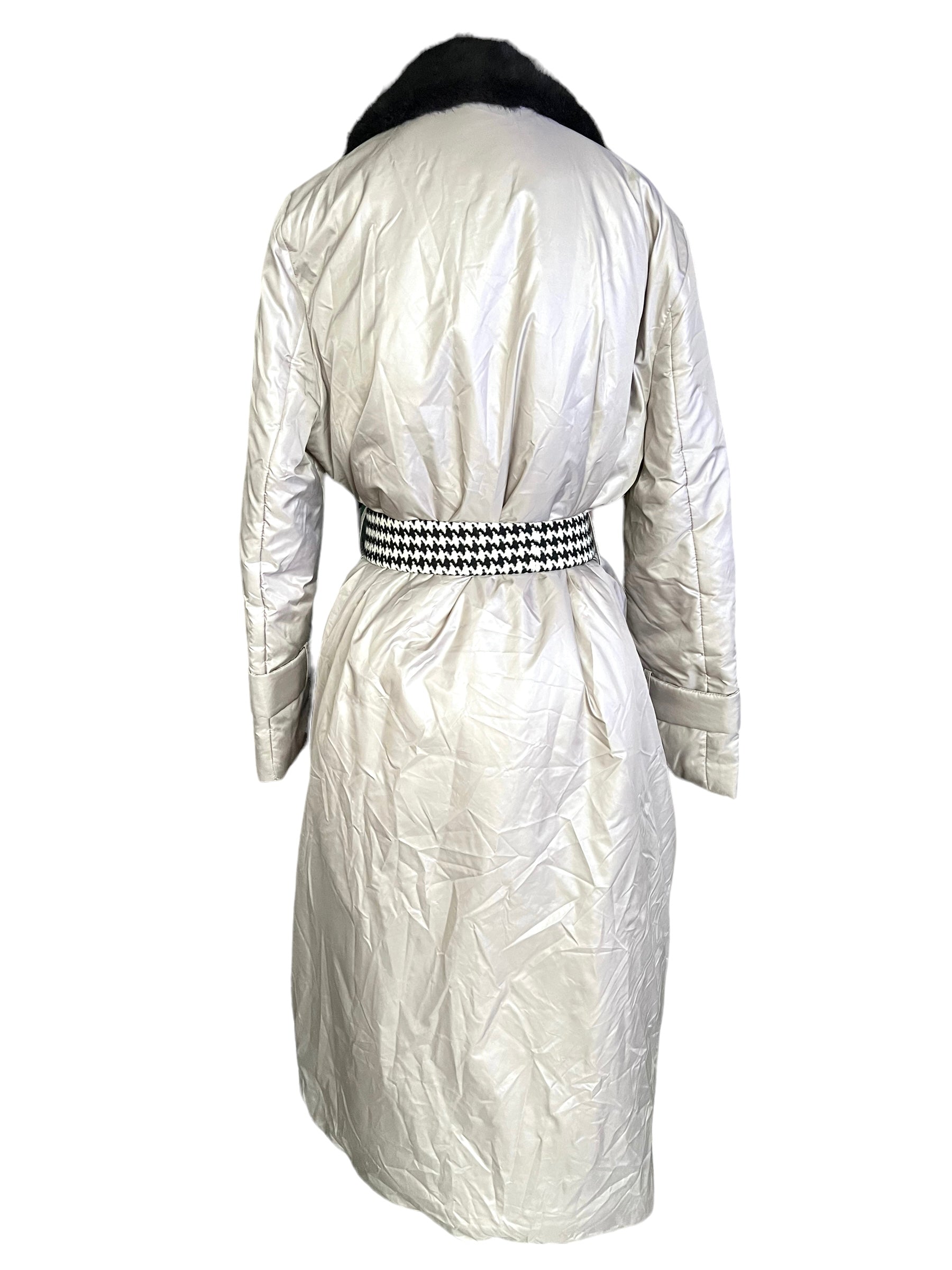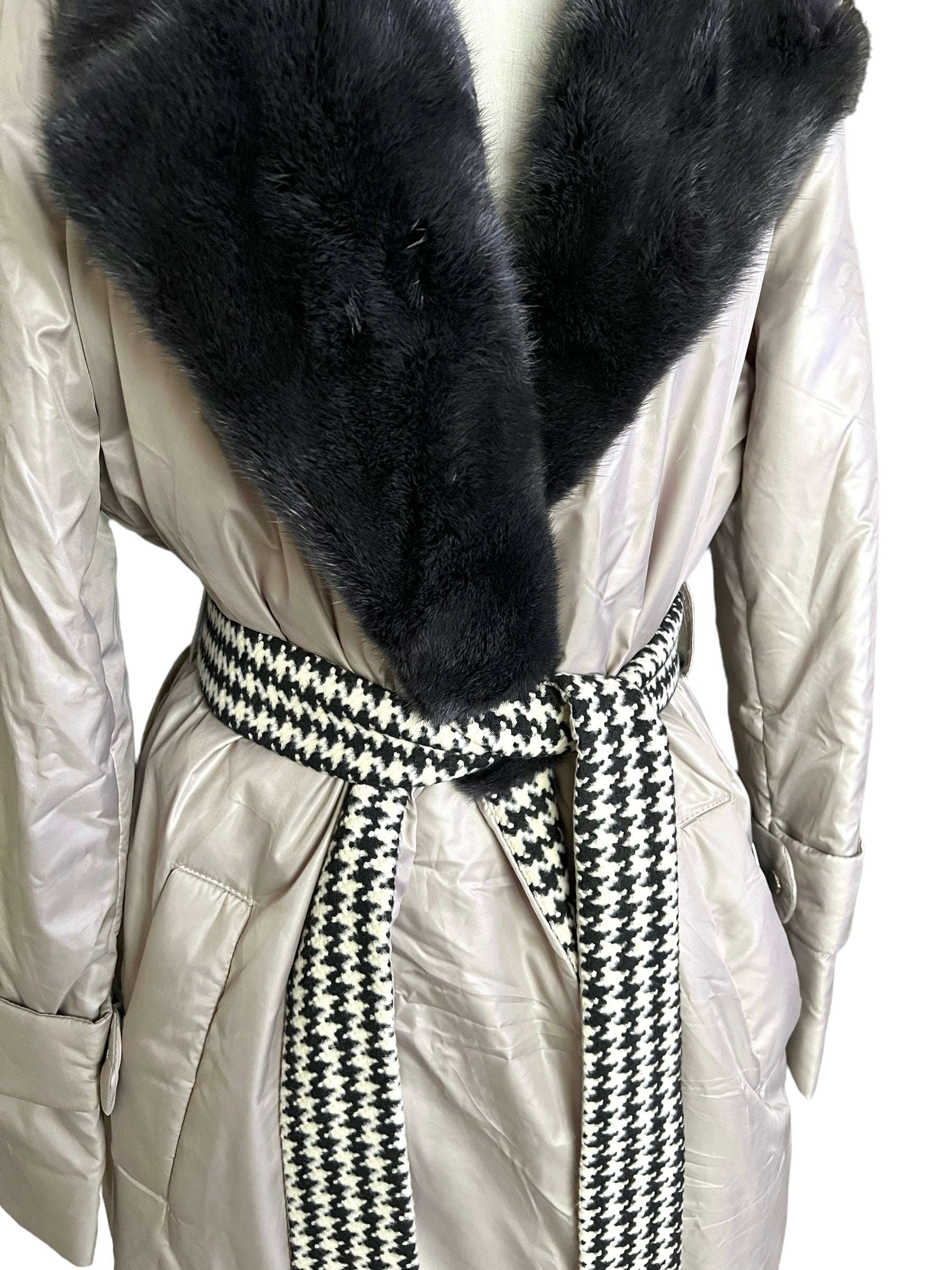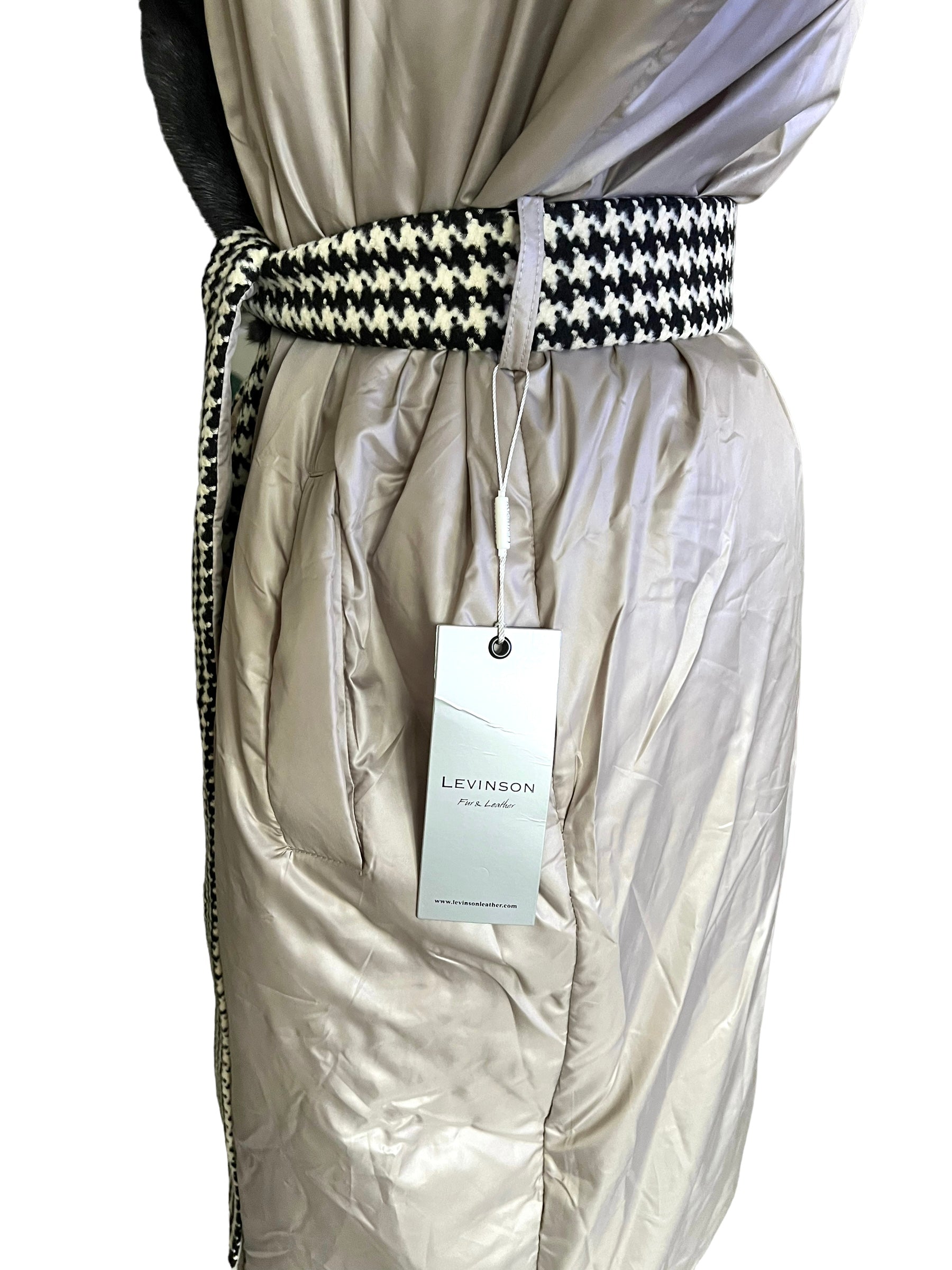 Beige puffer coat with fur collar and houndstooth knit trim and waist belt. Comes with garment bag.