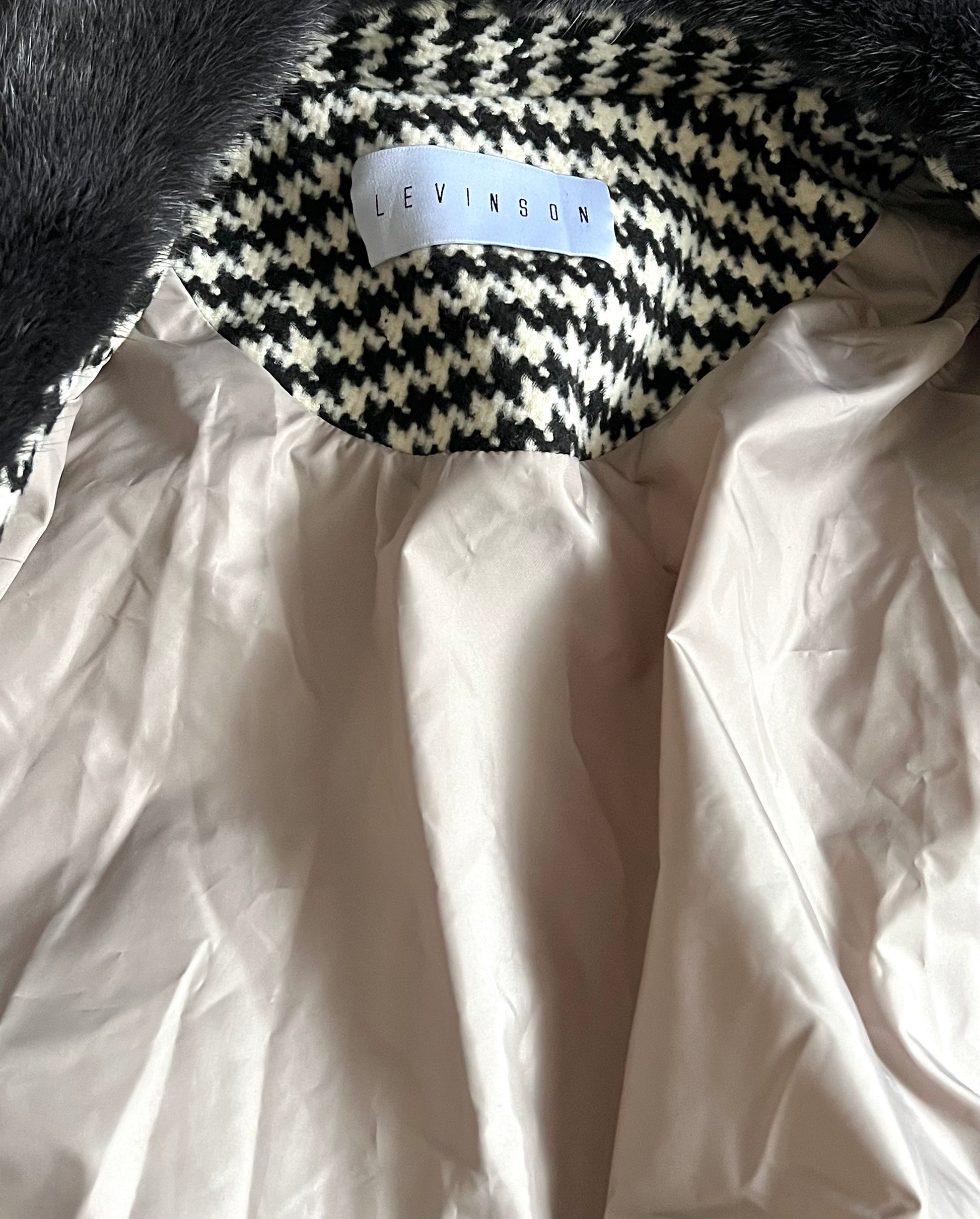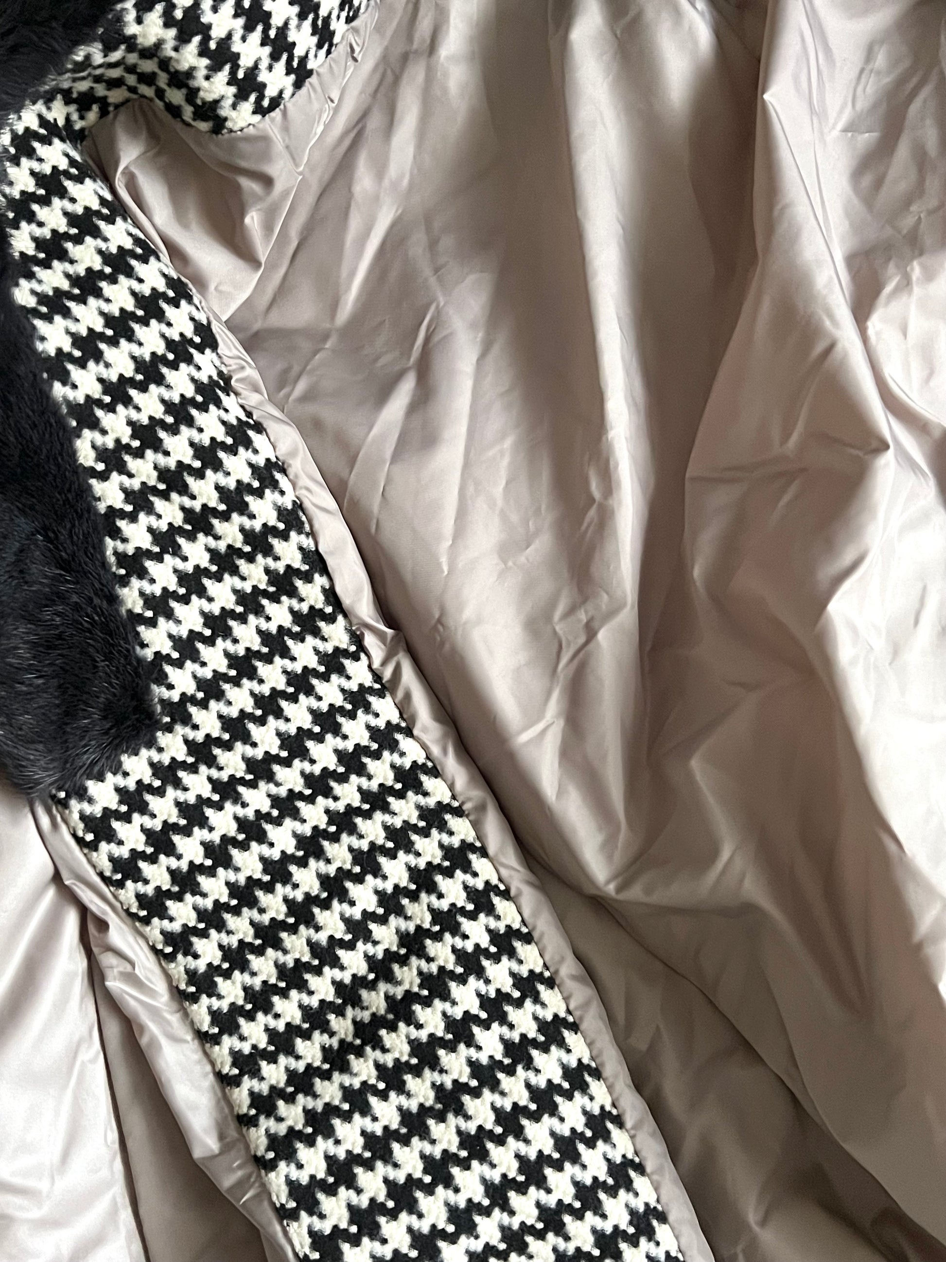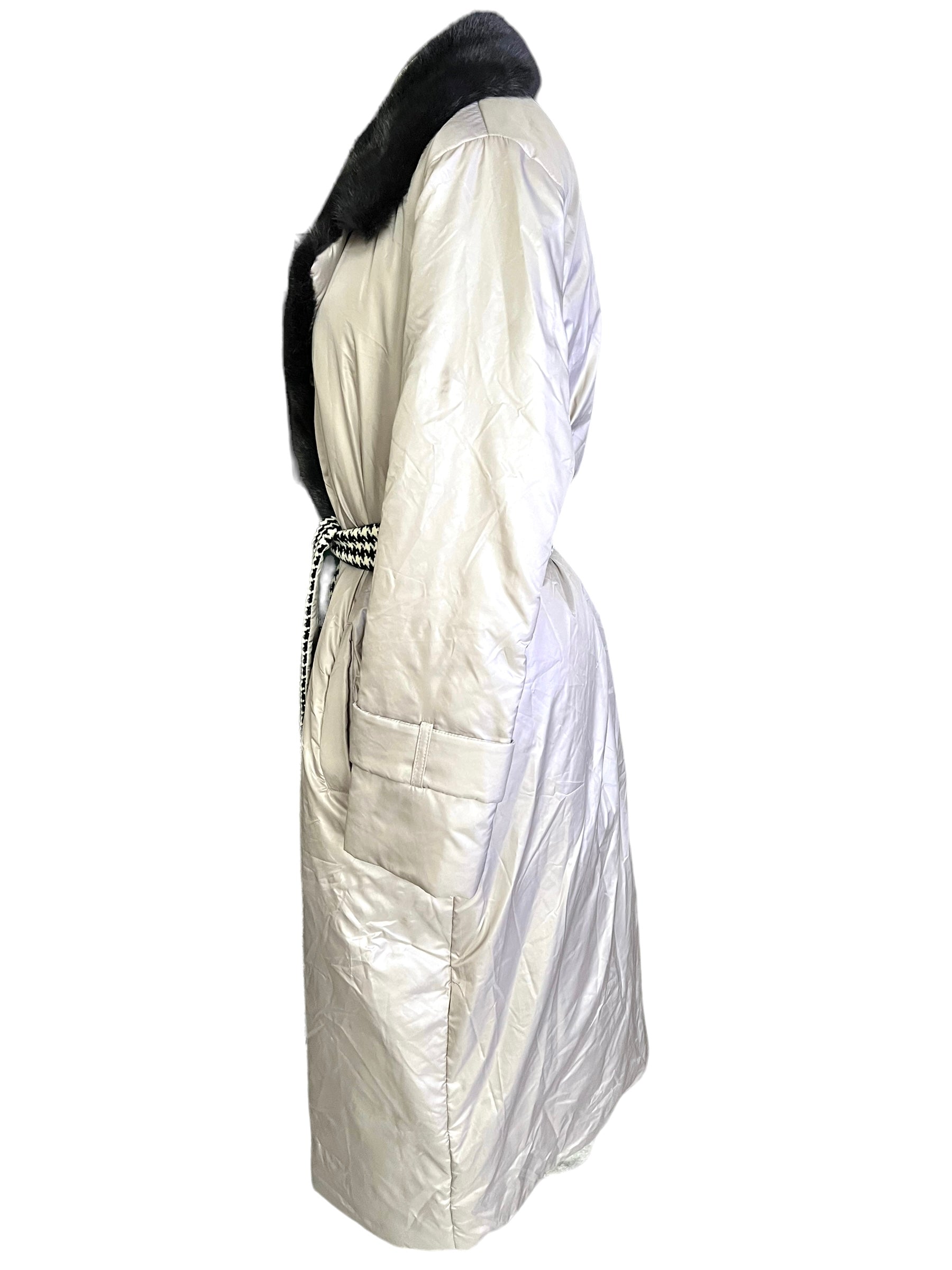 Beige puffer coat with fur collar and houndstooth knit trim and waist belt. Comes with garment bag.