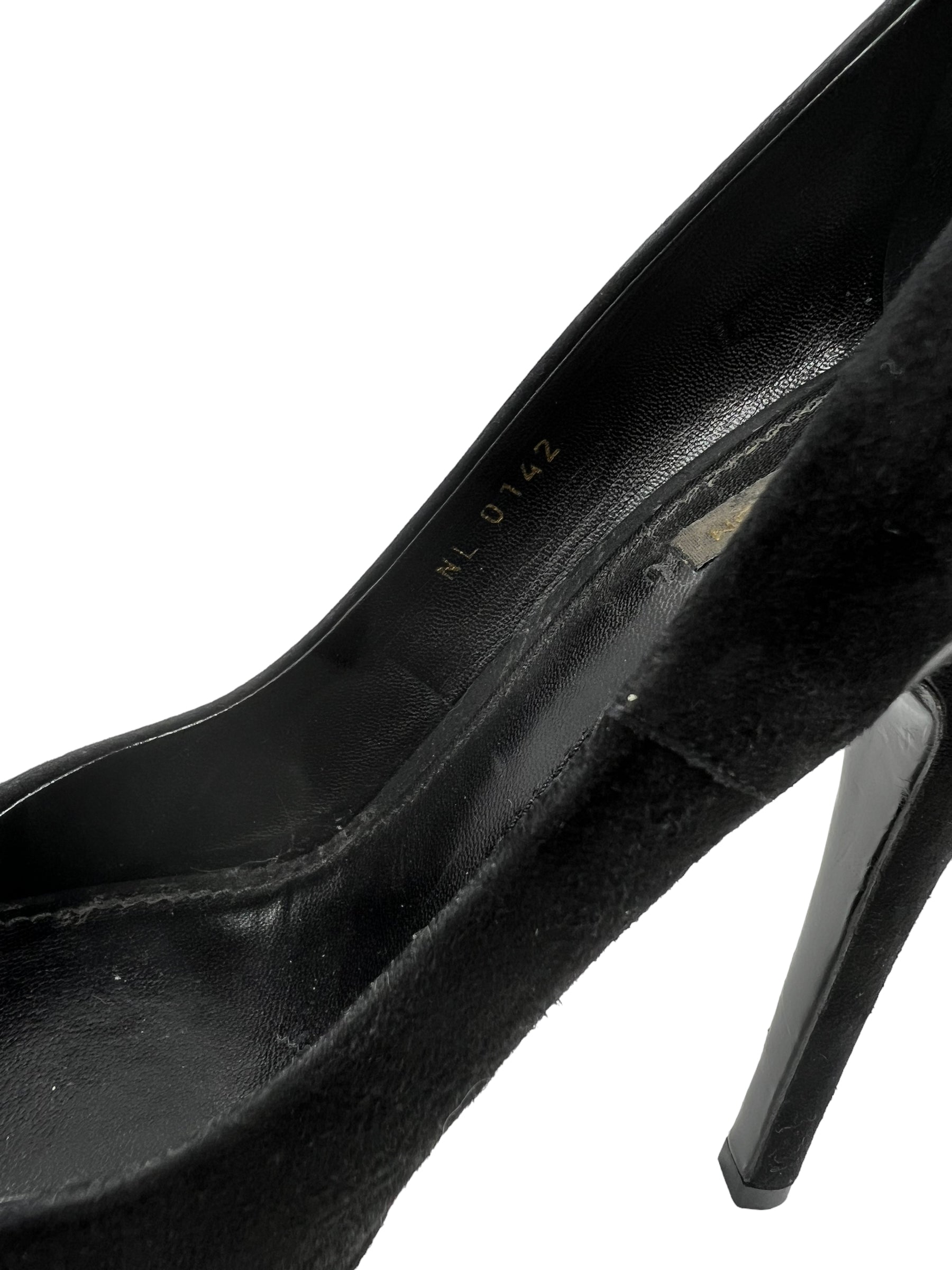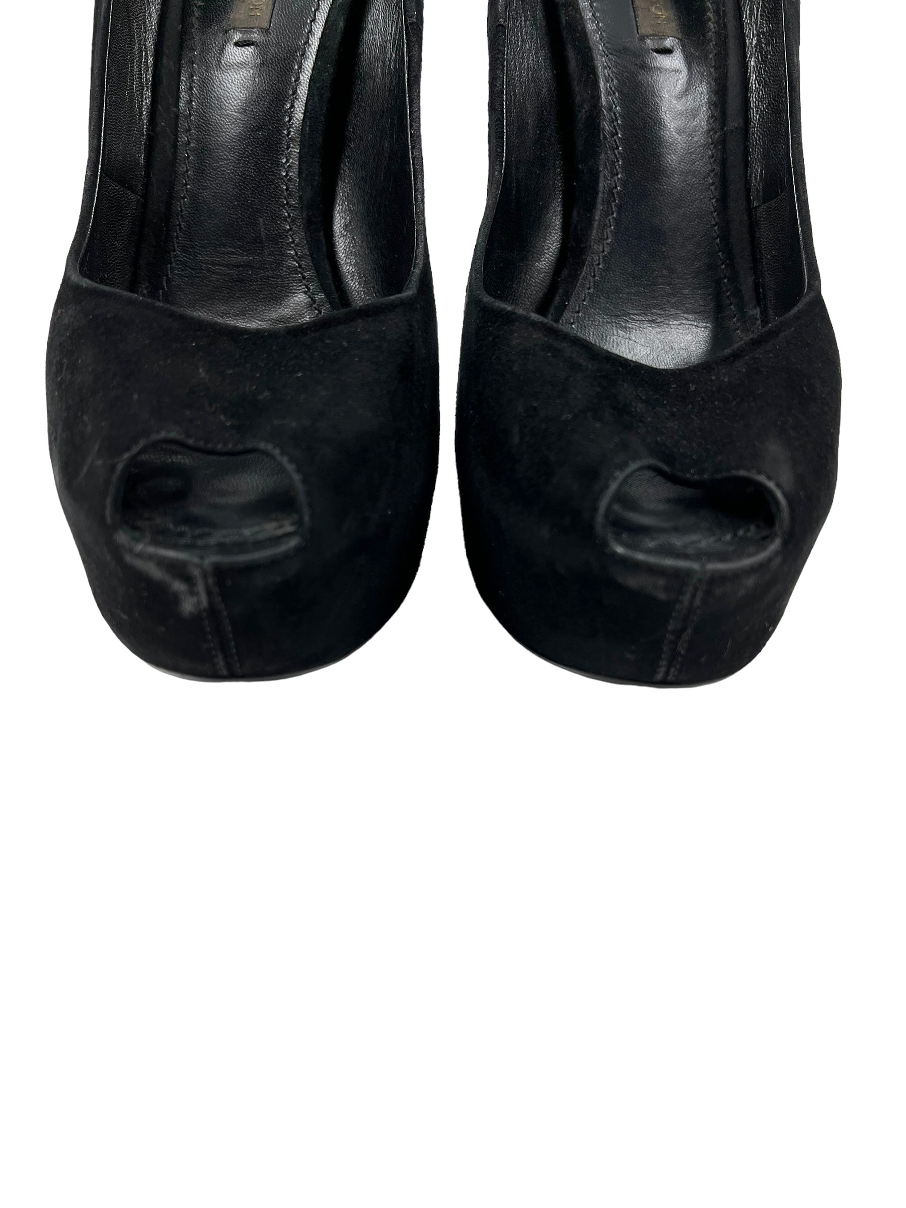 Black suede platform 'Oh Really!' peep toe heels with gold lock detail. Heels do not come with dust bag or box.