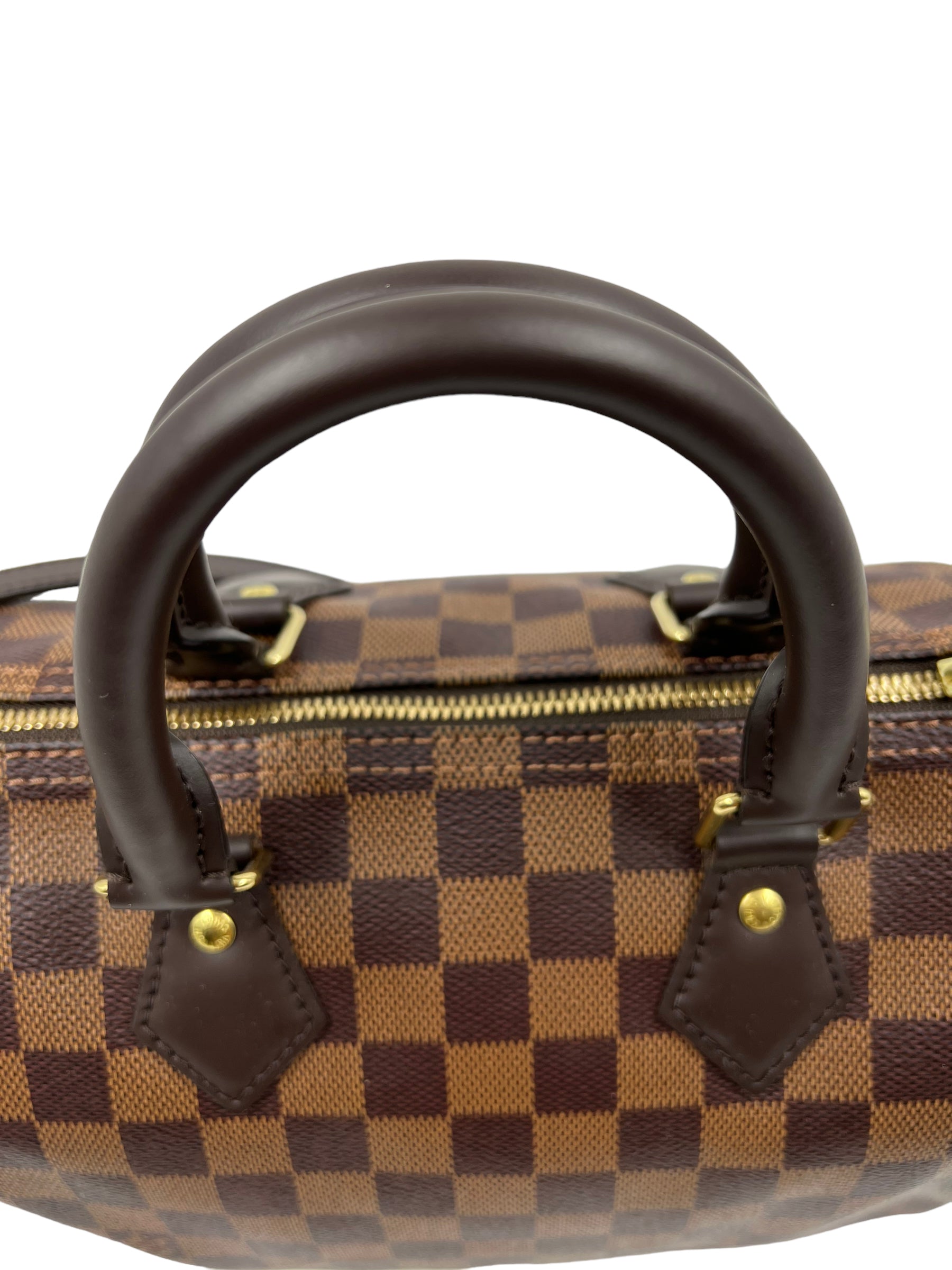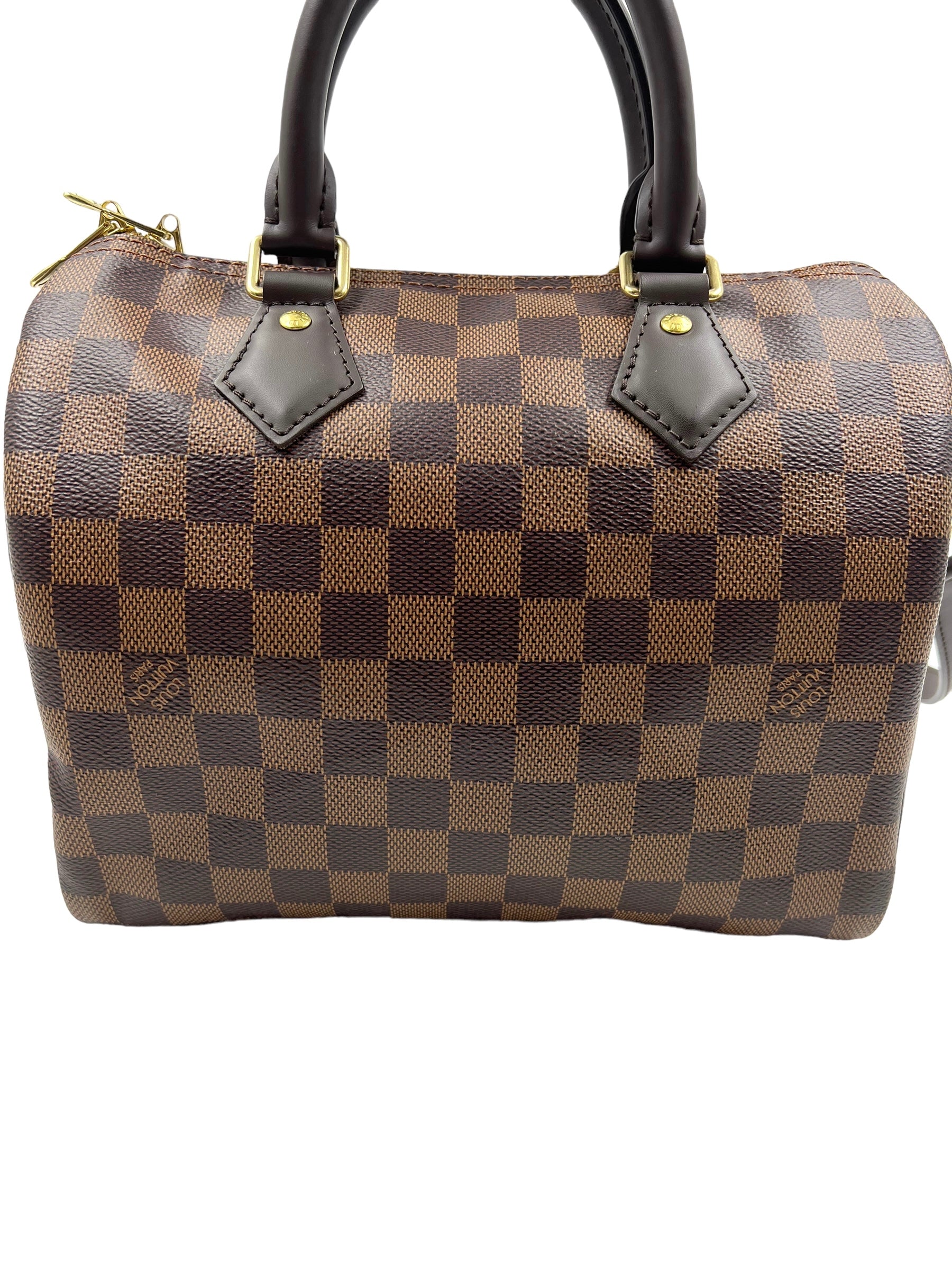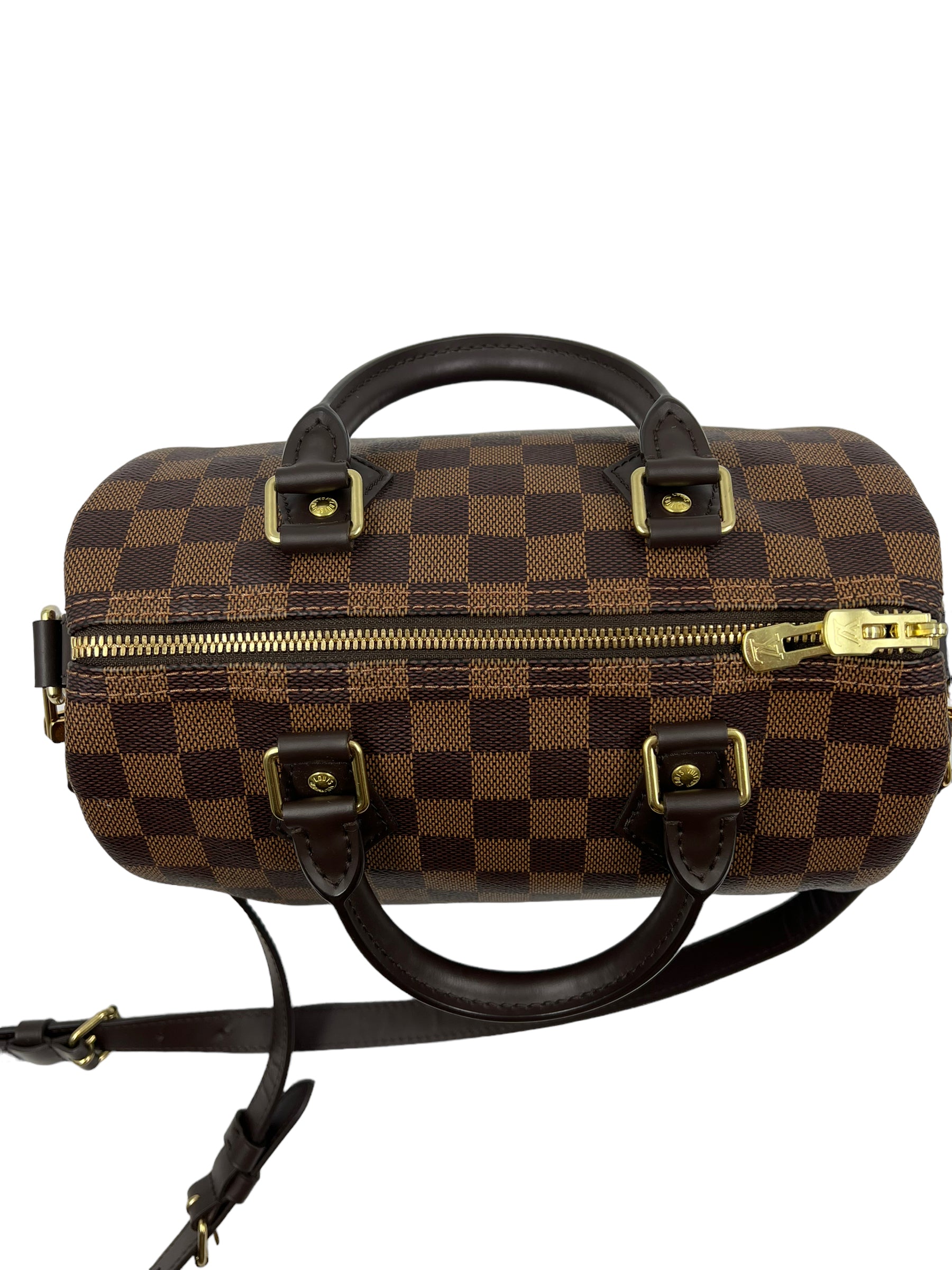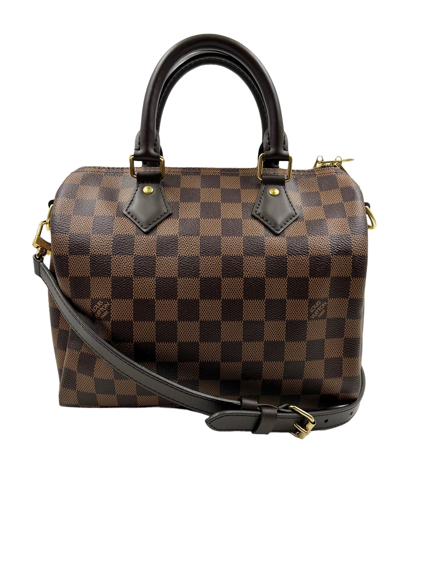 Damier Ebene Speedy 25 Bandouliere handbag with gold hardware and detachable/adjustable long strap. Comes with dust bag, lock, key and box.