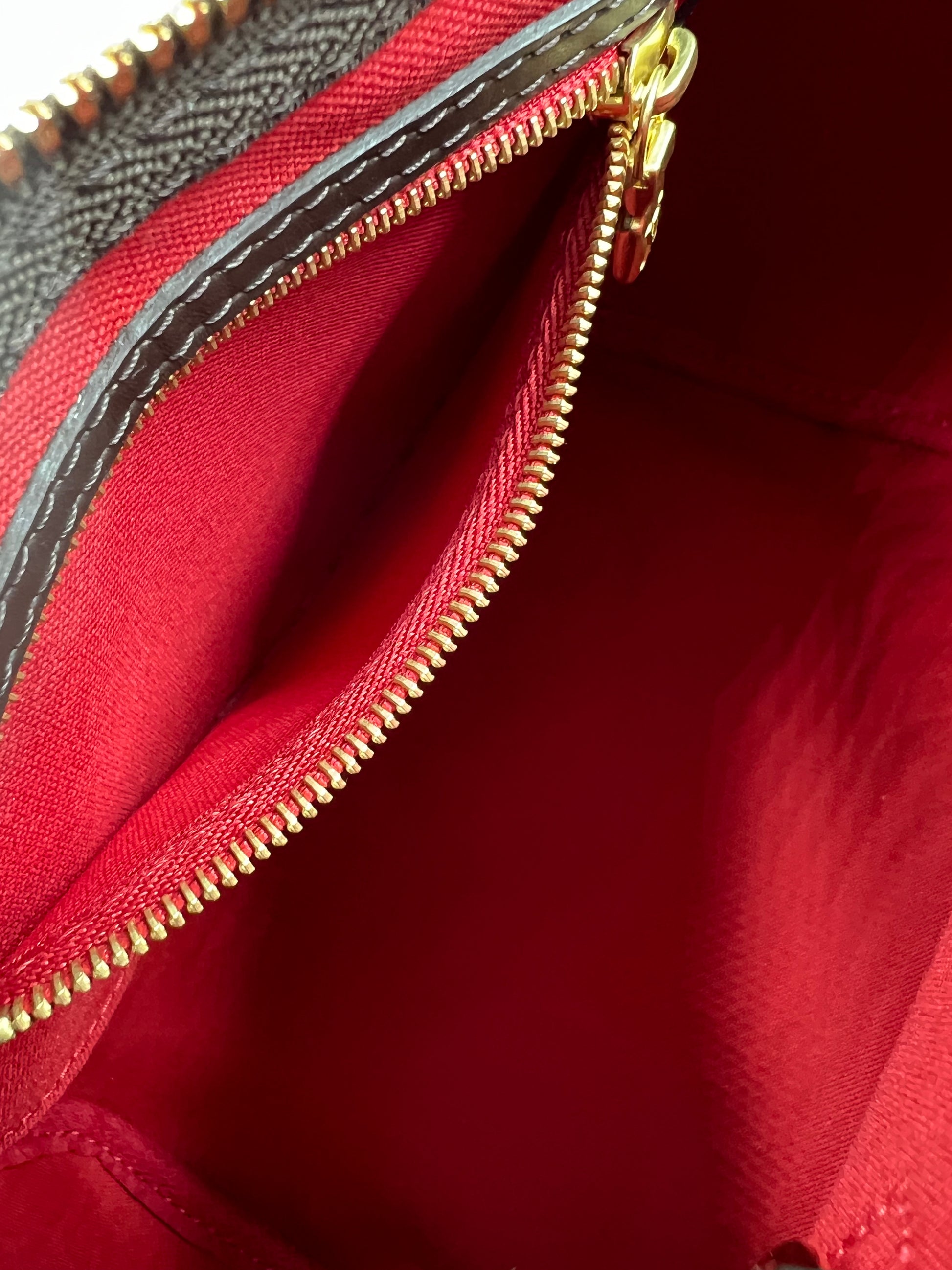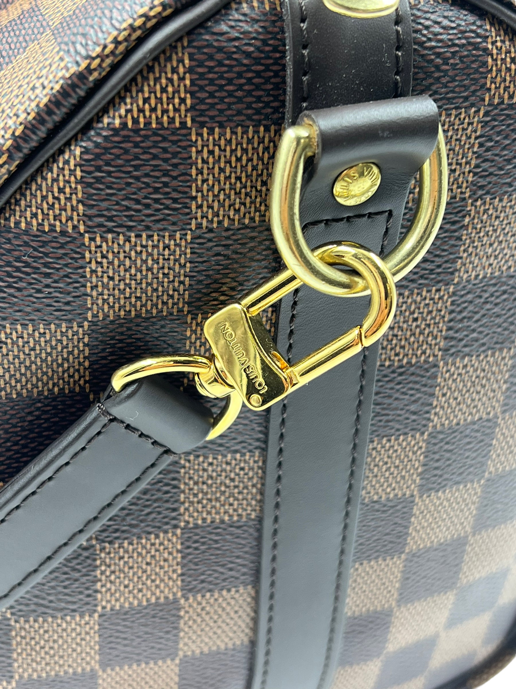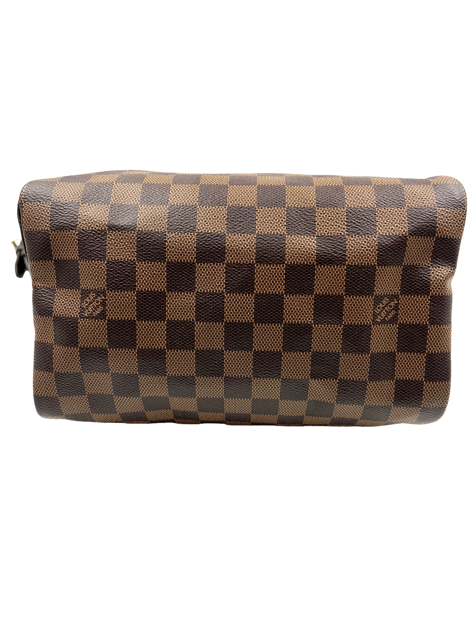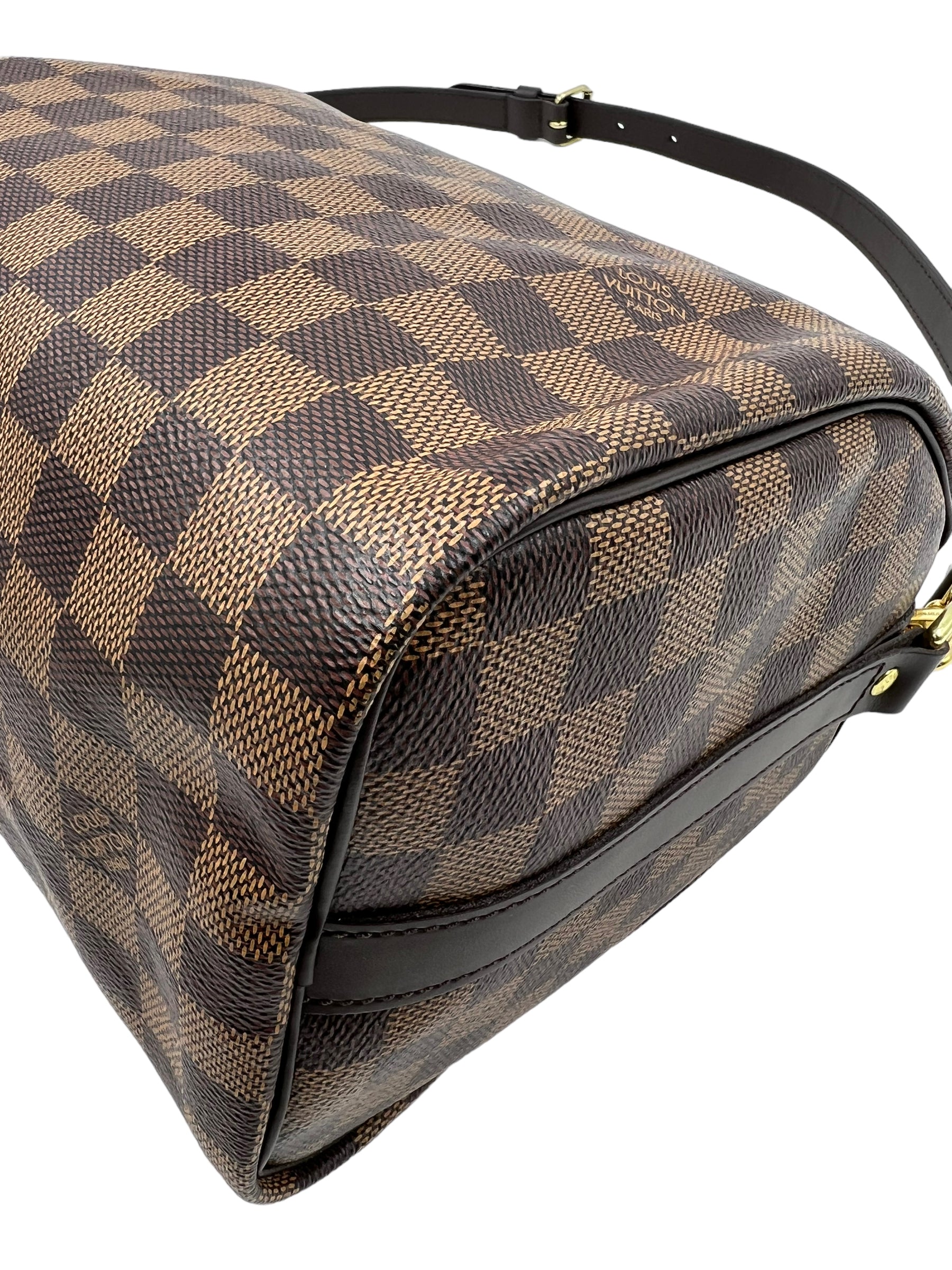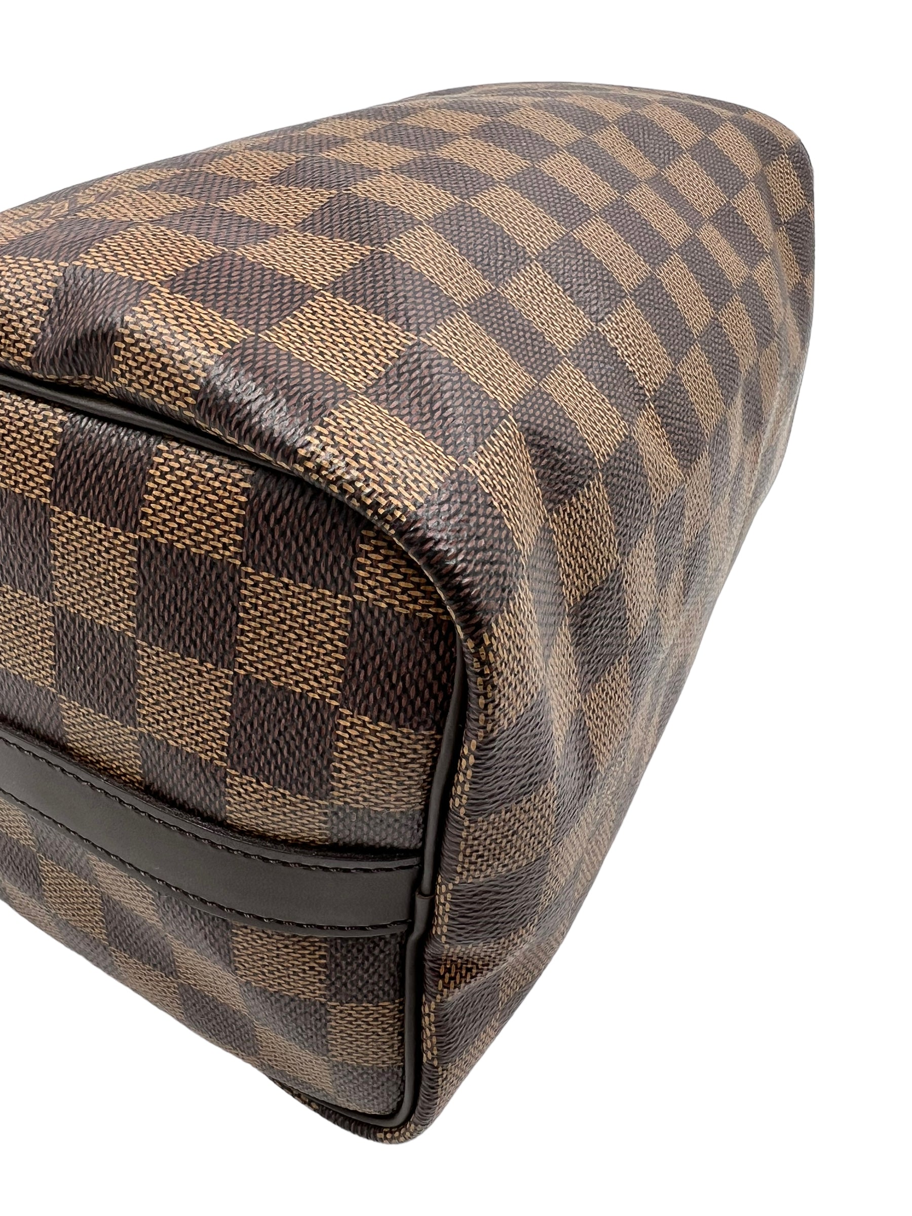 Damier Ebene Speedy 25 Bandouliere handbag with gold hardware and detachable/adjustable long strap. Comes with dust bag, lock, key and box.