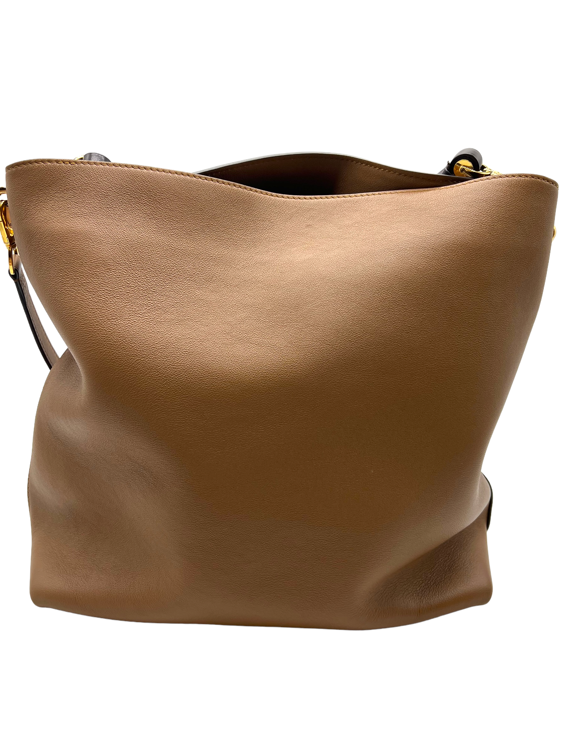Hazelnut calfskin Bagatelle Noisette Parnassea shoulderbag with perforated detail. Comes with removable handle, long strap, dust bag and box