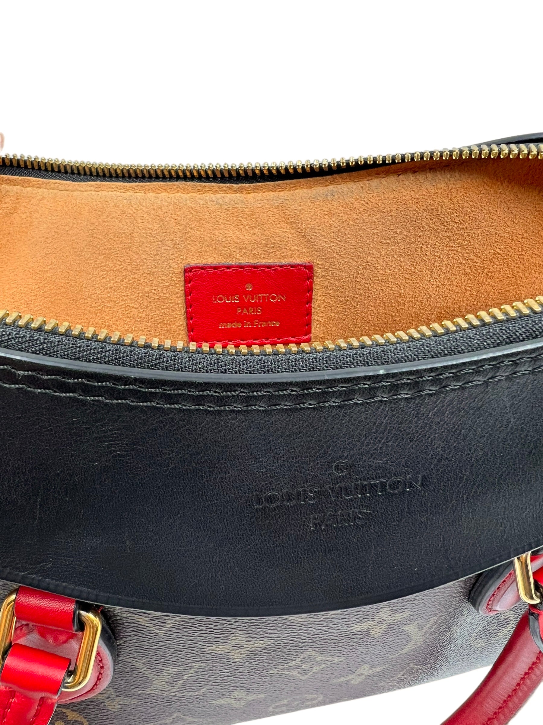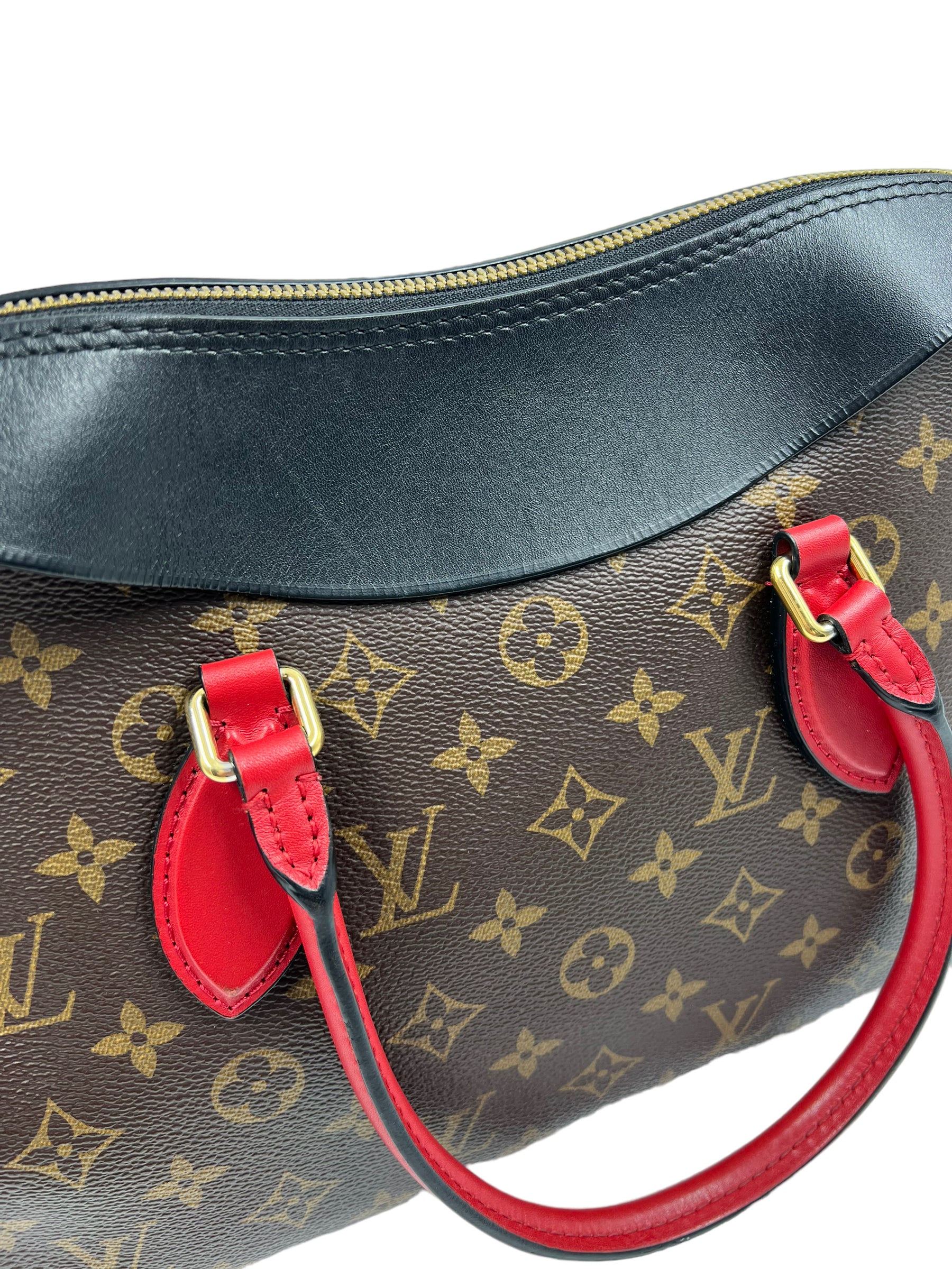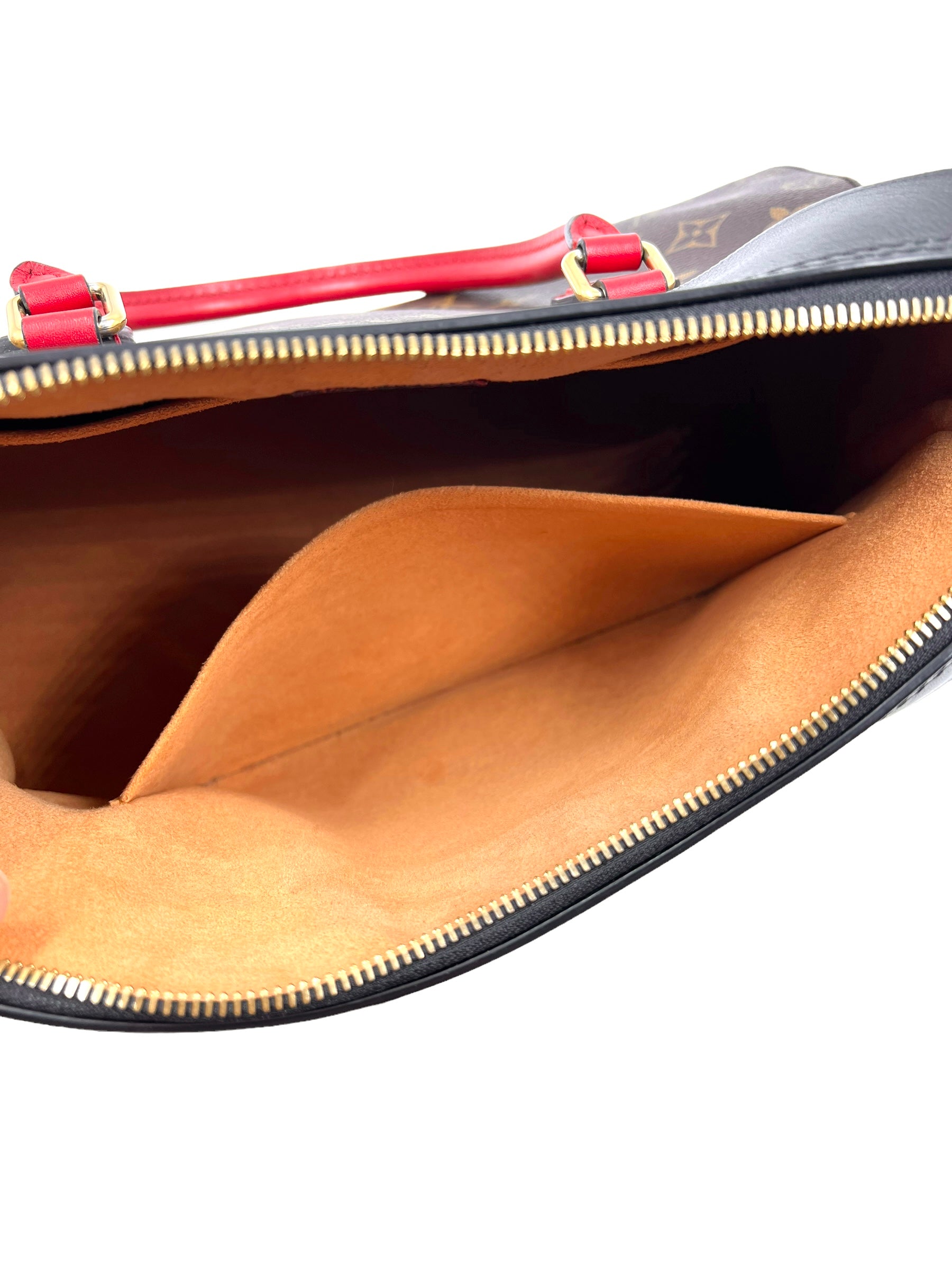 Monogram Tuileries handbag with gold hardware and detachable long strap. Features red and tan leather trim/detail, exterior zip pocket and three interior slip pockets. Does not come with dust bag or box.