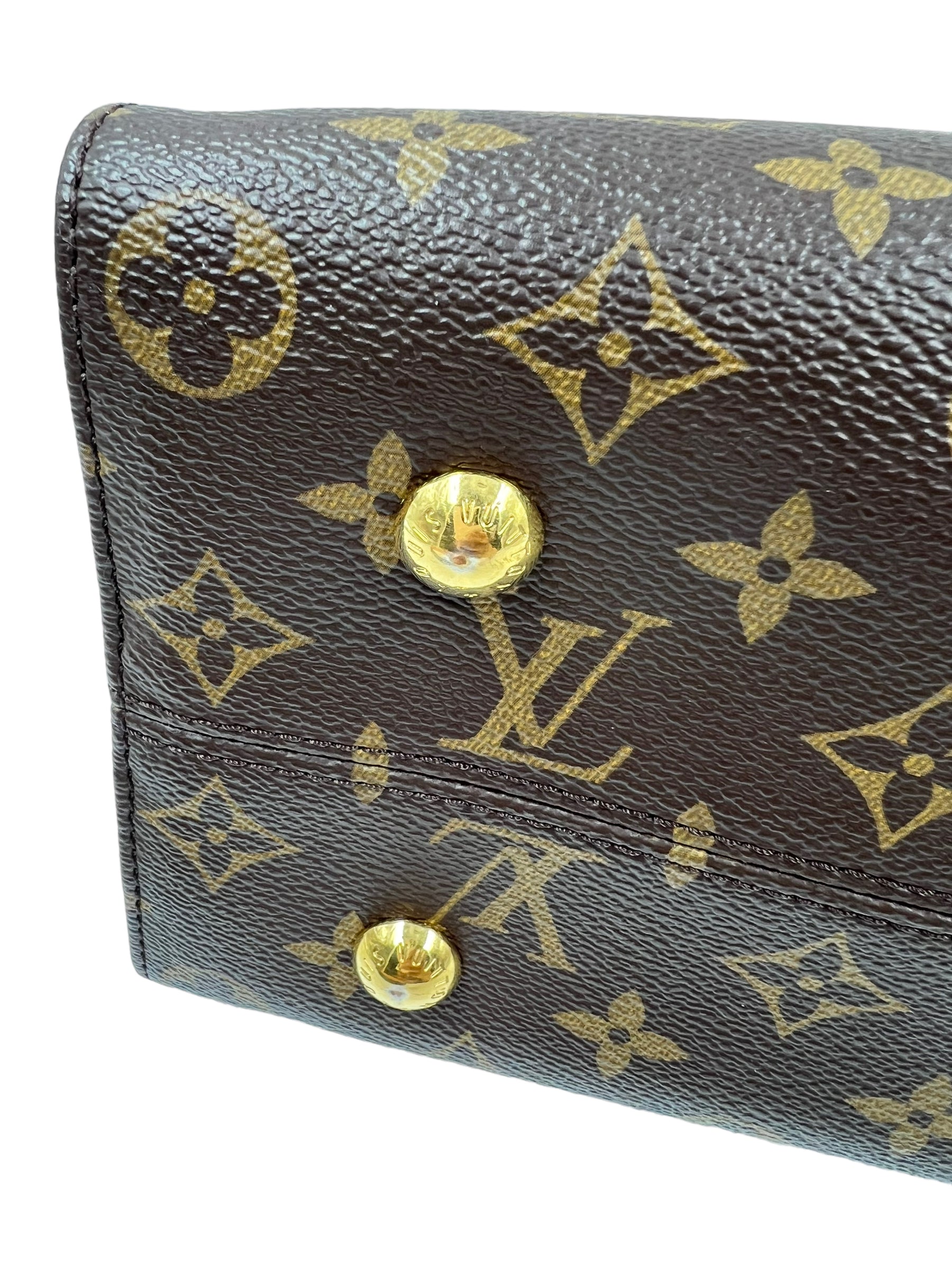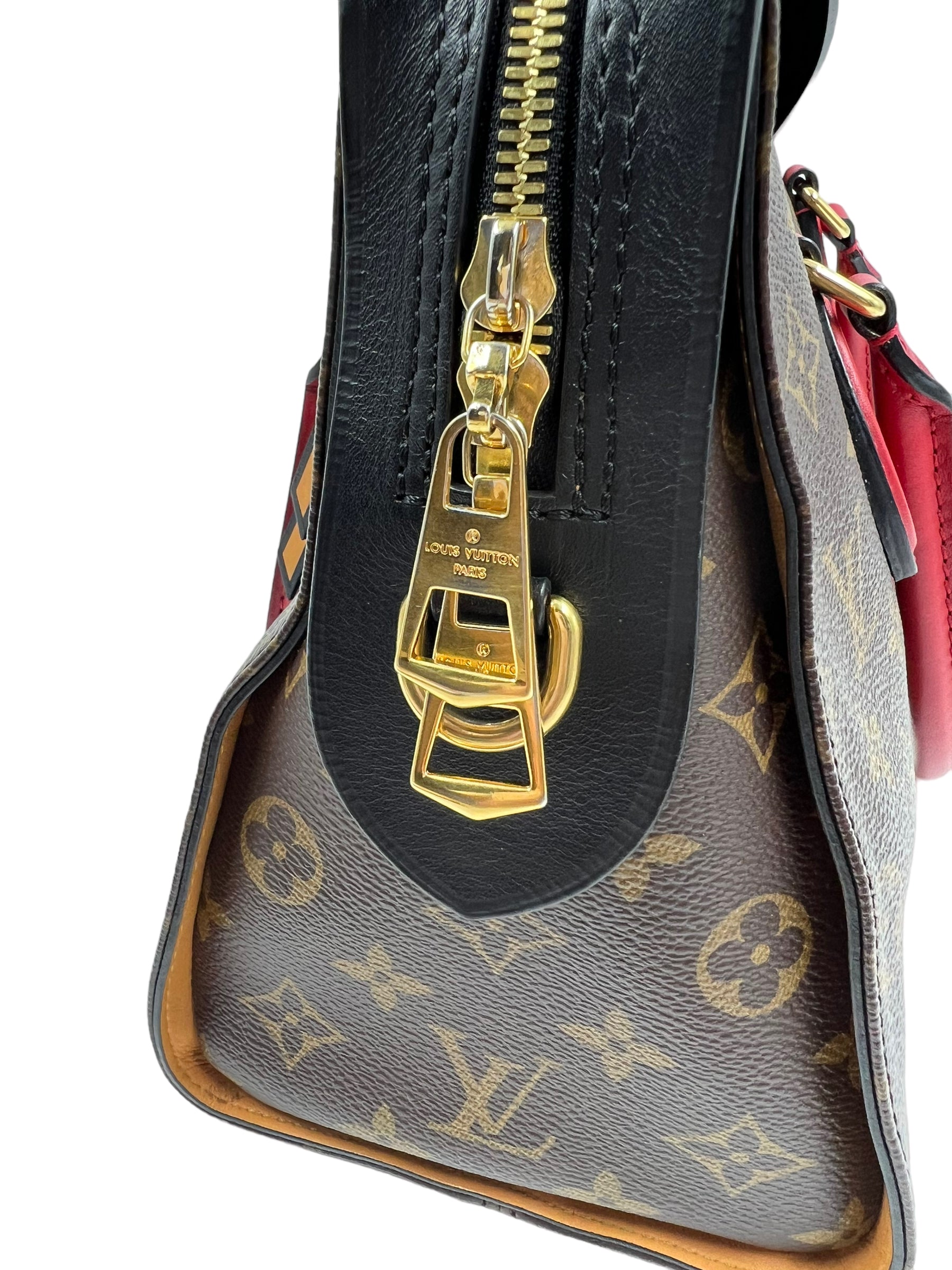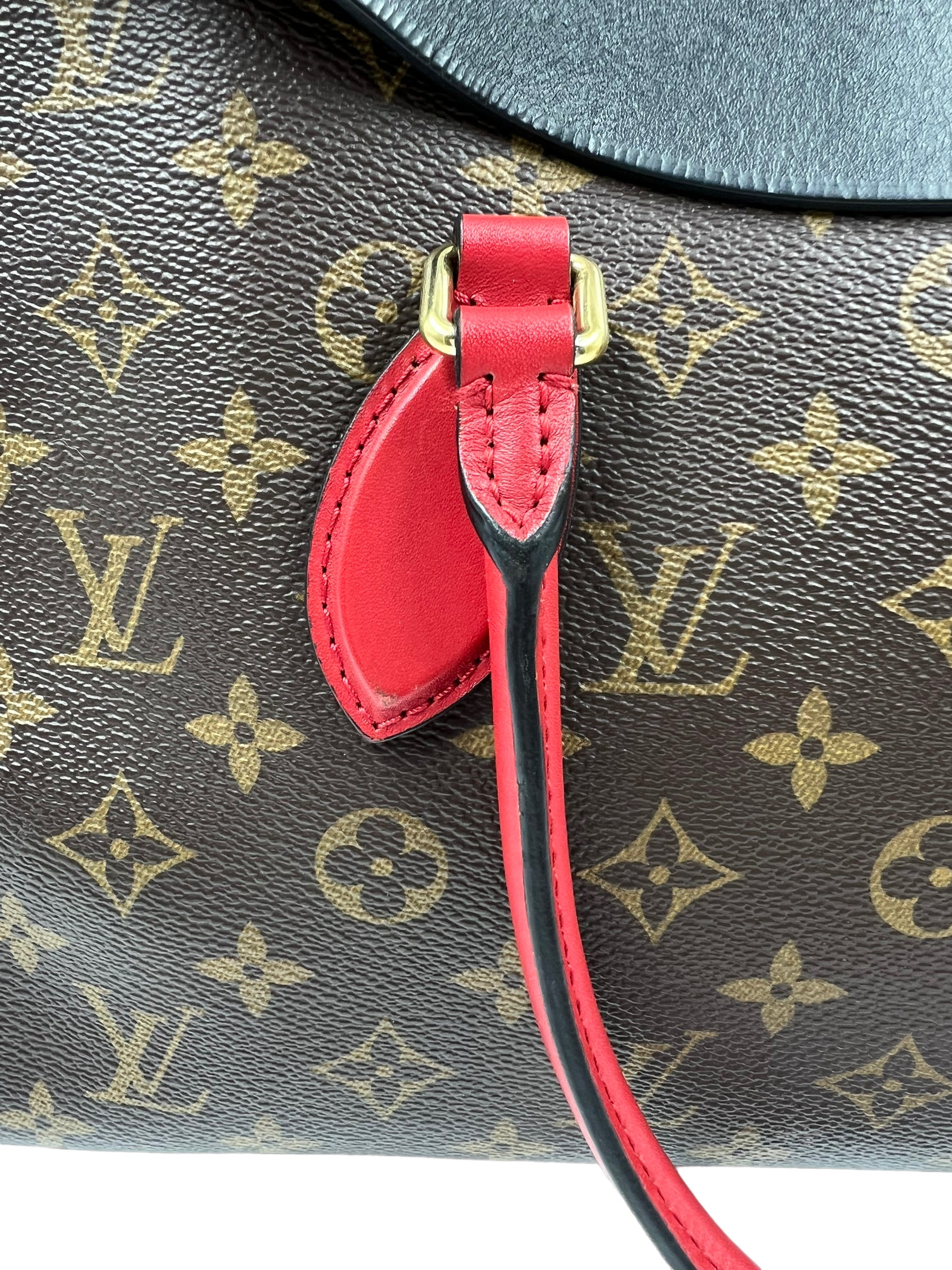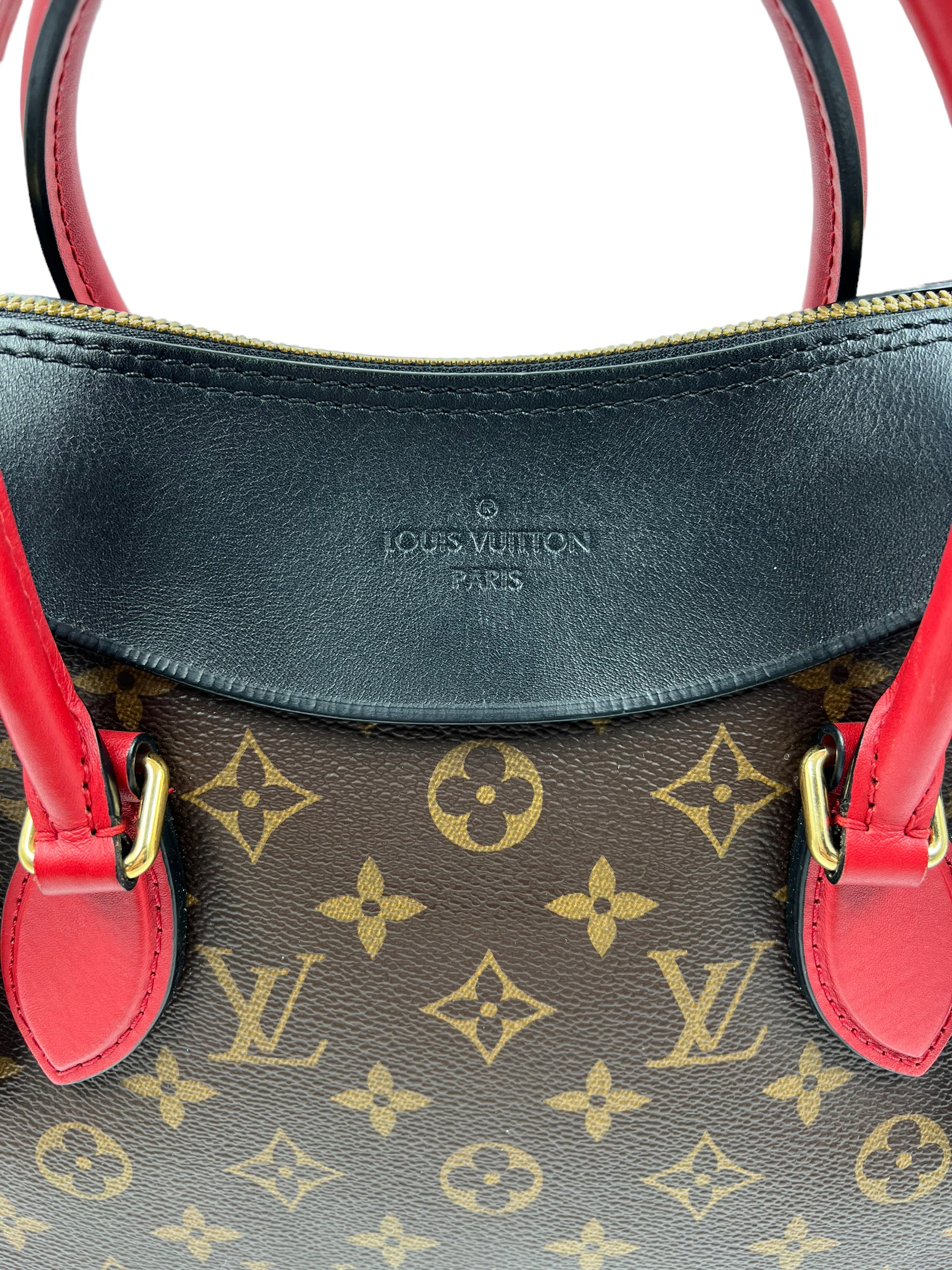 Monogram Tuileries handbag with gold hardware and detachable long strap. Features red and tan leather trim/detail, exterior zip pocket and three interior slip pockets. Does not come with dust bag or box.
