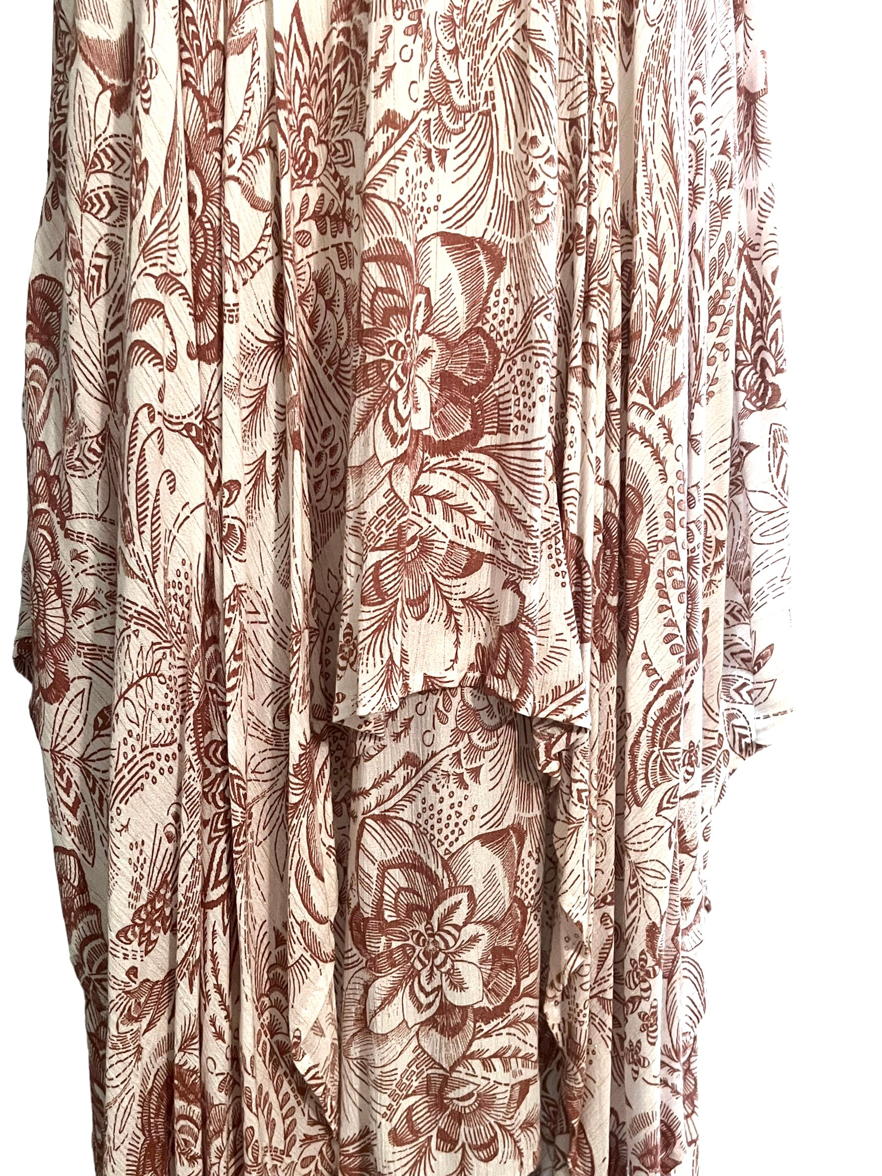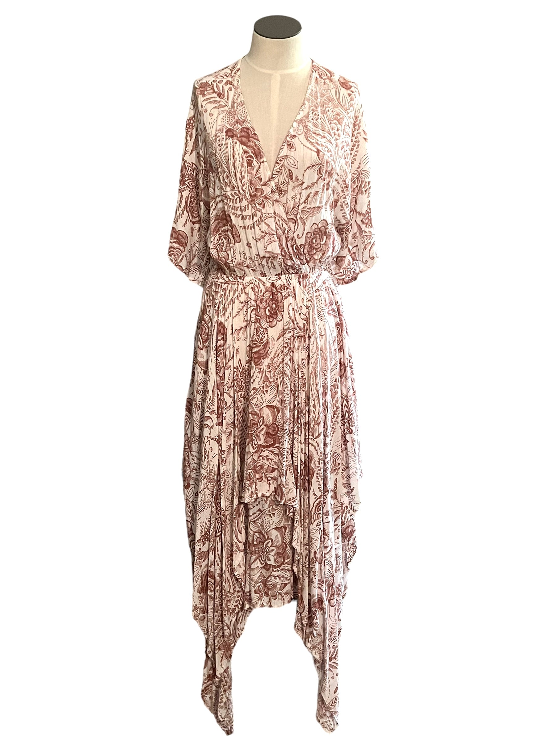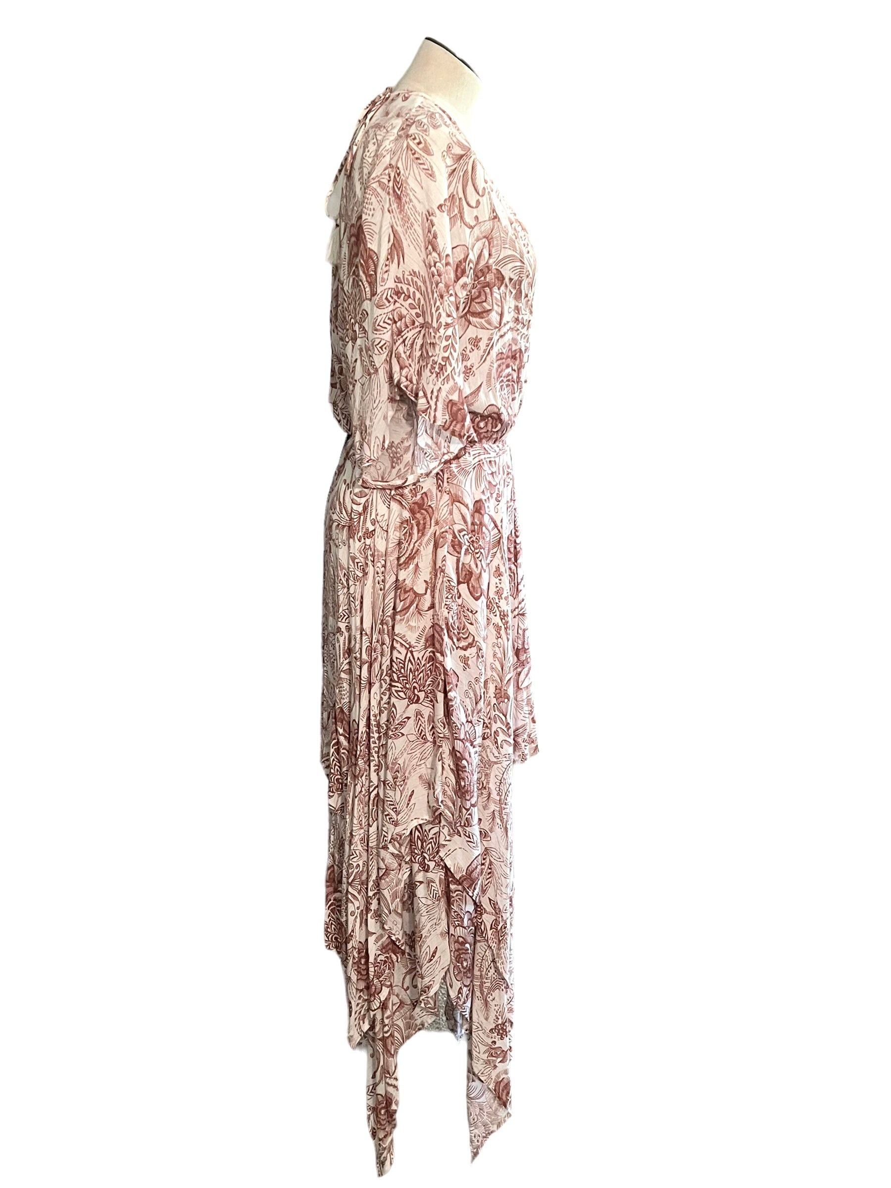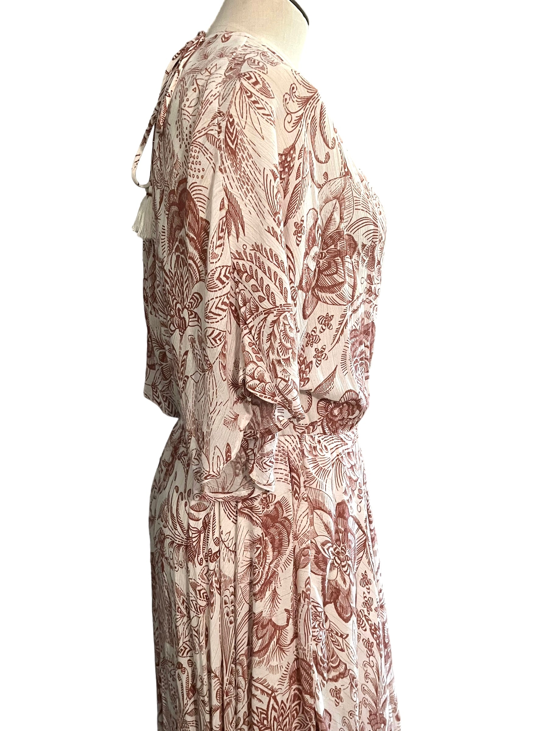 Cream and tan print dress with gold metallic stripe detail, tassel tie and layered skirt/hem.